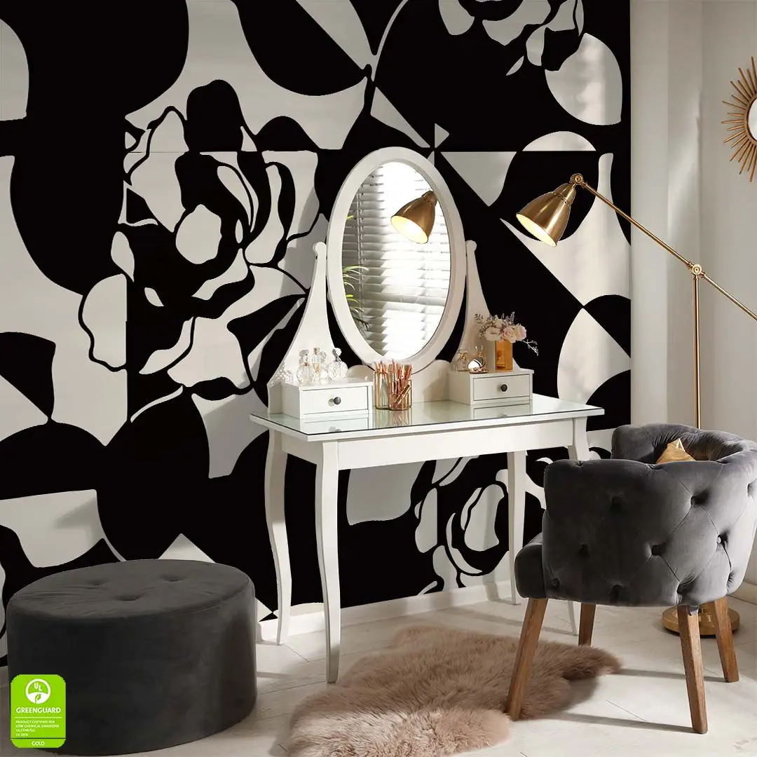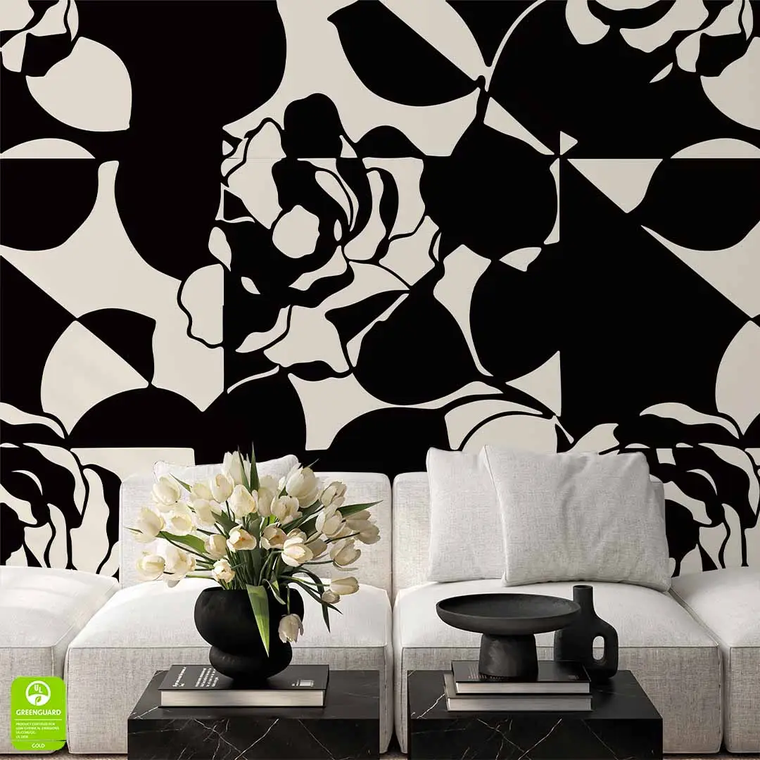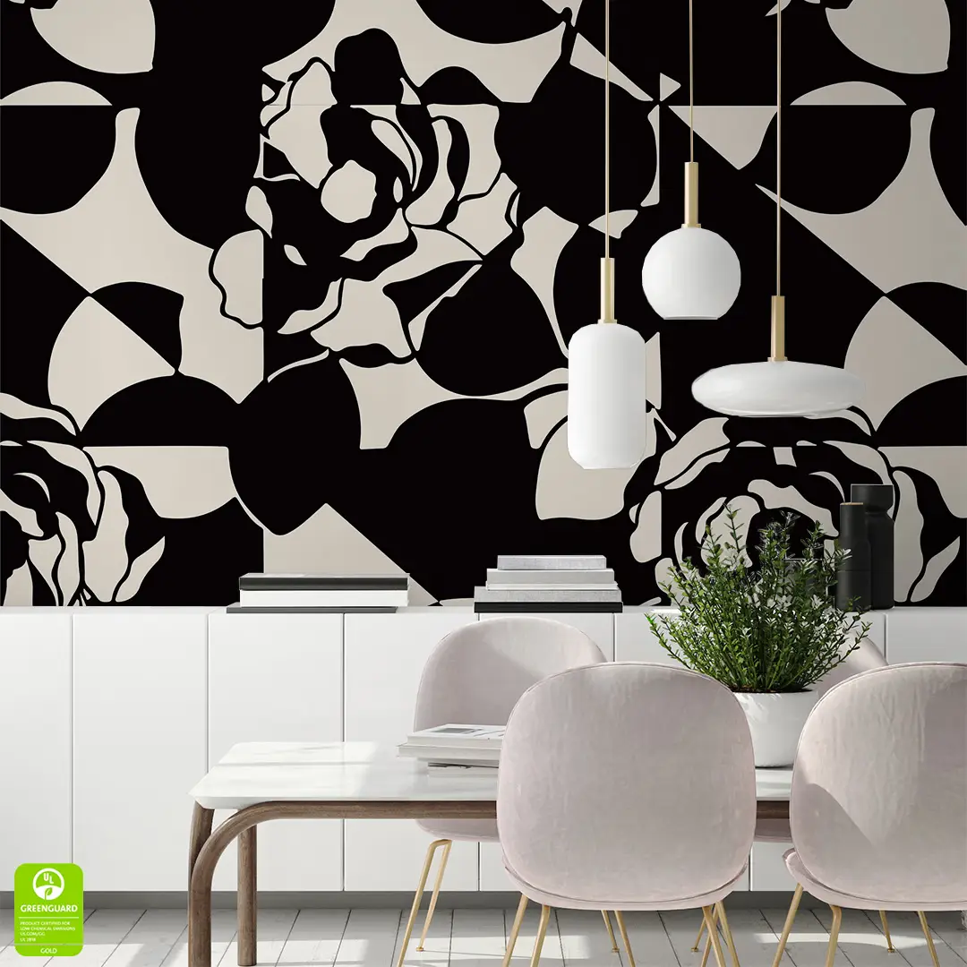 Fototapeta na wymiar - Abstrakcyjna Róża Czarno-Beżowa to propozycja dla osób, które szukają wyrazistych i artystycznych rozwiązań do swojego wnętrza. Wzór łączy w sobie nowoczesną geometrię z miękkimi liniami kwiatów, tworząc intrygujący efekt wizualny na ścianie. Dzięki kontrastowej kolorystyce czerni i ciepłego beżu, dekoracja nadaje pomieszczeniu głębi, nie przytłaczając go nadmiarem szczegółów. To idealny wybór do nowoczesnej jadalni lub biura, gdzie liczy się styl, porządek i elegancja.
