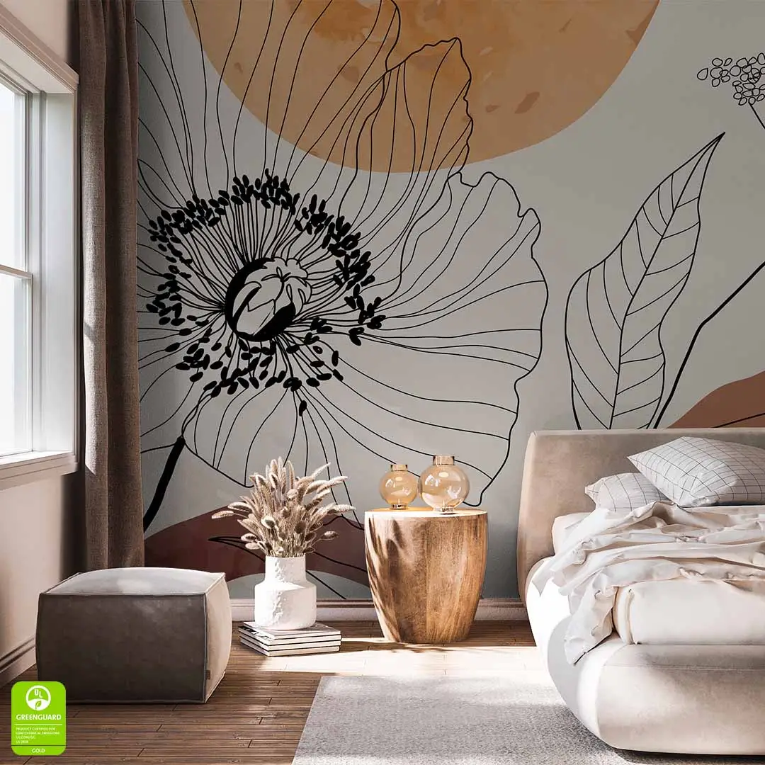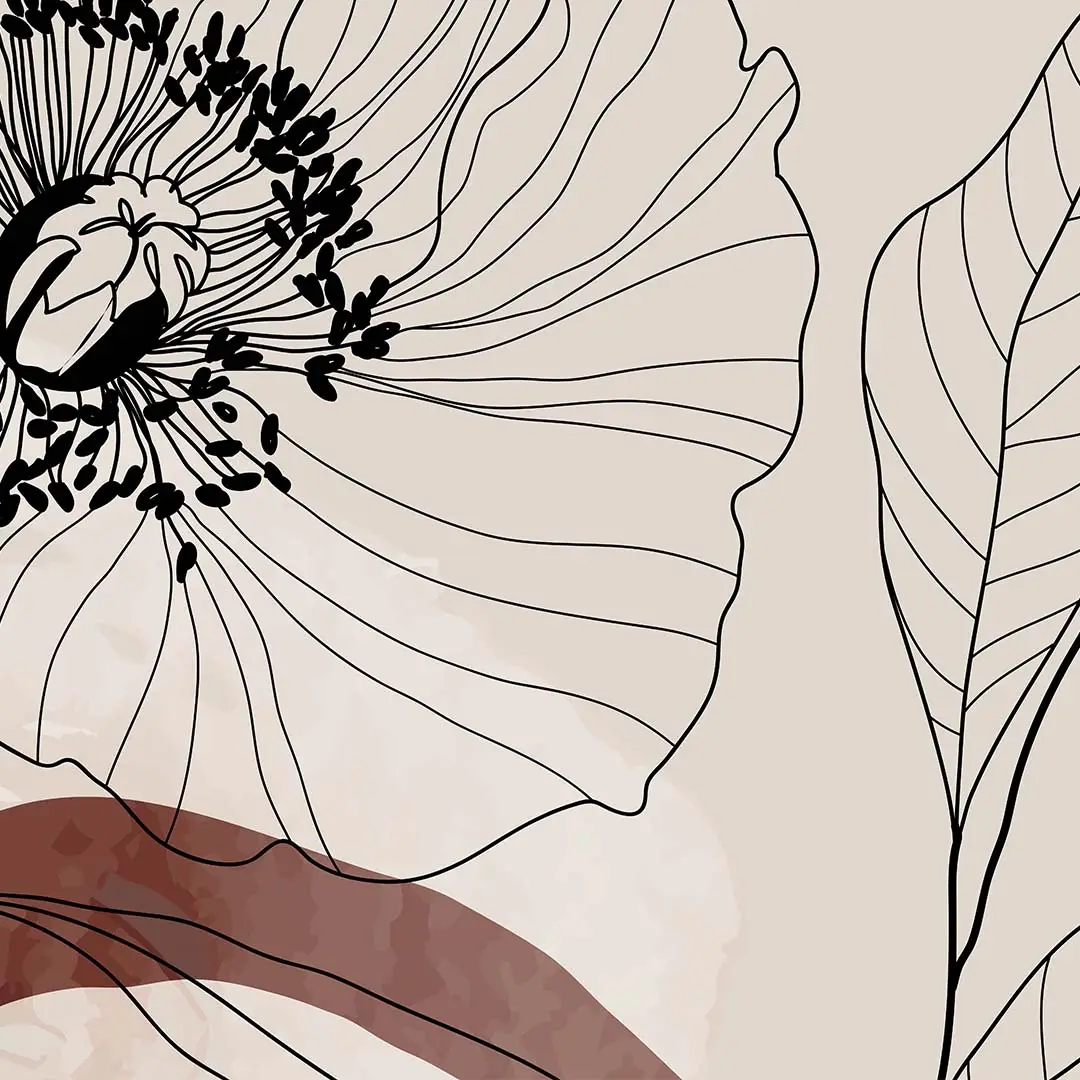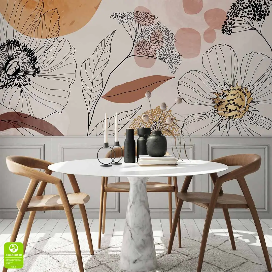 Fototapeta na wymiar - Abstrakcyjne Kwiaty to połączenie nowoczesnej grafiki liniowej z miękkimi, organicznymi kształtami w tle. Wzór przedstawia subtelnie zarysowane kontury polnych kwiatów i liści, które przenikają się z pastelowymi plamami barwnymi. Dzięki swojej lekkiej formie i nienachalnej estetyce, dekoracja ta stanowi doskonałe tło dla nowoczesnej jadalni lub kreatywnego salonu, nadając im indywidualny, artystyczny rys.