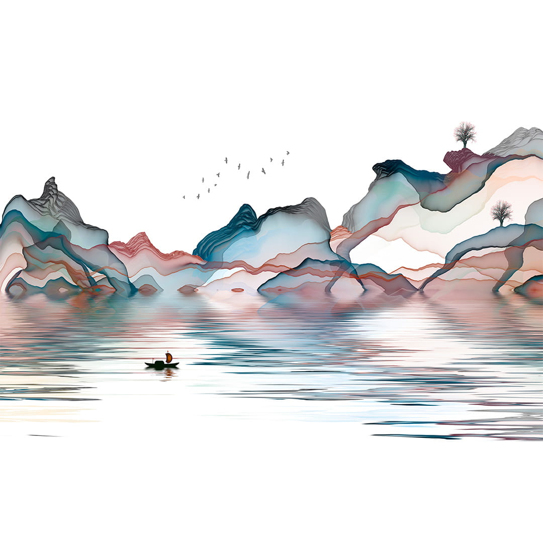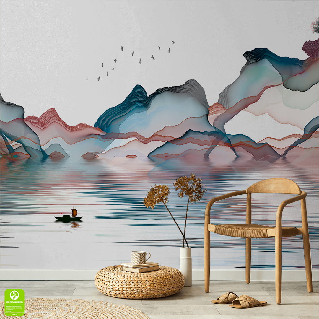 Fototapeta na wymiar: Abstrakcyjne Wybrzeże, Akwarela – Nowoczesny Krajobraz z Łódką – Styl Nowoczesny, Minimalistyczny do Salonu, Sypialni