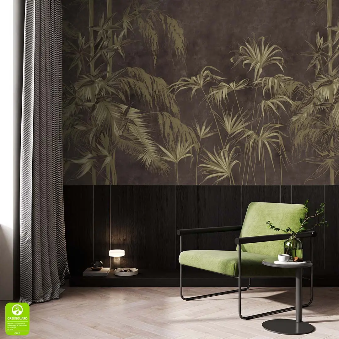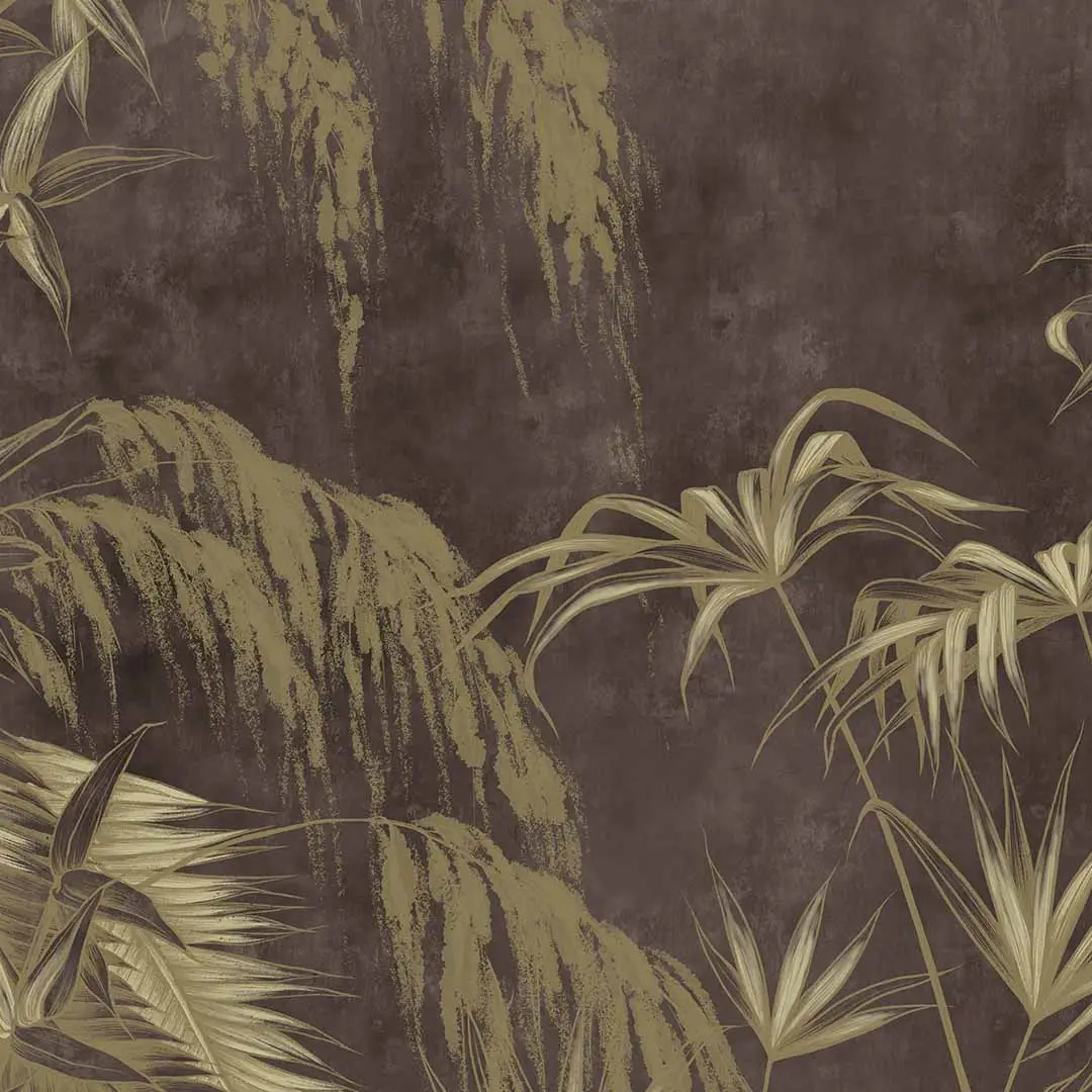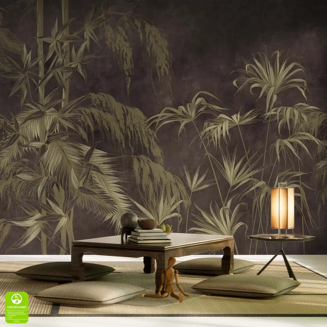Fototapeta na wymiar - Bambus na Ciemnym Tle to propozycja dla osób szukających dekoracji z "duszą". Głęboki, czekoladowy brąz tła wprowadza do sypialni lub salonu aurę intymności i spokoju, a beżowe sylwetki liści bambusa dodają całości lekkości. To zestawienie kolorystyczne sprawia, że wnętrze staje się przytulne, a jednocześnie bardzo wyrafinowane. Ten tropikalny motyw w stonowanym wydaniu pozwoli Ci stworzyć w domu elegancką enklawę sprzyjającą relaksowi po całym dniu