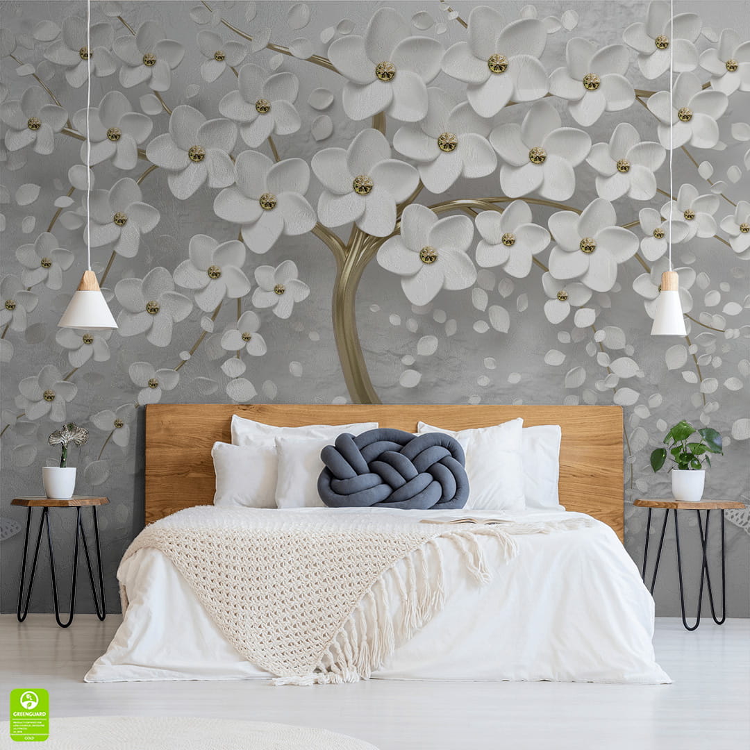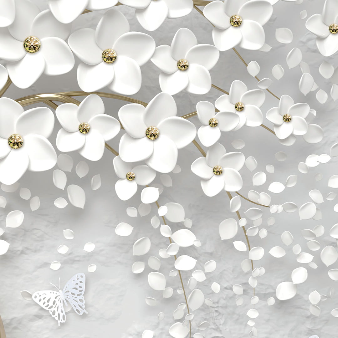 Fototapeta na wymiar: Białe Drzewo z Kwiatami 3D i Motylami – Elegancki motyw biżuteryjny, Styl Glamour i Nowoczesny, Pień w kolorze złota, Do salonu i sypialni