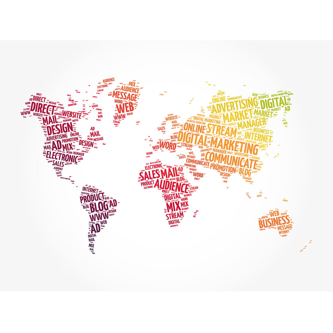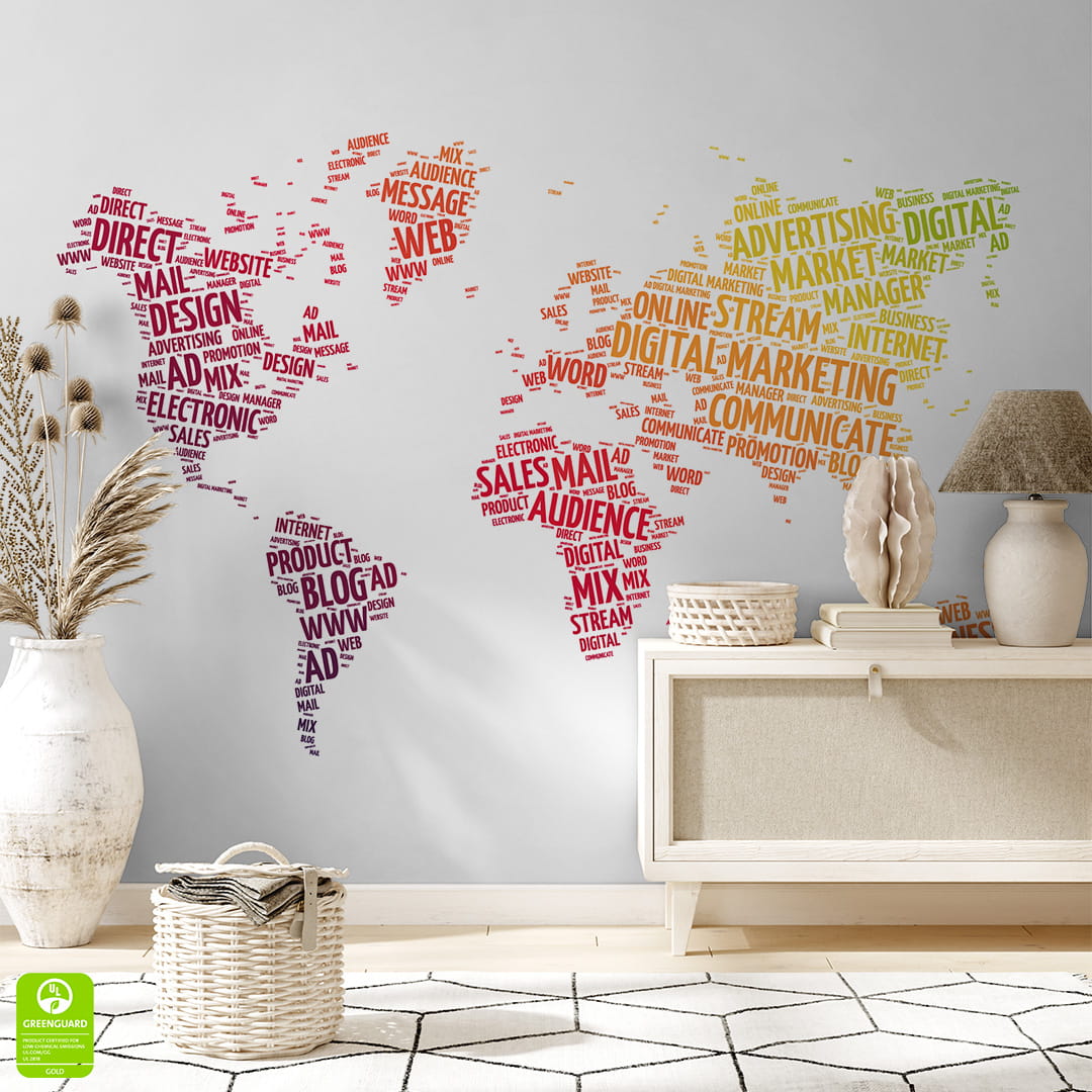 Fototapeta na wymiar: Biznesowa Mapa Świata z Napisów – Kolorowa Typografia, Styl Skandynawski, Nowoczesny, do Gabinetu i Biura