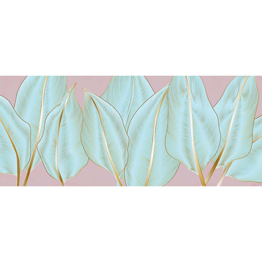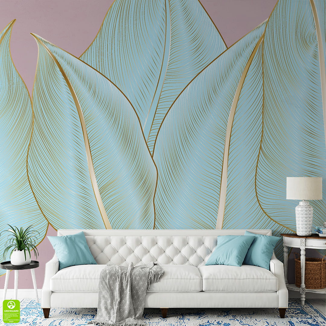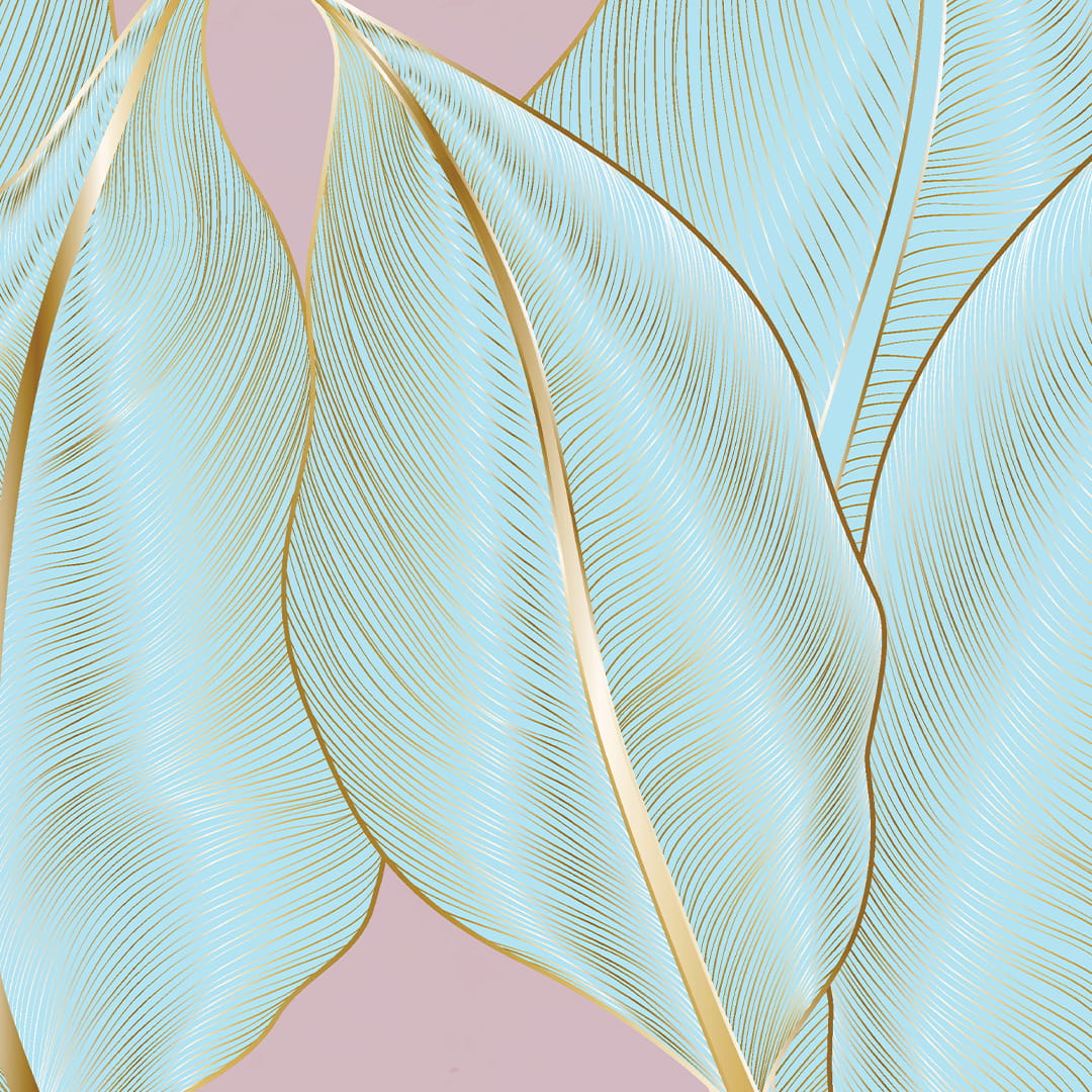 Fototapeta na wymiar: Błękitne Liście Bananowca - Detale w kolorze złota, Pastelowe Tło, do Jasnego Salonu, Styl Glamour i Nowoczesny