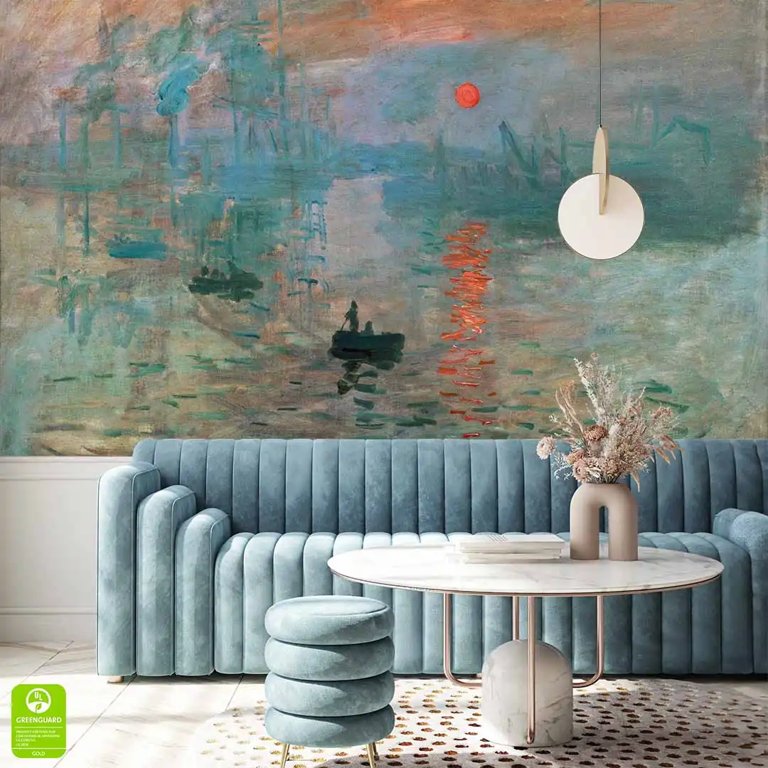 Fototapeta - Claude Monet - Impresja, wschód słońca - Reprodukcja to propozycja dla miłośników dzieł sztuki i piękna! Fototapeta jest reprodukcją słynnego dzieła Claude Moneta Impression, Sunrise (1872 rok), od tytułu którego nazwano cały kierunek w malarstwie - impresjonizm. Obraz olejny, tutaj w formie drukowanej, wielkoformatowej dekoracji ściennej, przedstawia zatokę portową w mieście Hawr o świcie, gdy słońce wschodzi nad horyzontem. Mglista atmosfera, rozproszone światło i niewyraźne kontury tego dzieła sprawiają, iż emanuje spokojem, zachęcając do zadumy. Taką atmosferę wytchnienia ma również szansę wprowadzić nasza fototapeta. Oryginalne dzieło można podziwiać w Muzeum Marmottan Monet w Paryżu. Kolorystyka tej fototapety jest niezwykle subtelna, wręcz uspokajająca. Dominują tutaj różne odcienie koloru niebieskiego, z niewielkimi dodatkami kolorystycznymi widocznymi na niebie i słońcu. Fototapeta sprawdzi się zarówno w salonie, sypialni, jadalni czy na przykład w biurze i będzie pasować do wielu stylów wykończenia wnętrz.