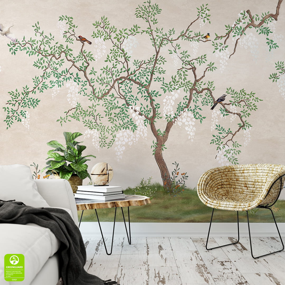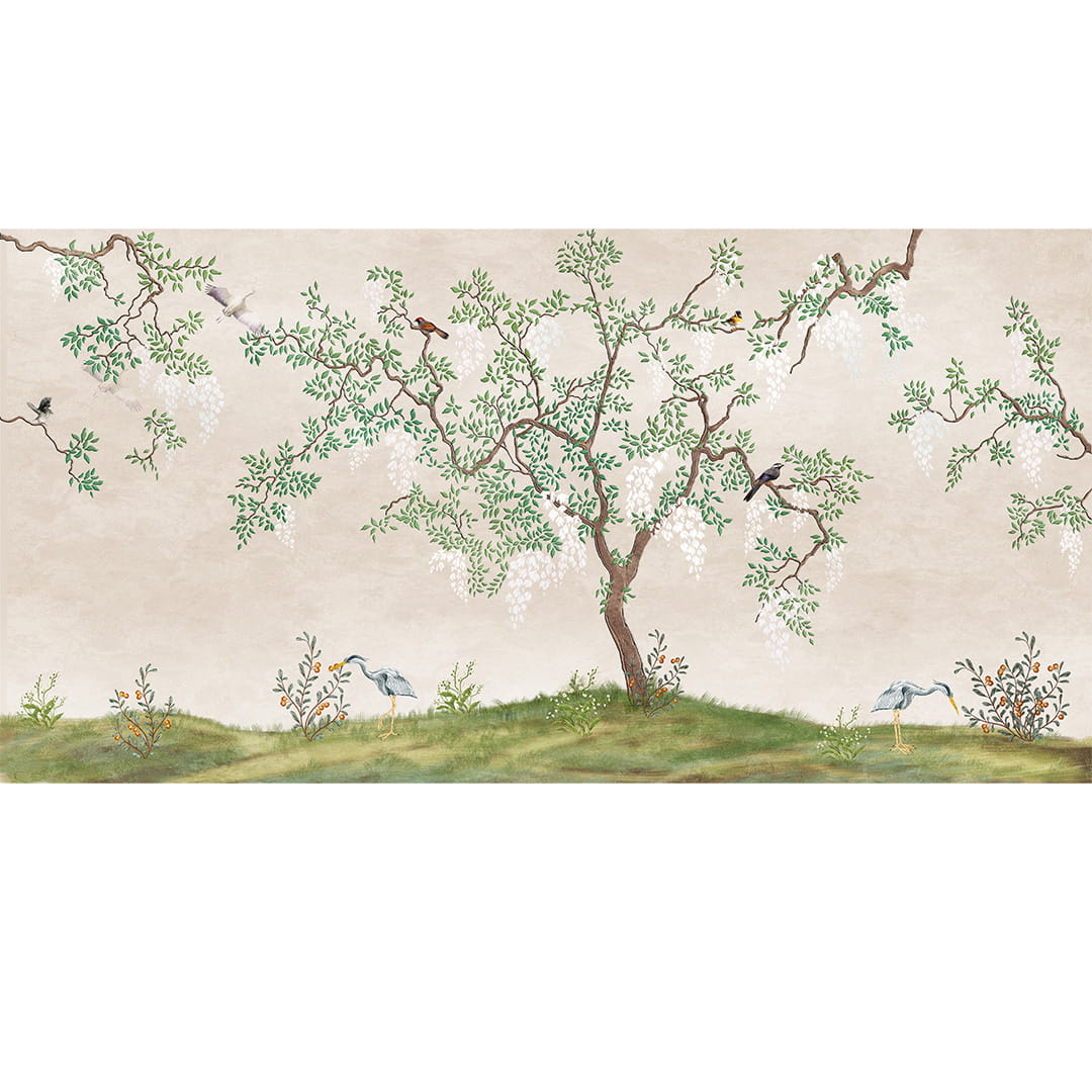 Fototapeta na wymiar: Drzewo z Ptakami w Ogrodzie Japońskim – Styl orientalny, Pastelowe tło, Elegancki salon i sypialnia, Beżowo-Zielona