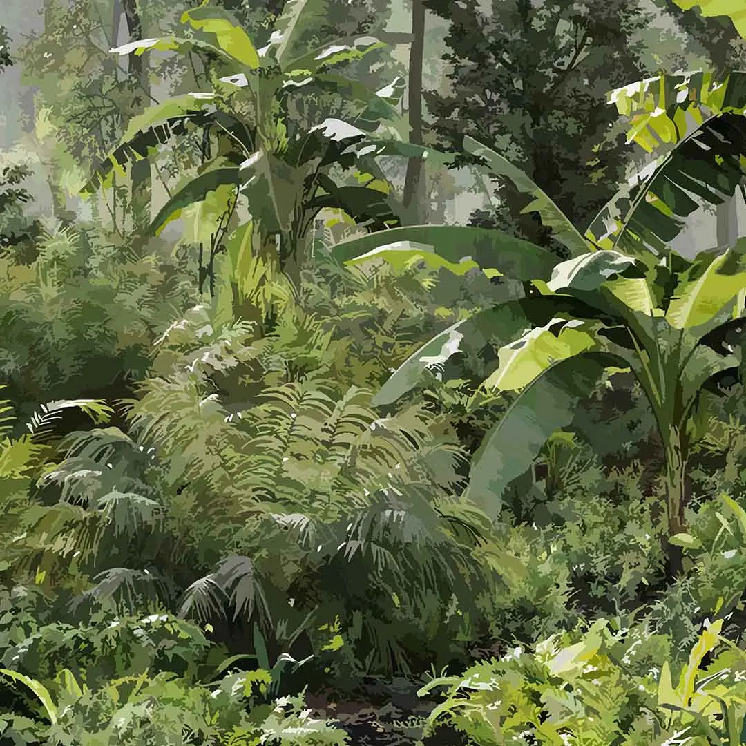 Fototapeta na wymiar - Dzika Dżungla to sposób na wprowadzenie energii i życia do Twojego domu. Wzór przedstawia niezwykle realistyczny widok gęstego lasu deszczowego, pełnego różnorodnych liści, paproci oraz palm. Dzięki bogactwu detali i naturalnej perspektywie, dekoracja ta tworzy wrażenie otwartego okna na egzotyczny ogród.