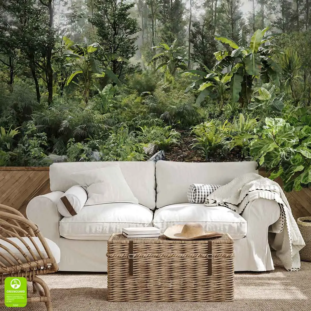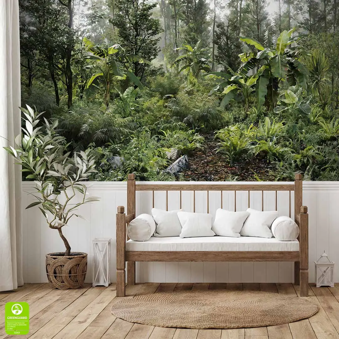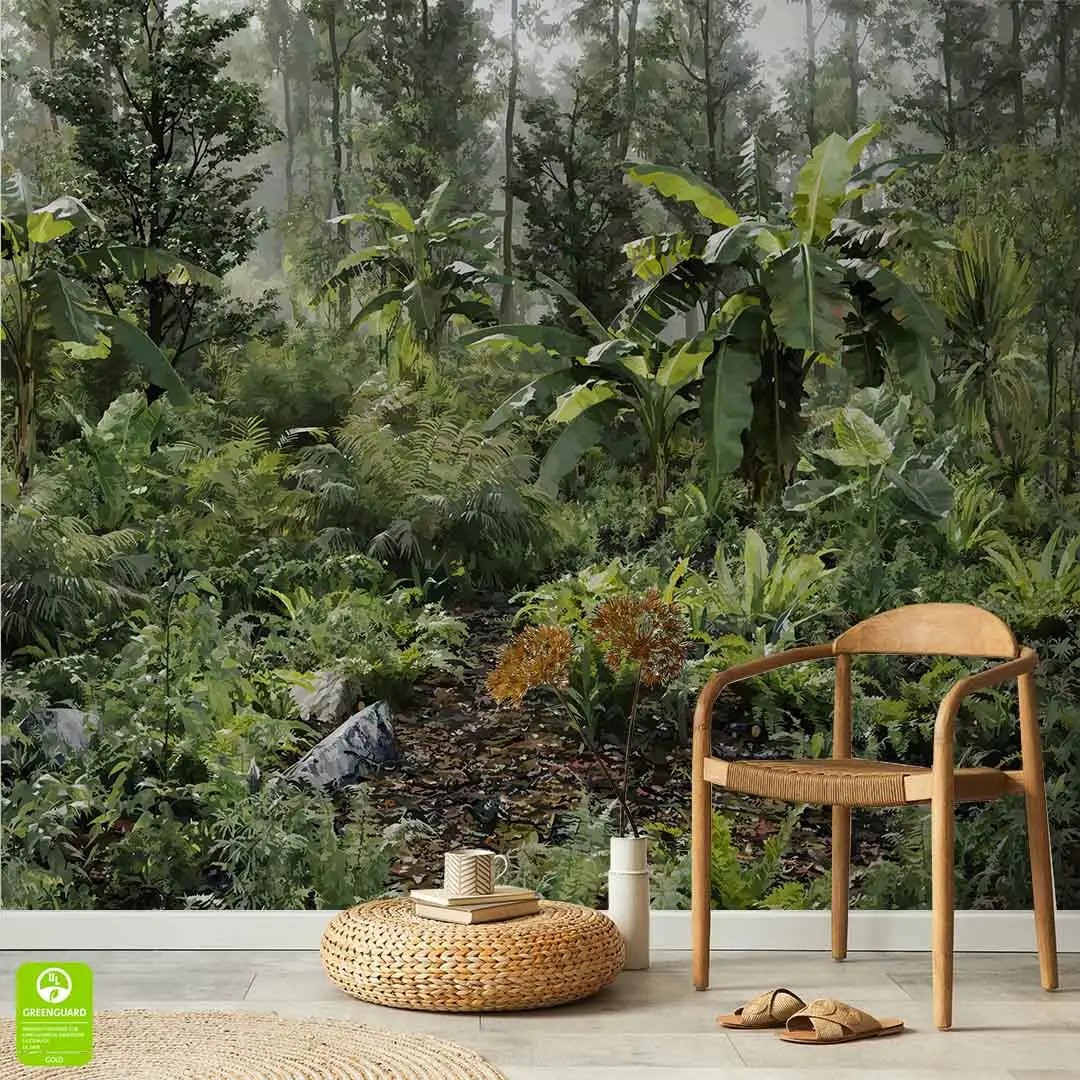Kolorystyka opiera się na całej palecie soczystych zieleni – od jasnych odcieni młodych liści po głębokie barwy leśnego gąszczu. Taka kompozycja działa odświeżająco na umysł i pomaga się zrelaksować po długim dniu. Fototapeta idealnie pasuje do salonów, w których dominuje drewno i naturalne materiały, tworząc prywatną oazę spokoju.