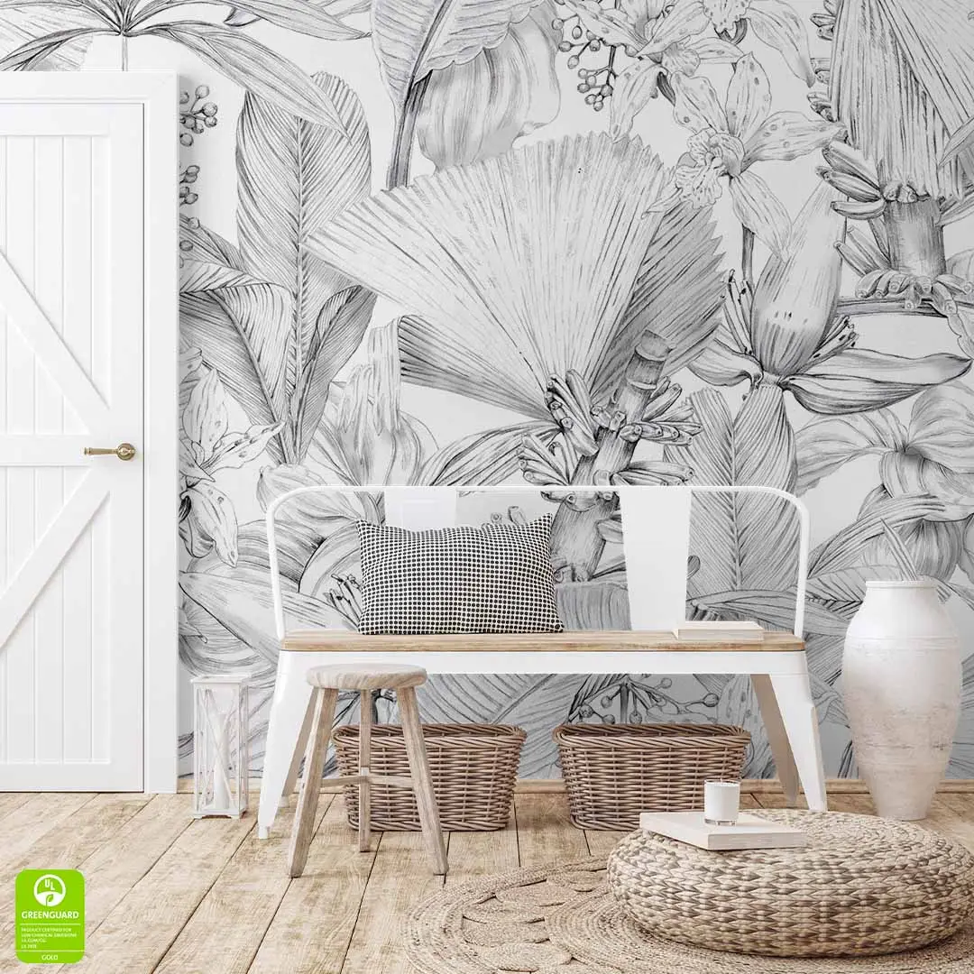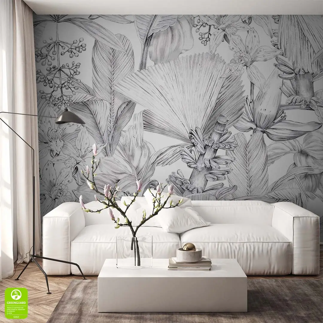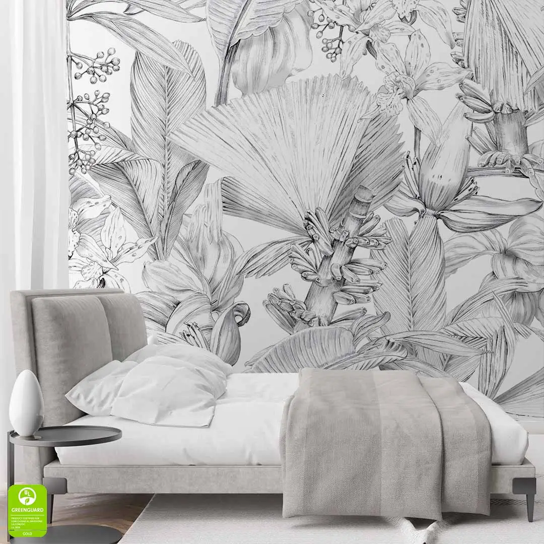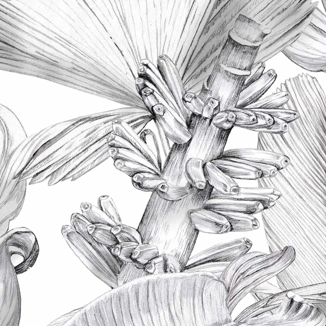 Fototapeta na wymiar - Egzotyczny Szkic Roślinny to propozycja dla miłośników minimalizmu i nowoczesnego designu. Wzór przedstawia bujną roślinność dżungli, bananowce i egzotyczne kwiaty, ujęte w formie precyzyjnego, czarno-białego rysunku. Dzięki rezygnacji z kolorów, motyw ten staje się niezwykle lekki i nie przytłacza wnętrza, dodając mu jednocześnie unikalnego, artystycznego charakteru.