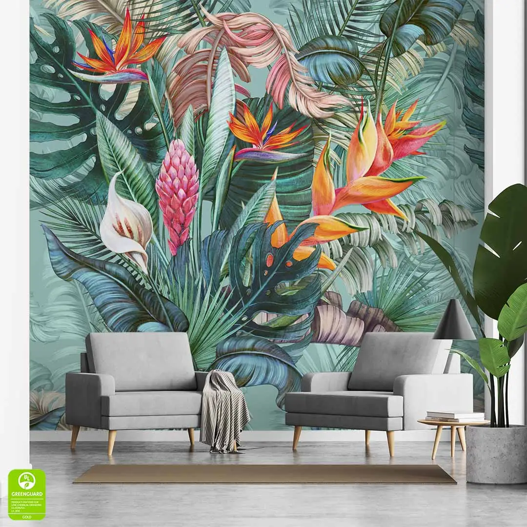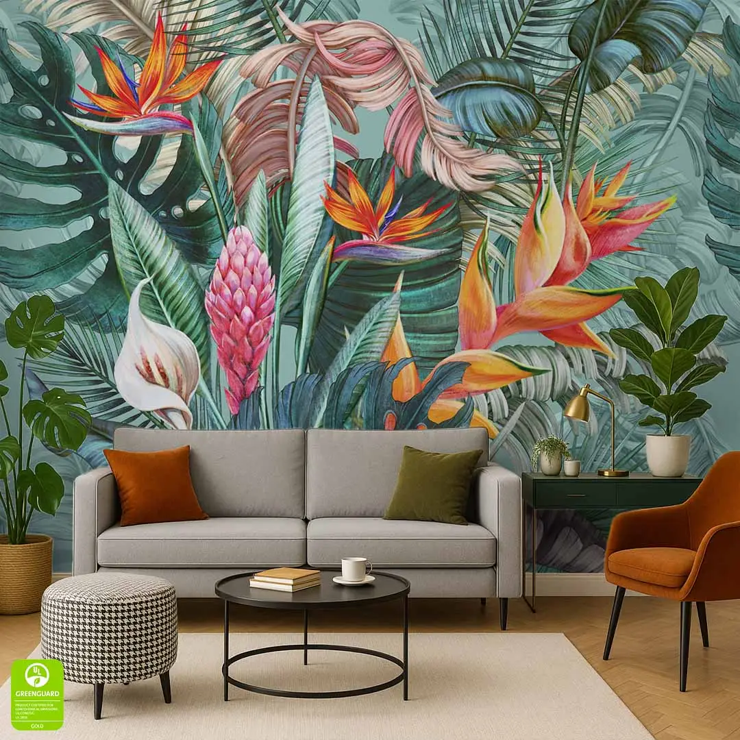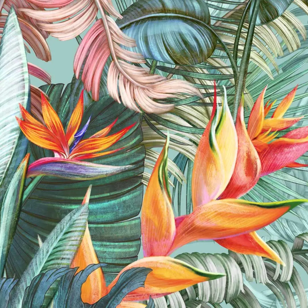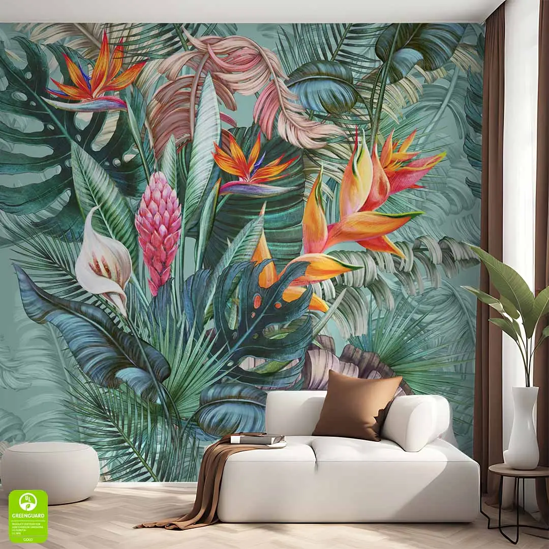 Fototapeta na wymiar - Egzotyczny ogród – Kolorowa dżungla do salonu, styl tropikalny i nowoczesny, kwiaty strelicji, energetyczna dekoracja ścienna