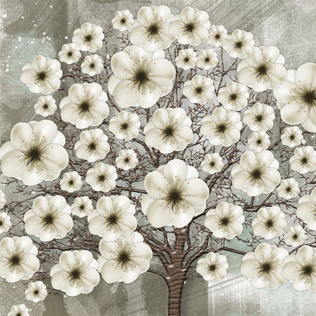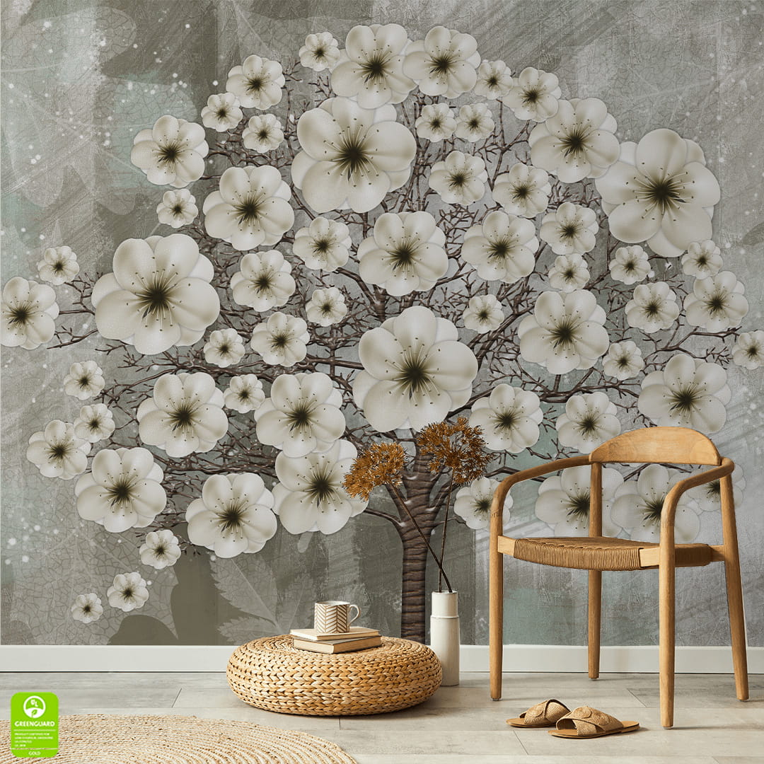 Fototapeta na wymiar: Kwitnące Drzewo 3D – Białe Kwiaty, Szary Beton, Styl Nowoczesny i Skandynawski do Salonu i Sypialni