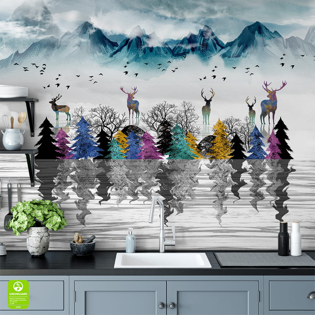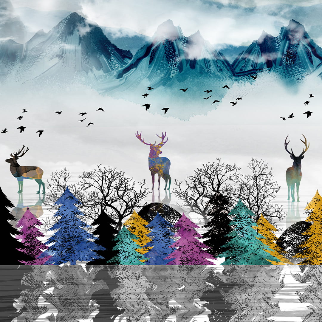 Designerska fototapeta na ścianę "Piękne kolorowe choinki z jeleniami w tle"