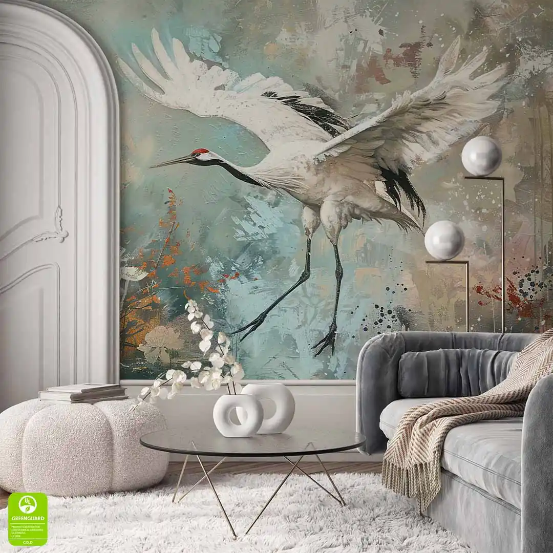 Fototapeta na wymiar: Majestatyczny biały żuraw w locie - ta wyjątkowa dekoracja ścienna wprowadza do wnętrza niezwykły balans pomiędzy chłodnymi odcieniami błękitu a ciepłymi, piaskowymi beżami tła. Malarska kompozycja z majestatycznym białym żurawiem emanuje spokojem i energią wolności, tworząc w pomieszczeniu aurę luksusowego ukojenia oraz artystycznego prestiżu. Wyraźne pociągnięcia pędzla i subtelne, rdzawe akcenty roślinne nadają całości szlachetnego charakteru, dzięki czemu ściana zyskuje głębię i autentyczny wygląd ręcznie wykonanego muralu. Ze względu na swoją unikalną formę i kolorystykę, wzór ten idealnie wpisuje się w założenia stylu klasycznego oraz nowoczesnego, doskonale współgrając z minimalistycznymi meblami, złotymi detalami i naturalnymi materiałami wykończeniowymi.