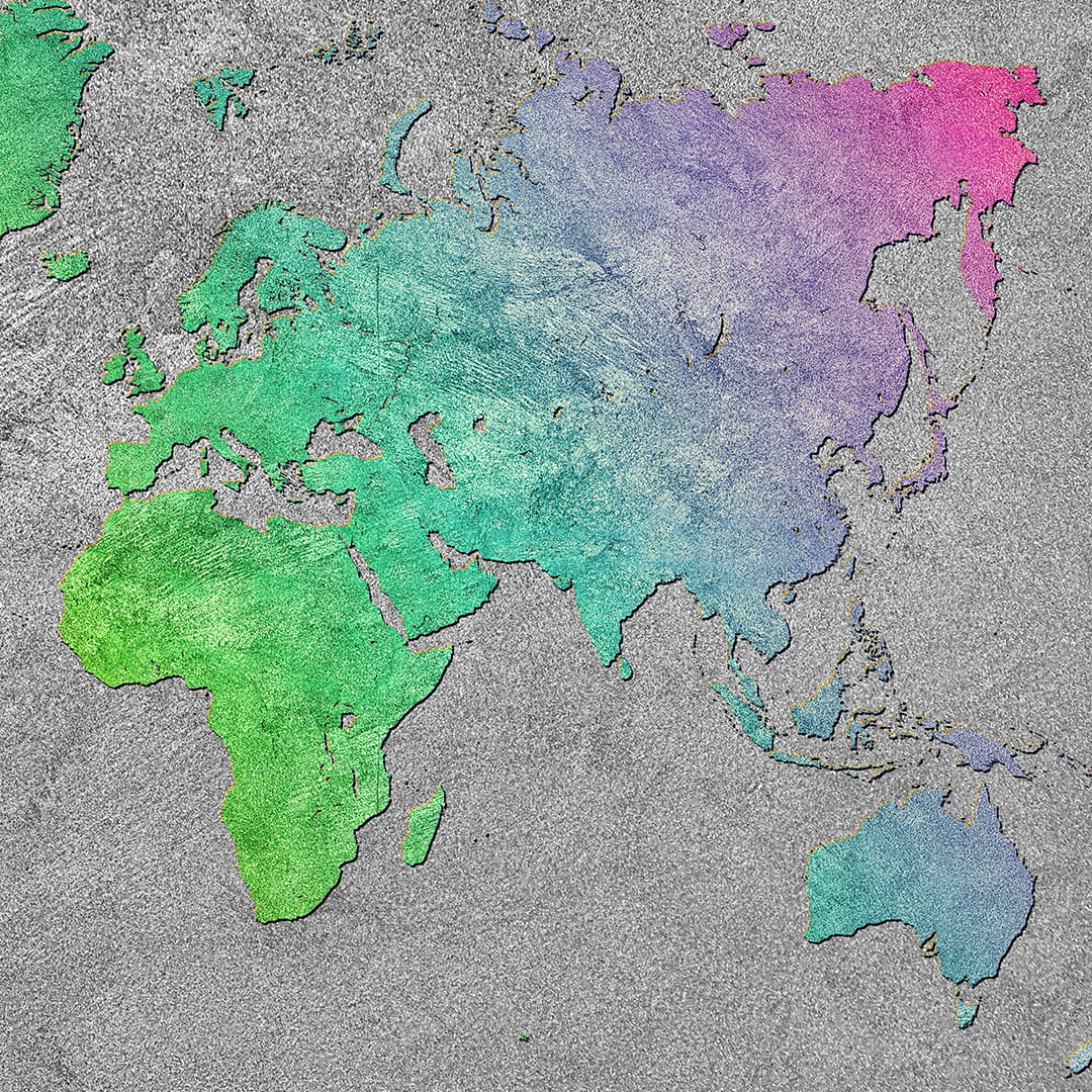 Fototapeta na wymiar: Mapa Świata na Betonie – Tęczowe Kontynenty, Styl Loft i Nowoczesny, do Salonu, Sypialni, Biura