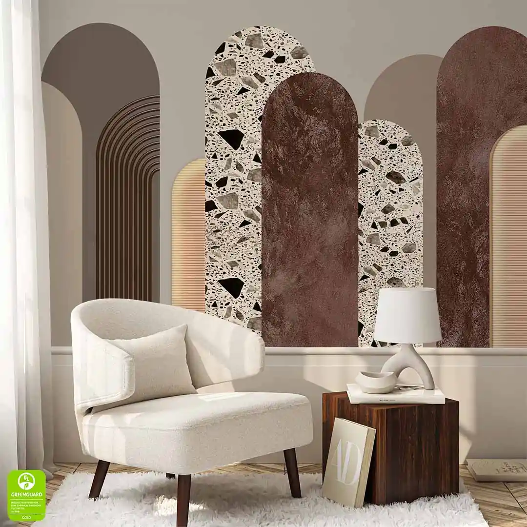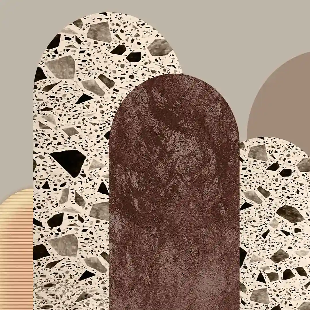 Fototapeta - Minimalistyczny mural 3d to ciekawa propozycja dla osób szukających niebanalnego wzoru do swojego wnętrza. Motyw przedstawia artystyczne, abstrakcyjne elementy przypominające półokrągłe kolumny z efektem głębi w kilku odcieniach beżu, brązu i szarości. We wzór wplecione są też elementu wzoru "terazzo". Może więc stanowić doskonałe uzupełnienie elementów lastriko w Twoim wnętrzu. Pomimo zastosowania dużego wzoru i barw motyw zaprezentowany jest raczej w stonowanych barwach. Dzięki wyrazistemu wzorowi może stać się główną atrakcją w salonie, sypialni, jadalni czy nawet klatki schodowej, a dzięki efektowi 3d może optycznie nieco powiększyć pomieszczenie.