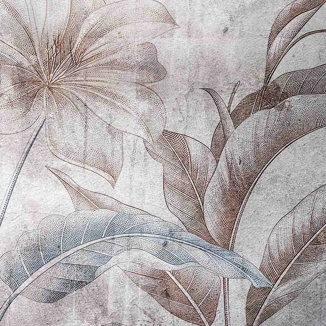 Fototapeta na wymiar – Nowoczesne kwiaty, szary beton, styl loft i boho do salonu i sypialni - industrialna dekoracja w roślinny wzór na tle betonu to idealny wybór dla osób szukających elegancji w nowoczesnym wydaniu. Ten wzór łączy surowość miejskiego stylu z delikatnością natury, tworząc wyjątkowy klimat w Twoim domu. Motyw przedstawia duże, subtelnie zarysowane liście i kwiaty na tle tekstury betonu, co nadaje wnętrzu głębi i artystycznego charakteru.