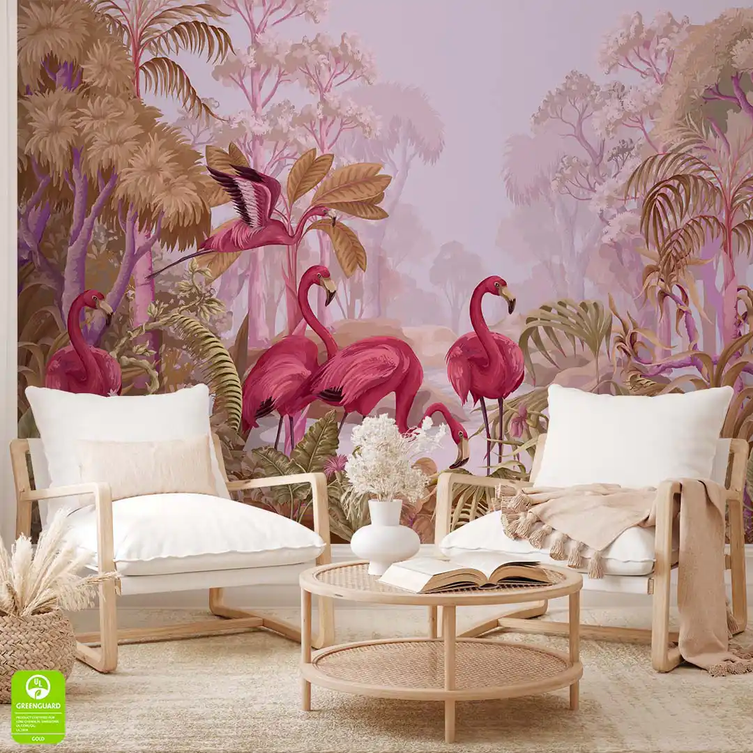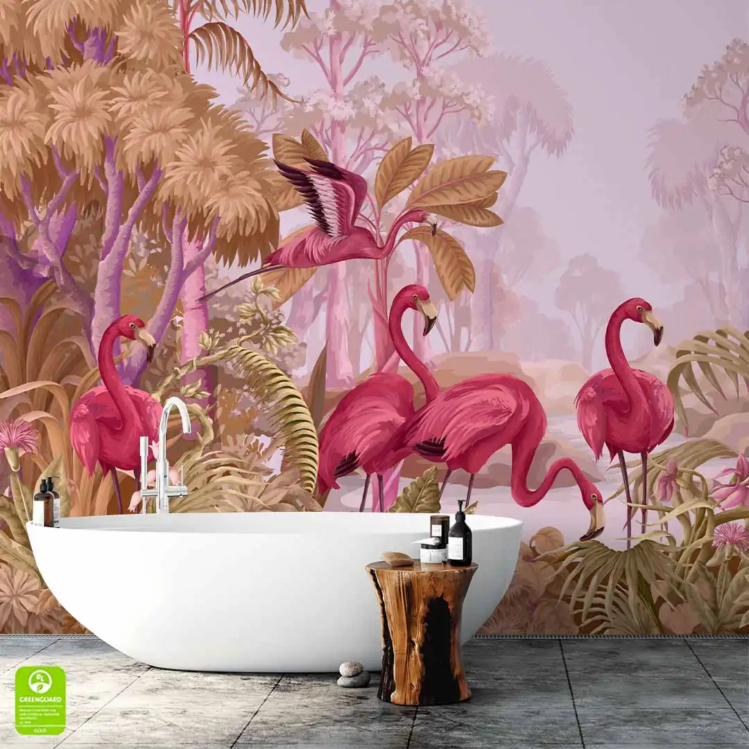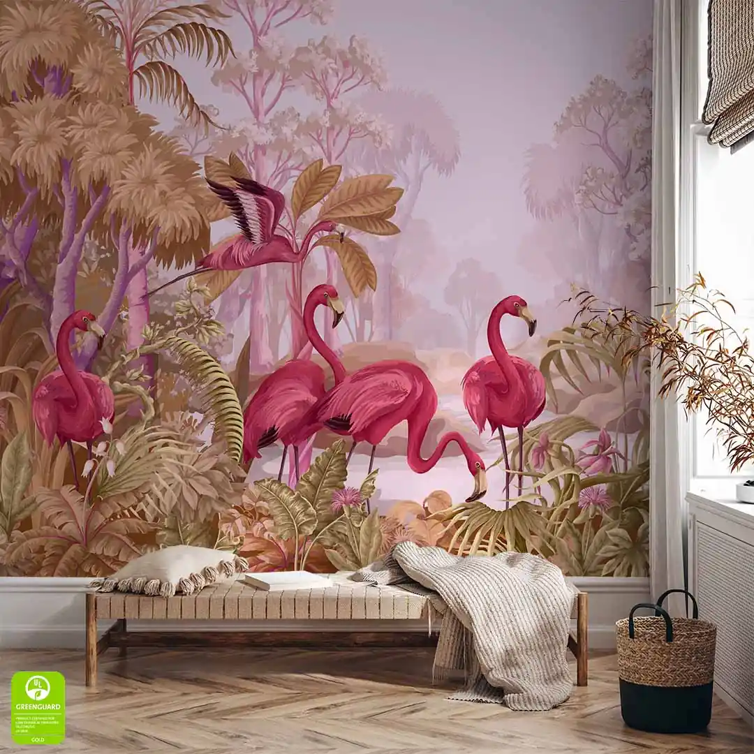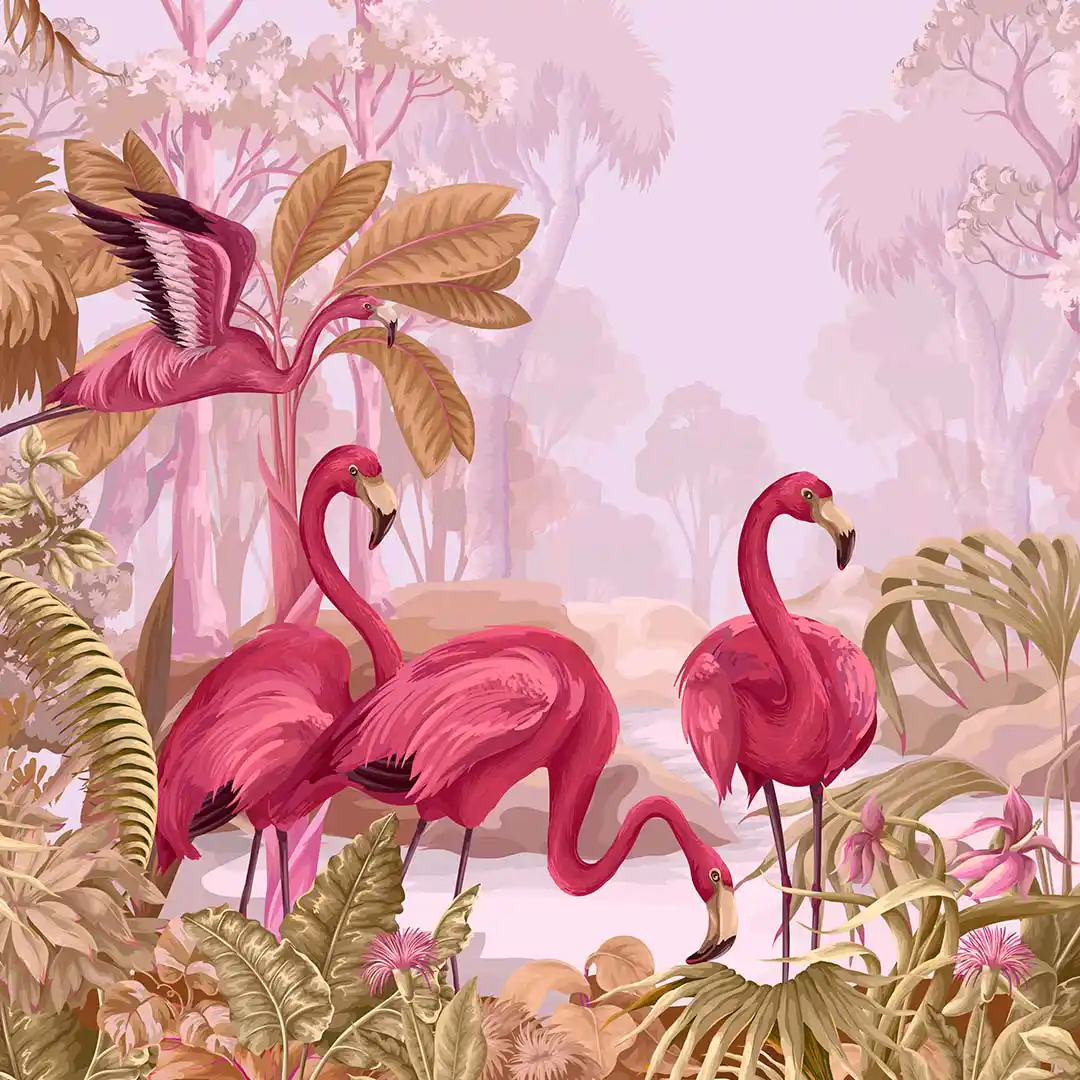 Designerska fototapeta na ścianę "Flamingi w tropikalnej zamglonej roślinności"