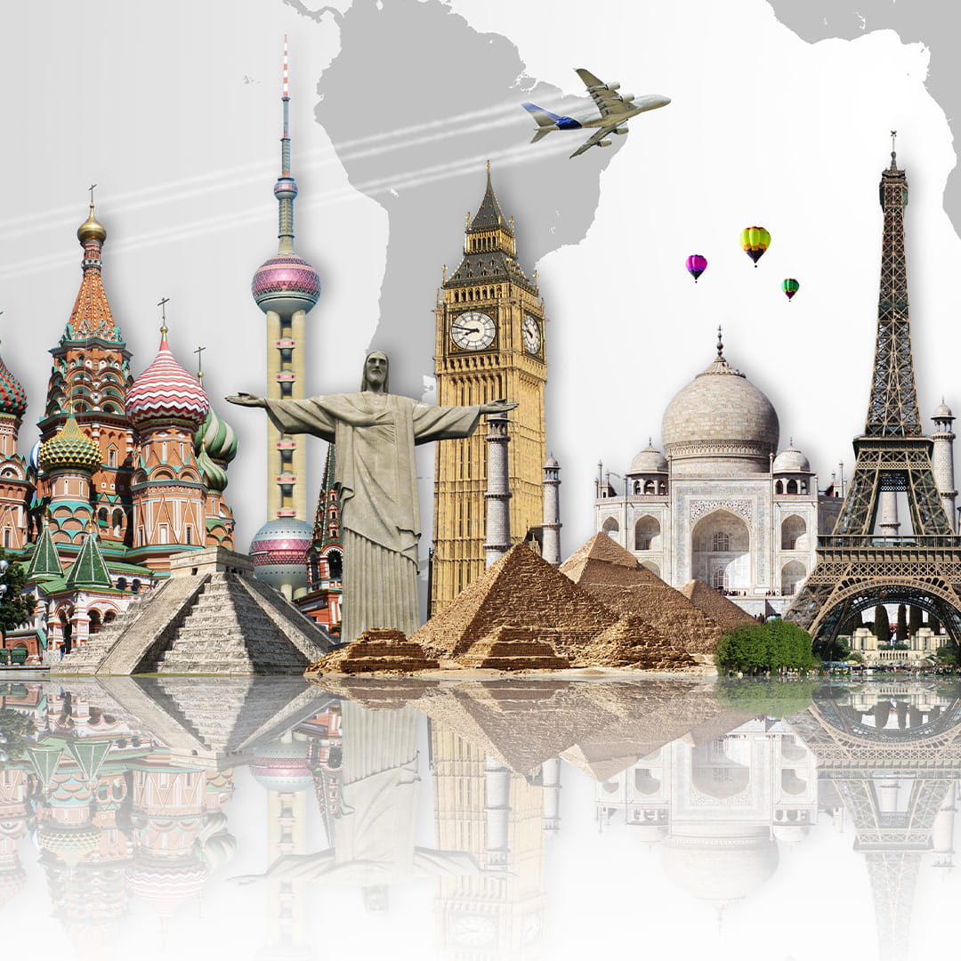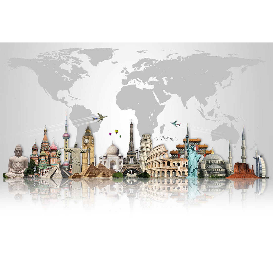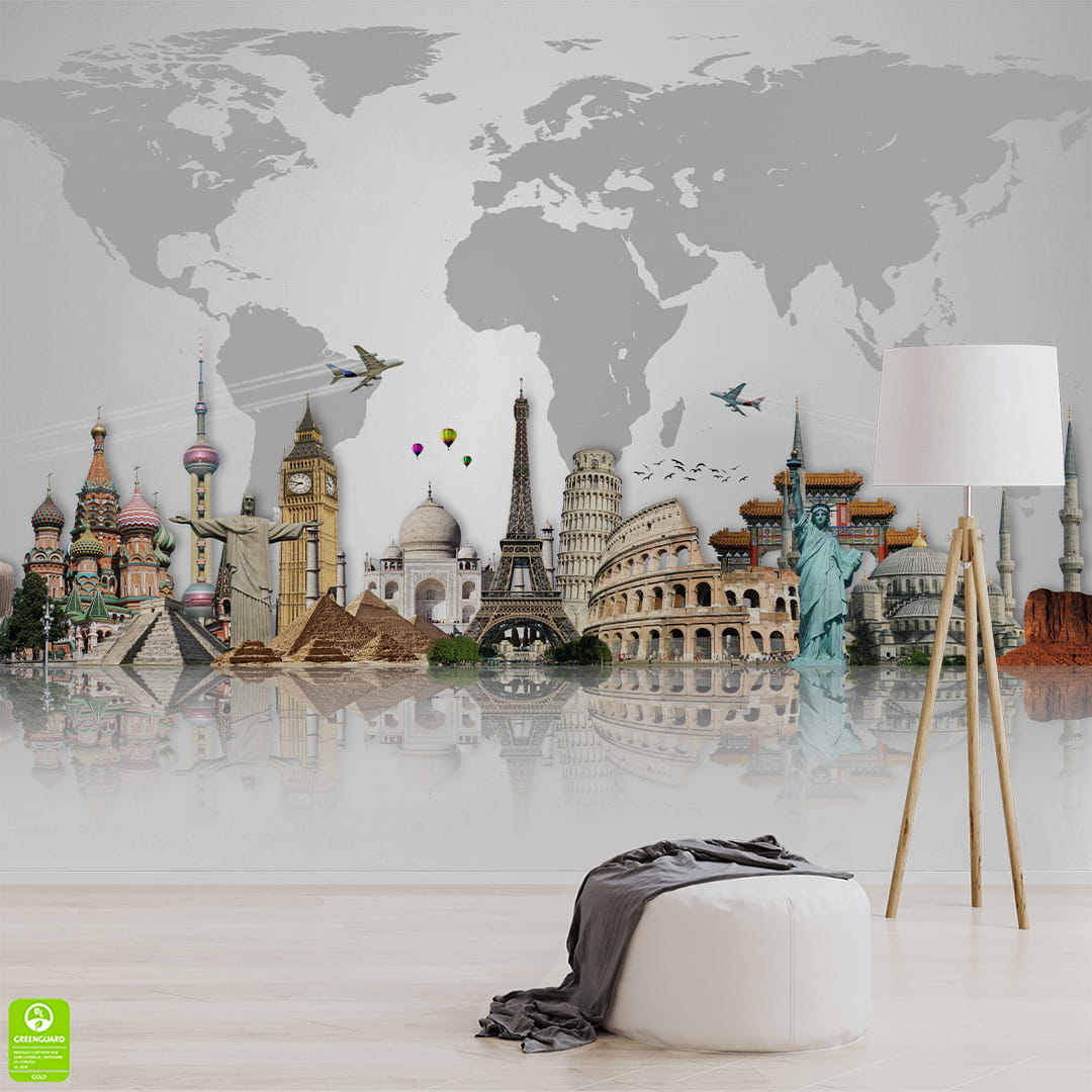 Designerska fototapeta na ścianę "Sławne zabytki na tle szarej mapy świata"