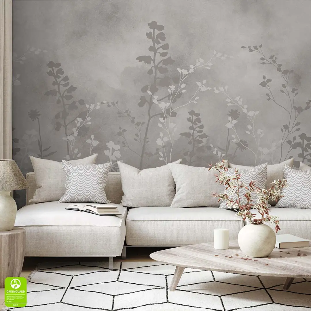 Fototapeta na wymiar - Szare Kwiaty Polne – Nowoczesna łąka do salonu, sypialni, styl minimalistyczny i boho, dekoracja ścienna roślinna