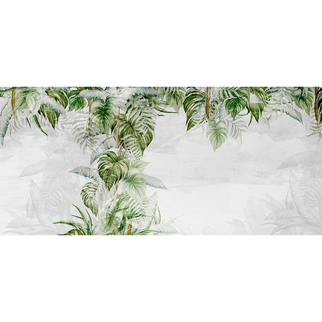 Fototapeta na wymiar: Tropikalne Plecione Liście na Szarym Tle – Styl Urban Jungle i Skandynawski, Jasna zieleń i szarość, Do salonu i sypialni, Efekt akwareli