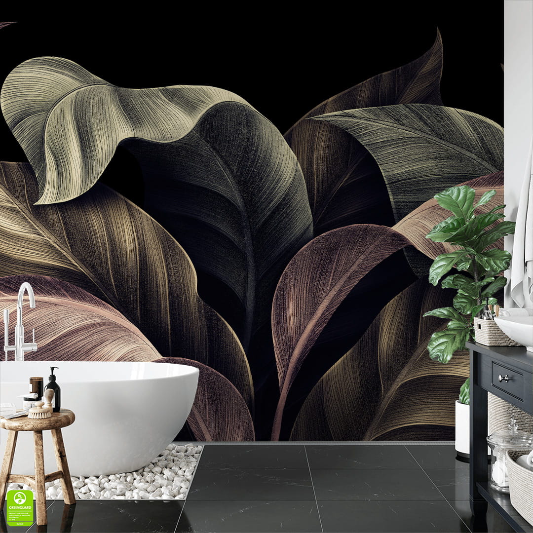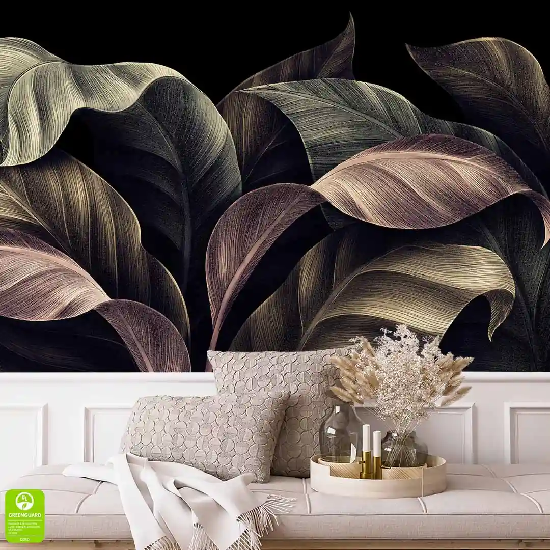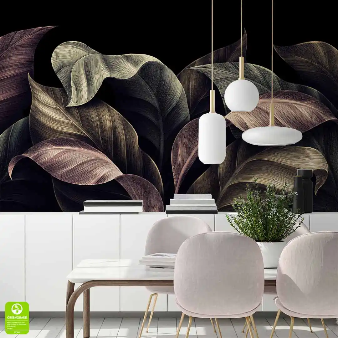 Designerska fototapeta na ścianę "Tropikalny motyw liści w kolorach zieleni, beżu, brązu na czarnym tle"