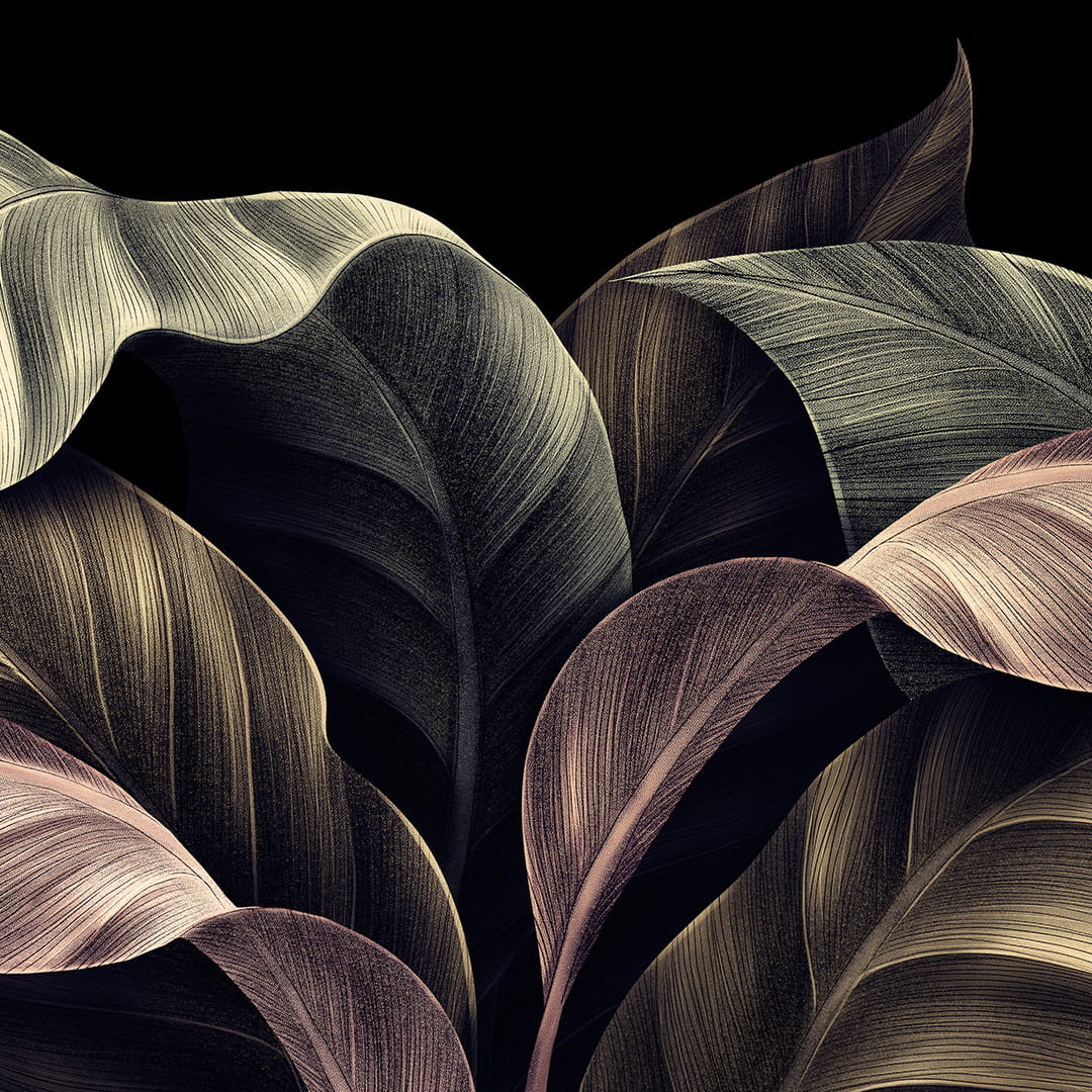 Fototapeta na wymiar: Tropikalny motyw liści w kolorach zieleni, beżu, brązu na czarnym tle, Styl Nowoczesny do Salonu, Sypialni