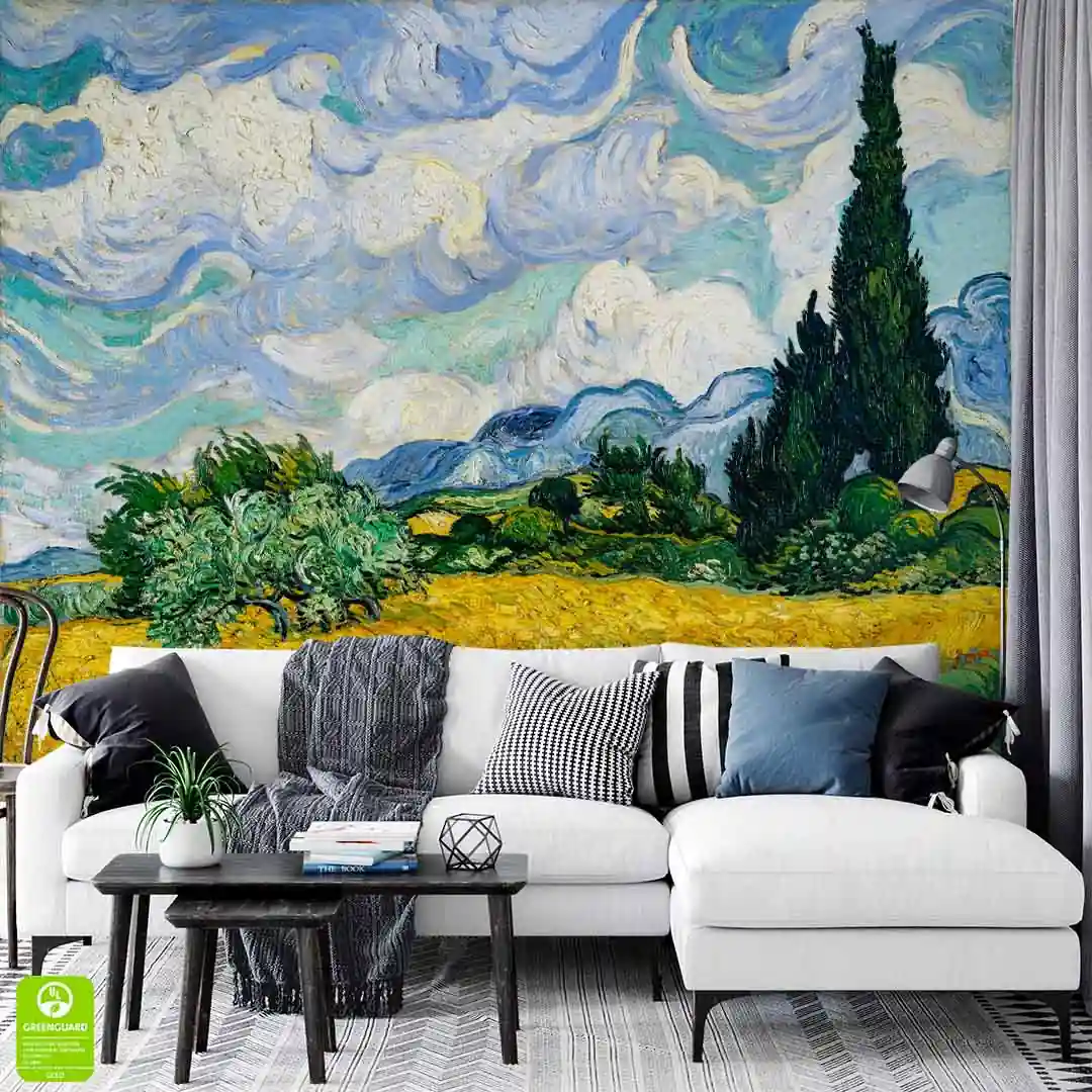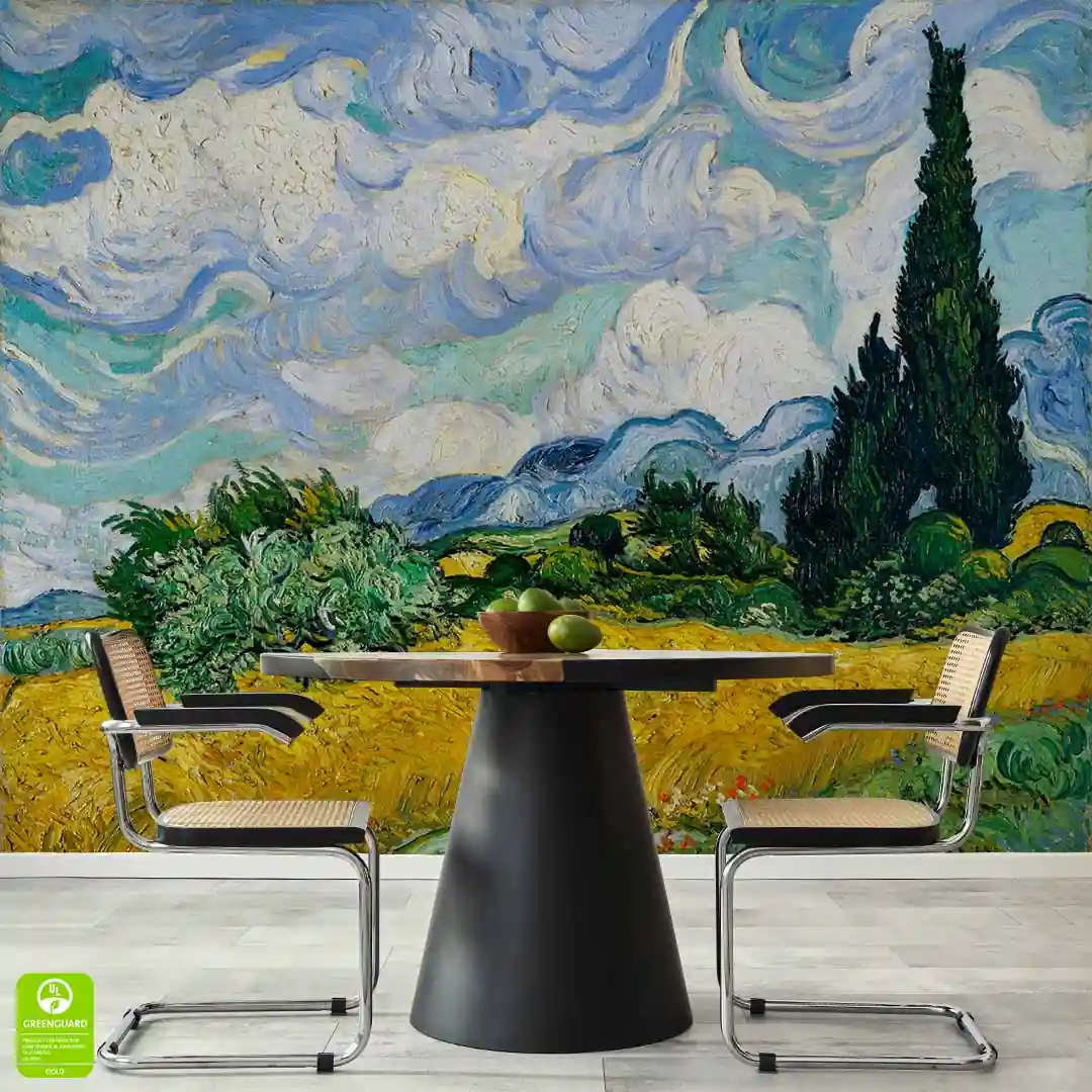 Fototapeta na wymiar - Vincent Van Gogh - Pole pszenicy z cyprysami - Reprodukcja to propozycja dla miłośników sztuki i twórczości holenderskiego artysty. Wheat Field with Cypresses (1889 r.) to jeden z najsłynniejszych obrazów olejnych Vincenta Van Gogha namalowany przez artystę podczas jego pobytu w miejscowości Saint-Rémy. Kompozycję cechuje niezwykła dynamika i ekspresja. Na pierwszym planie widoczne są pola pszenicy, drzewa a w tle kłębiaste niebo. Kolorystyka tego dzieła jest intensywna, dostrzec można tutaj kolory żółci, zieleni czy różne odcienie niebieskiego. Ten pełen życia pejzaż z pewnością wniesie dużo pozytywnej energii do Twojego wnętrza.