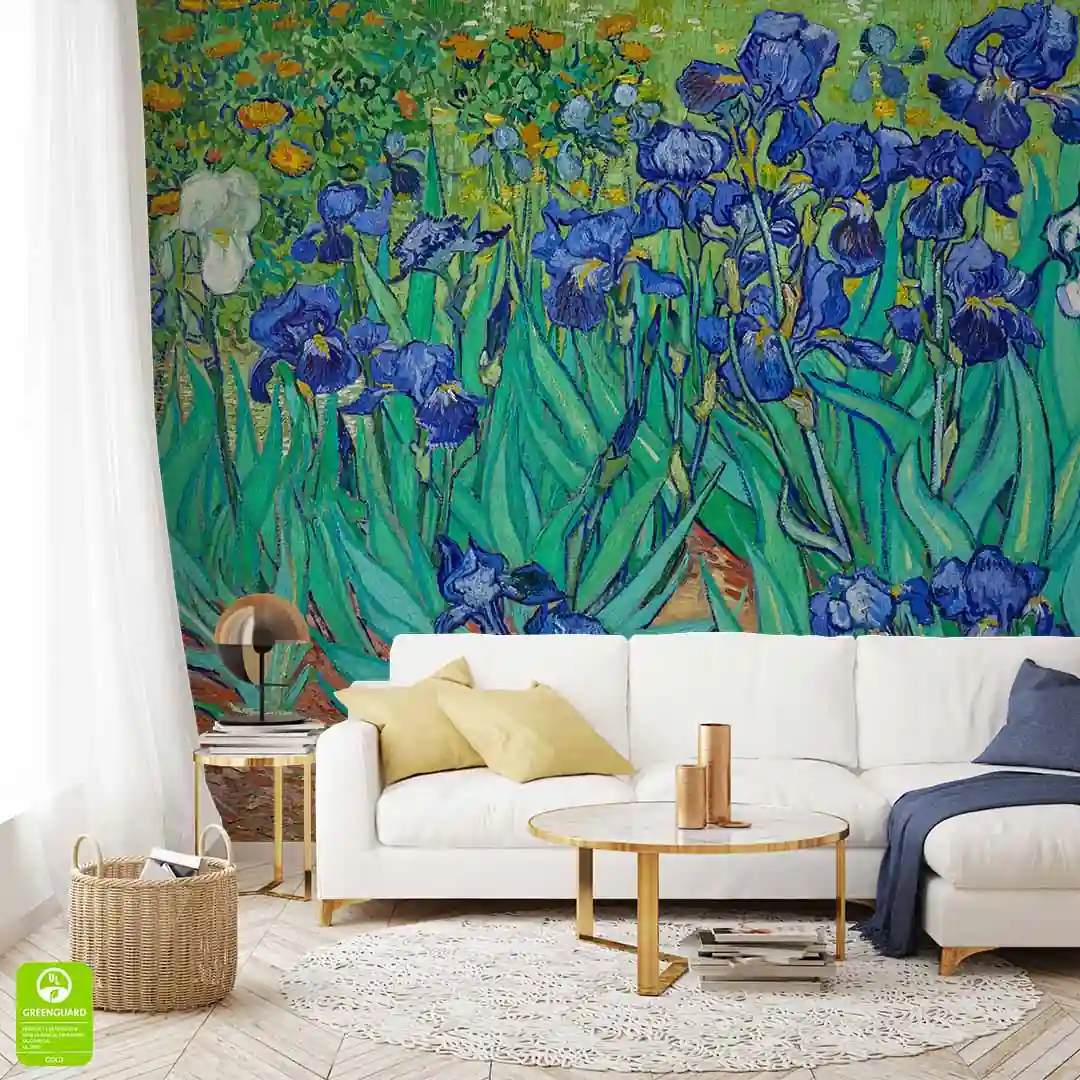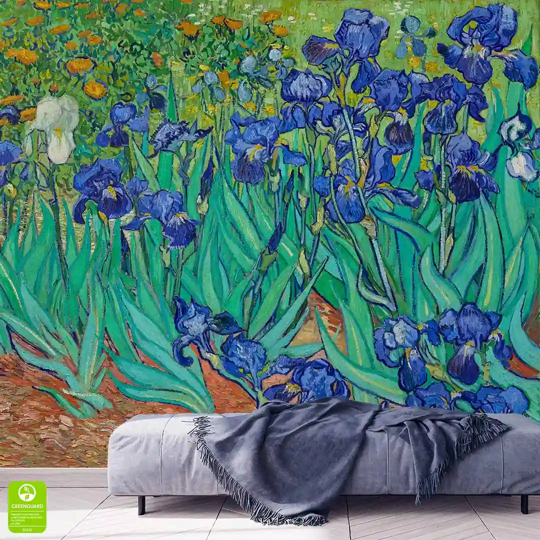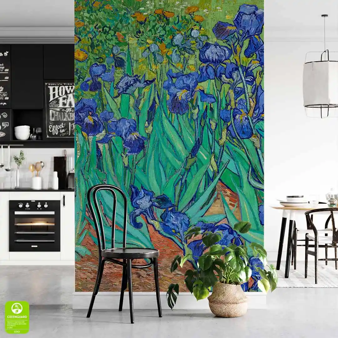 Fototapeta - Vincent van Gogh - Irysy - Reprodukcja - to nasza propozycja dla miłośników fenomenalnej twórczości Vincenta Van Gogha. Obraz Irises został namalowany w roku 1889, przestawia gęsto rosnące niebieskofioletowe kwiaty irysów, wyróżniające się dynamicznymi liniami i intensywną kolorystyką. Przeważają tutaj kolory niebieski, fioletowy oraz zielony, w dolnej części fototapety można dostrzec również odcienie brązu. Kolorystyka jest żywa, nie są to subtelne, pastelowe odcienie. Dzięki czemu taka dekoracja ścienna z całą pewnością stanowić będzie dominująca ozdobę wnętrza. Tematyka kwiatowa jest uniwersalna, motywy botaniczne są niezwykle popularne w aranżacji wnętrz, zatem można fototapetę wykorzystać niemal w każdym wnętrzu i stylu.