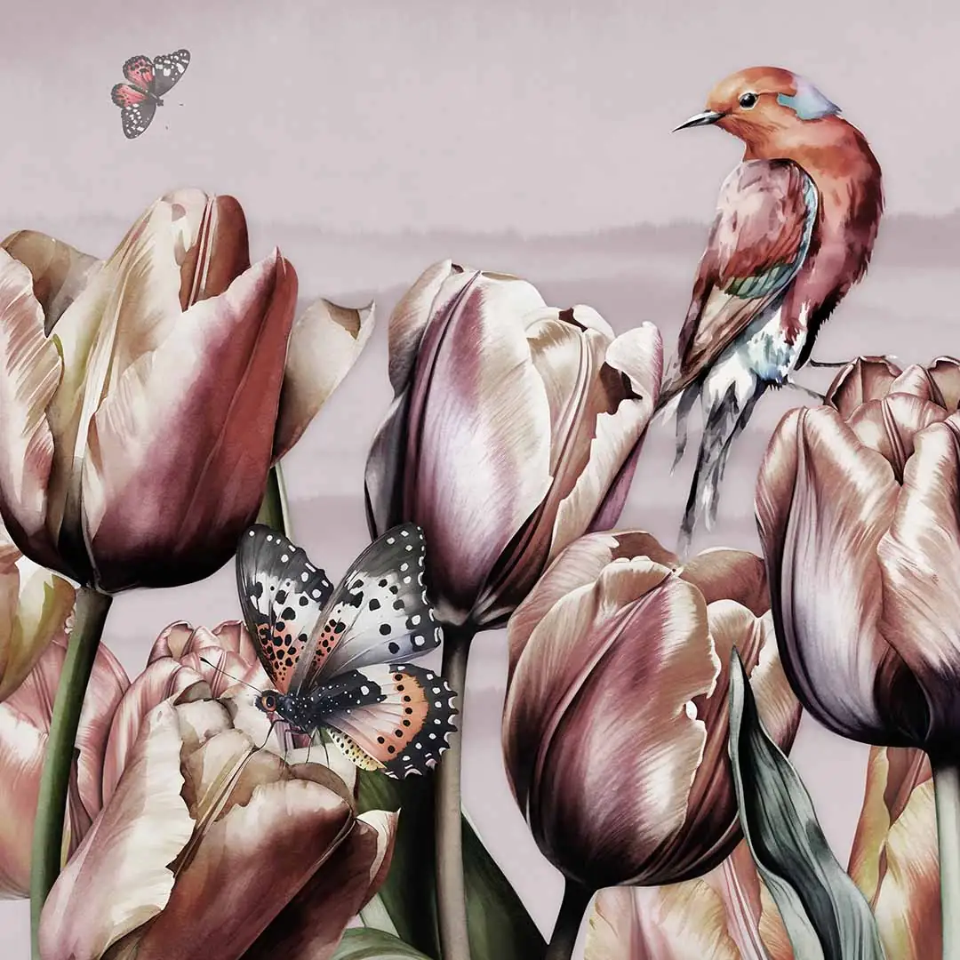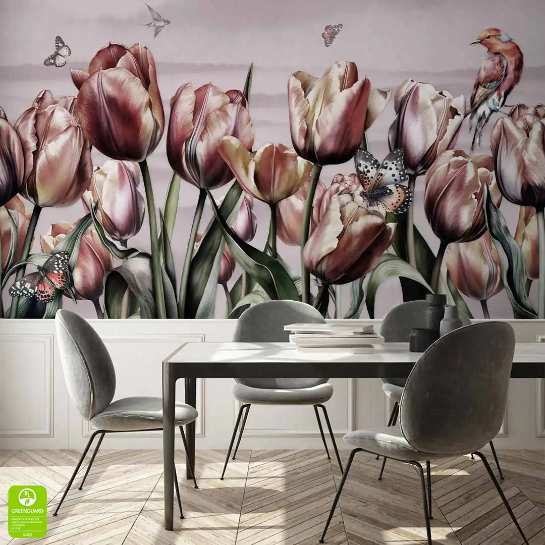 Fototapeta - Wiosenne czerwone tulipany to doskonała propozycja dla osób ceniących piękne, naturalne kwiatowe wzory. Tapeta utrzymana jest w kolorowej tonacji. Możemy tutaj dostrzec kolor różowy, czerwony, bordowy, beżowy, brązowy, kremowy czy kilka odcieni zieleni. Barwy są stonowane, nie jest to mocna wyrazista czerwień. Motyw to przede wszystkim kwiaty - piękne wiosenne tulipany na delikatnym lekko zamglonym tle oraz ptaki i kolorowe motyle. W dalszym planie widać zamglone leśne wzgórza.