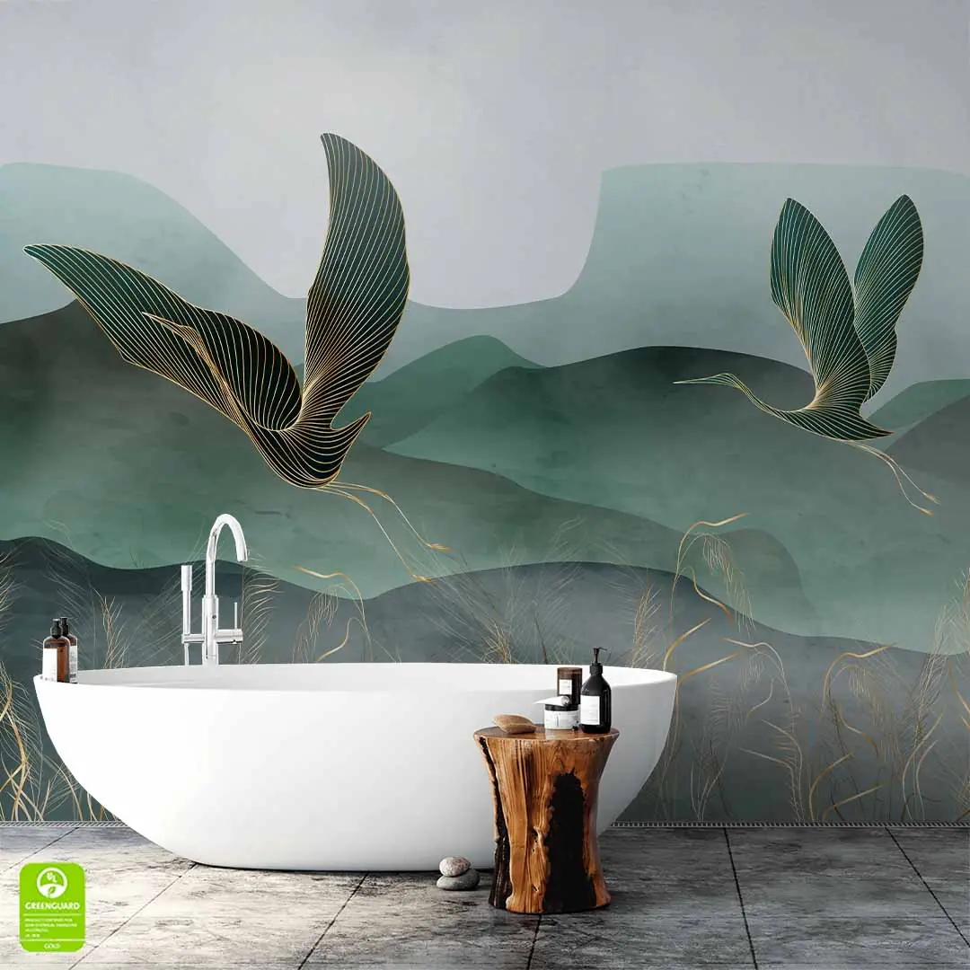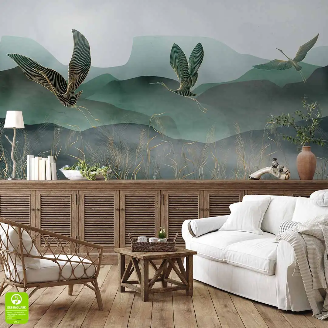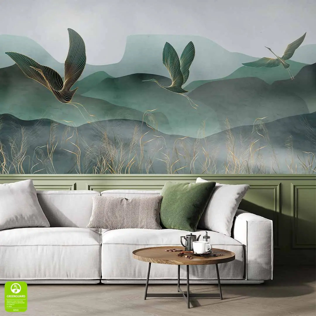 Fototapeta na wymiar - Żurawie w locie w odcieniach zieleni - tapeta na ścianę w ptaki do salonu