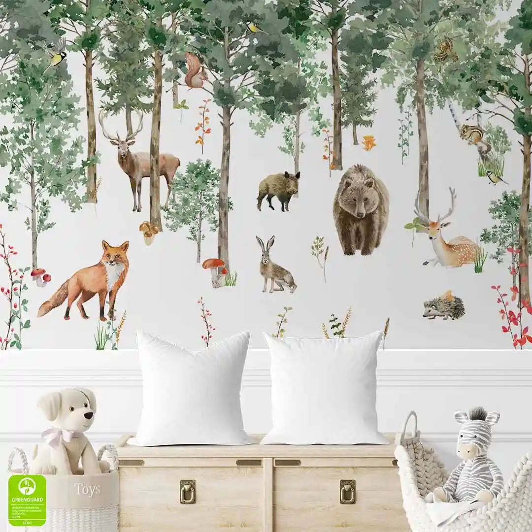 Fototapeta na wymiar do pokoju dziecka: Leśna Polana i Zwierzęta – Lis, Jeleń, Sarna i Zając, Styl Akwarelowy, Boho, Zielono-Biała