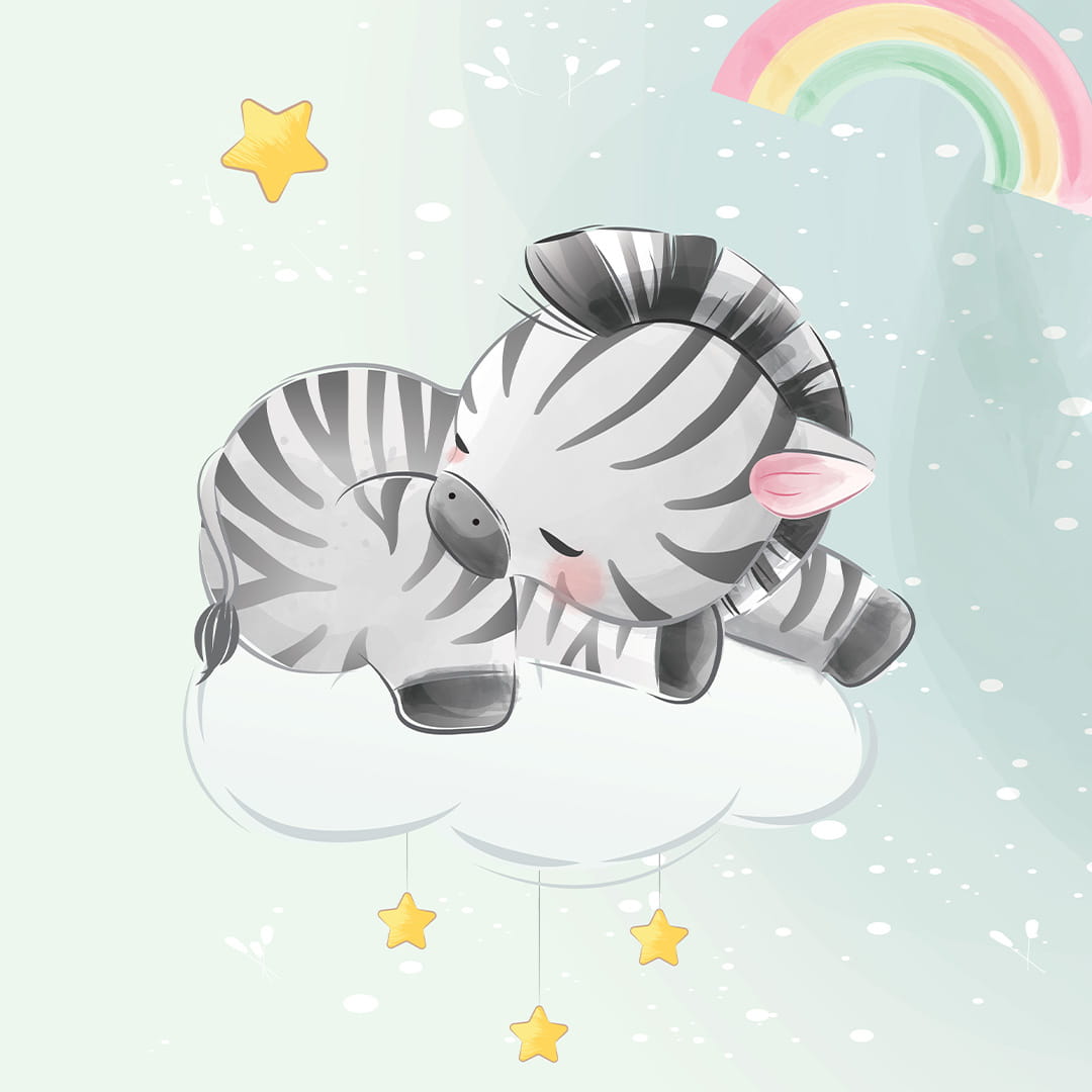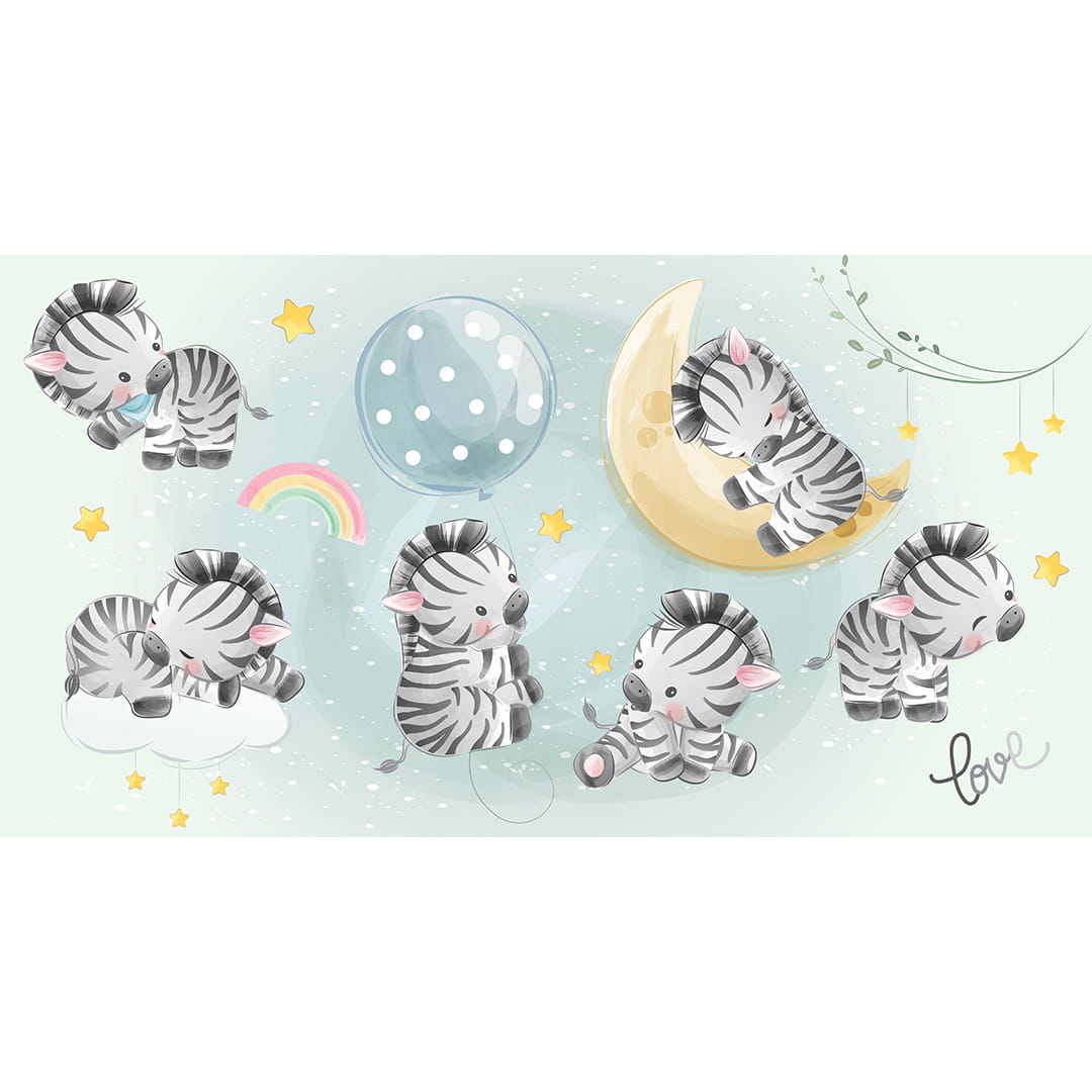 Fototapeta na wymiar do pokoju dziecka: Urocze Maleńkie Zebry na Dobranoc – Księżyc, Gwiazdki i Tęcza, Styl Akwarelowy, Boho, Pastelowa, Miętowa
