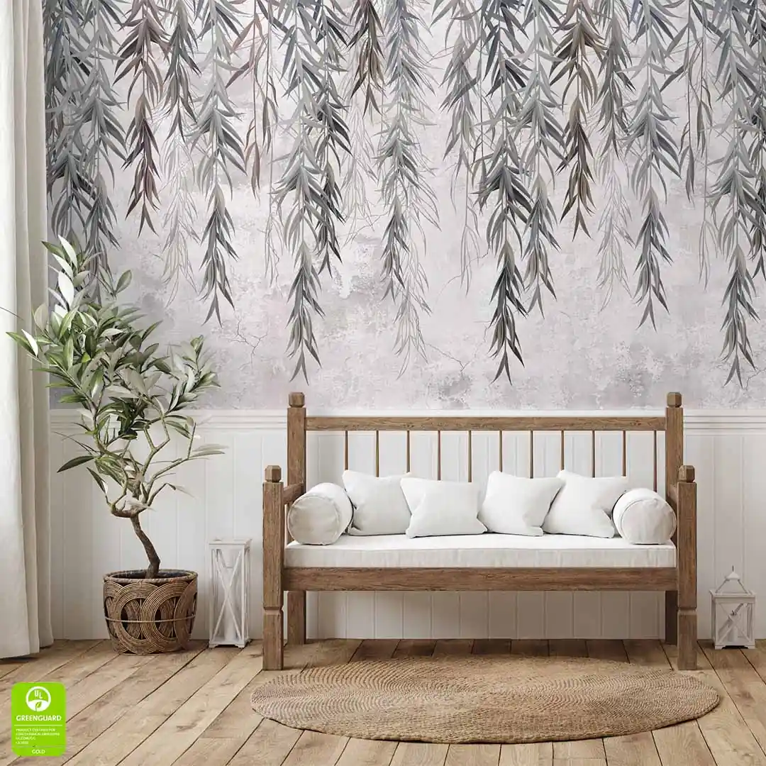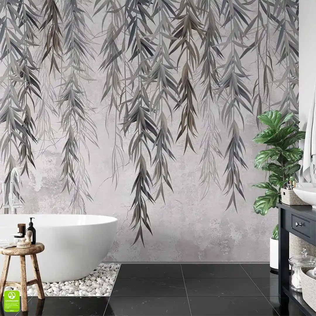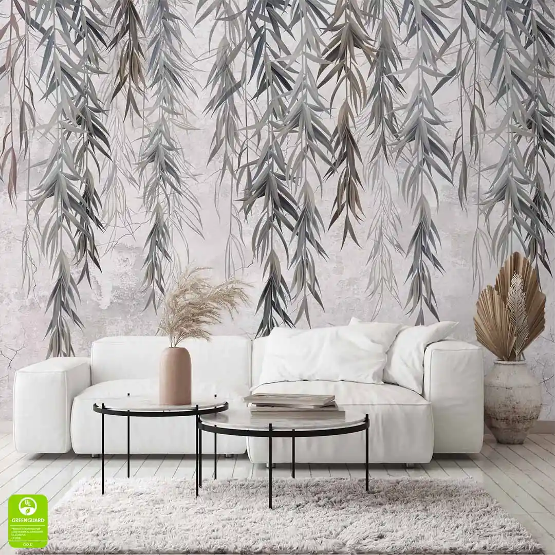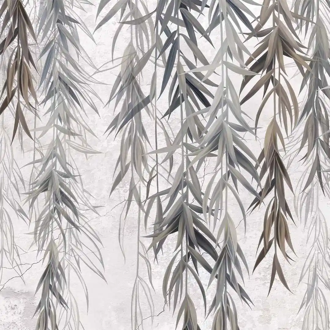 Fototapeta na wymiar – gałązki wierzby na tle betonowej ściany w szarych odcieniach, styl minimalistyczny i industrialny, idealna do salonu i sypialni