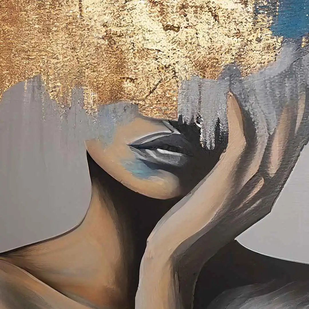 - techniką druku - proces drukowania wykorzystuje inne metody tworzenia kolorów (tzw. "przestrzeń barw") niż te, które stosowane są na ekranach komputera; kolory drukowane mogą wyglądać również nieco inaczej na różnych materiałach (np. canvasie, flizelinie, papierze czy szkle itp.) i przy użyciu różnych tuszy, w naszym przypadku tuszy do druku UV; złote elementy nie są wybiórczo metalizowane - efekt uzyskany jest poprzez wydruk tekstury w kolorze złota;