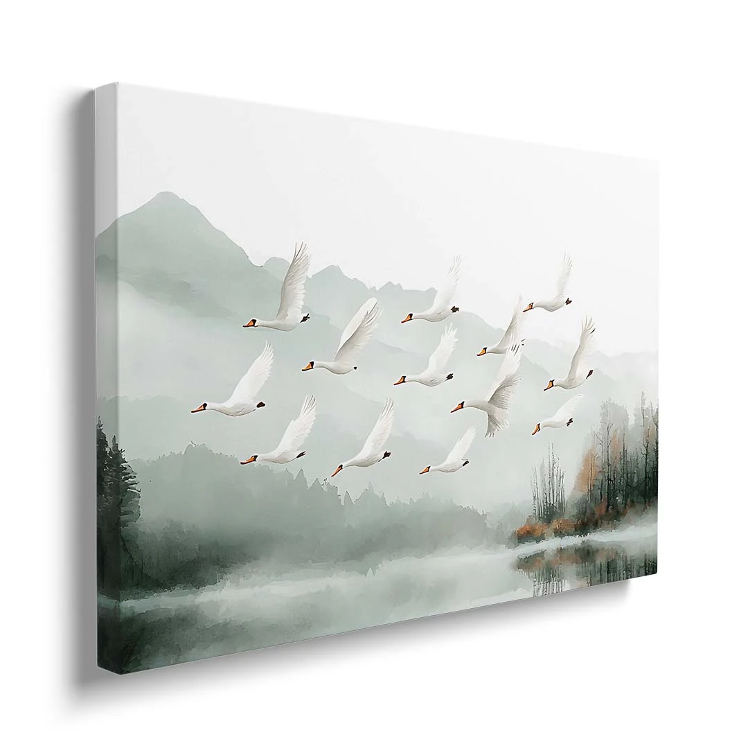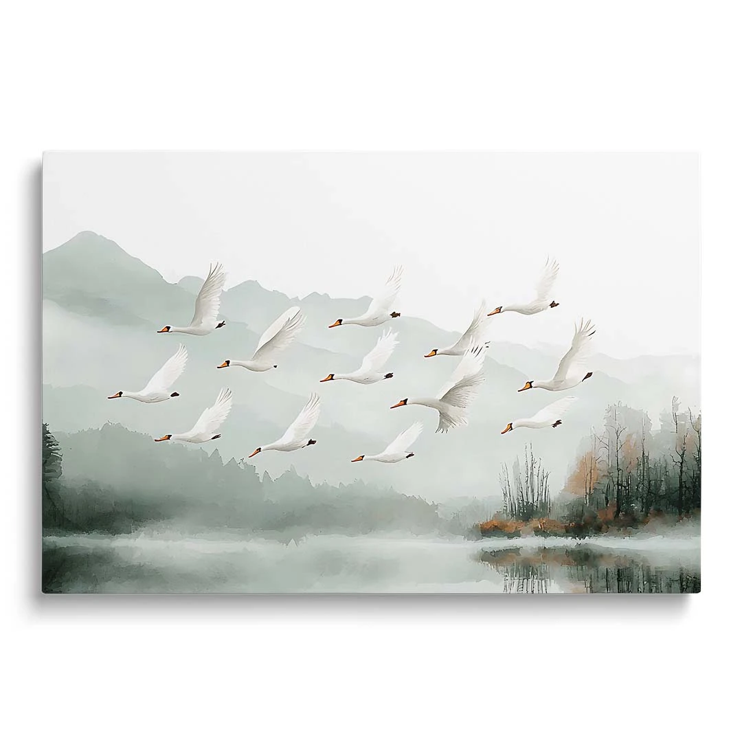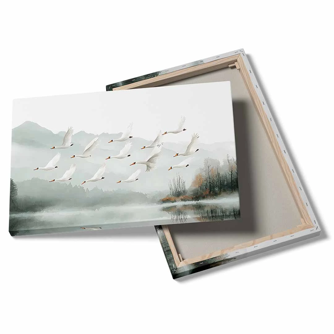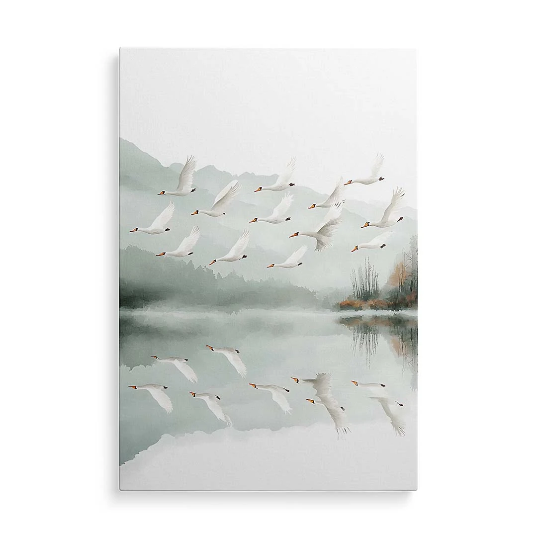 Obraz na płótnie - Łabędzie nad jeziorem to piękna artystyczna ilustracja przedstawiająca stado wdzięcznych, białych łabędzi w locie nad spokojnym jeziorem. Jezioro zaprezentowane jest na tle widocznych w oddali gór spowitych mgłą i bezchmurnego nieba. Niezwykle elegancka kompozycja tworzy zdecydowanie bardzo spokojną atmosferę we wnętrzu, stwarzając warunki do refleksji i zadumy. Ciekawym efektem zastosowanym w tym motywie jest tafla jeziora odbijająca stado łabędzi w locie. Całość grafiki przedstawiona jest w zdecydowanie spokojnych barwach bieli, szarości i zieleni. Widoczne są drobne bardziej żywe dodatki kolorystyczne w postaci brązowych przebarwień lasu czy dziobów łabędzich. Motyw sprawdzi się w wielu wnętrzach jak i wielu stylach wykończenia.