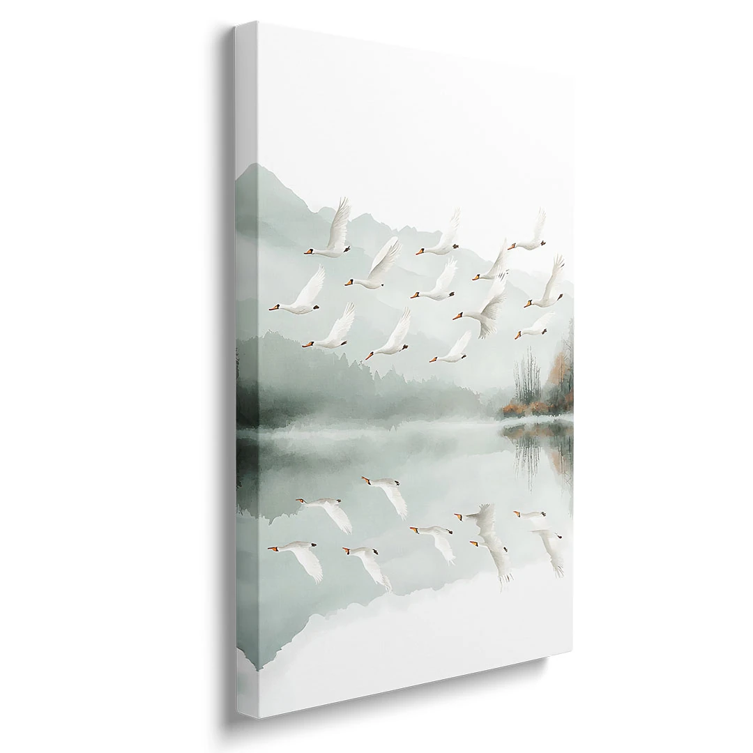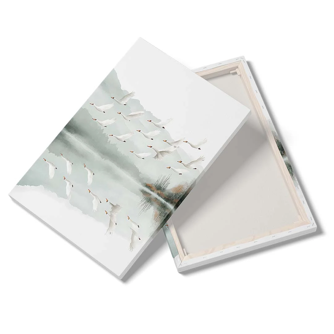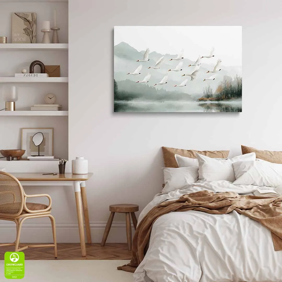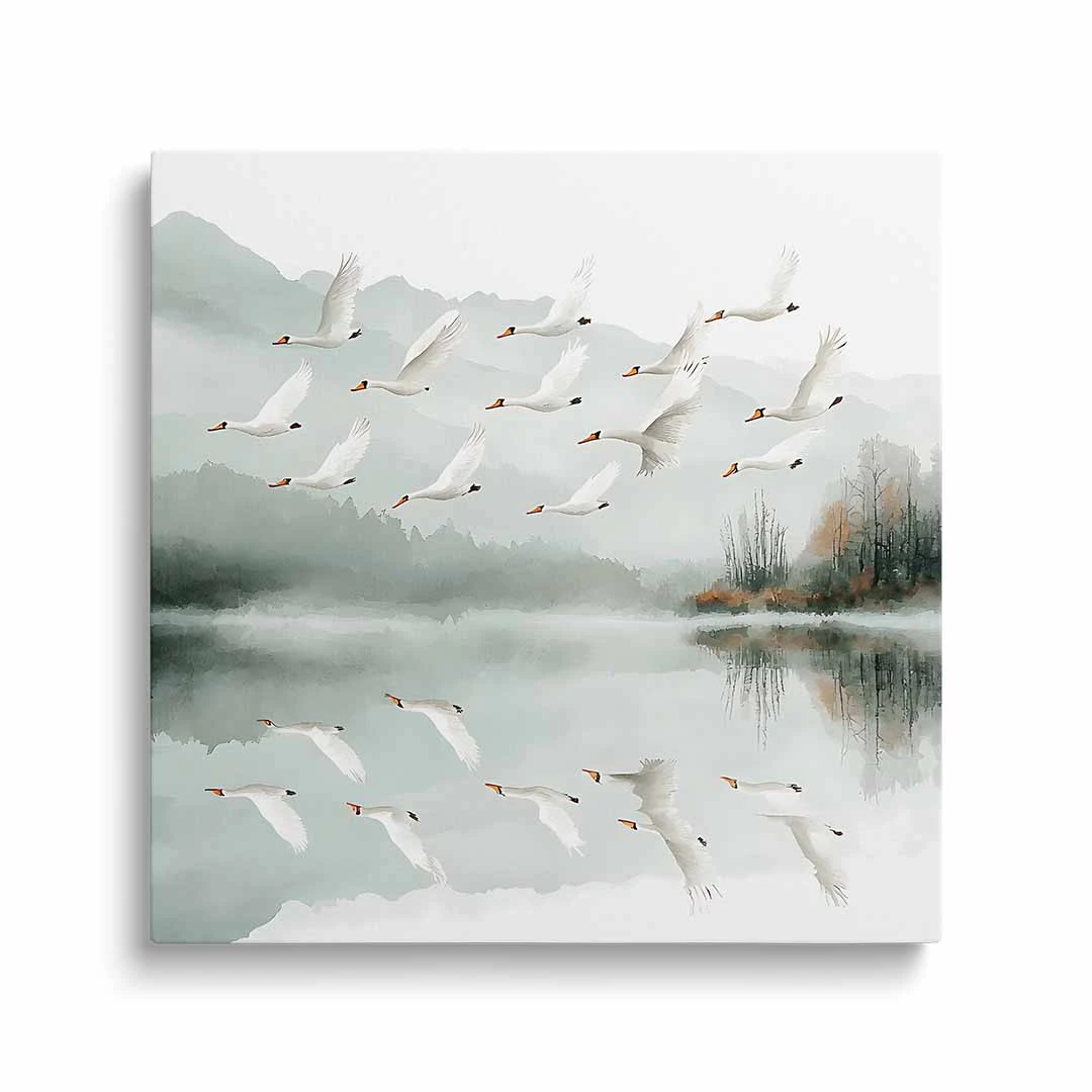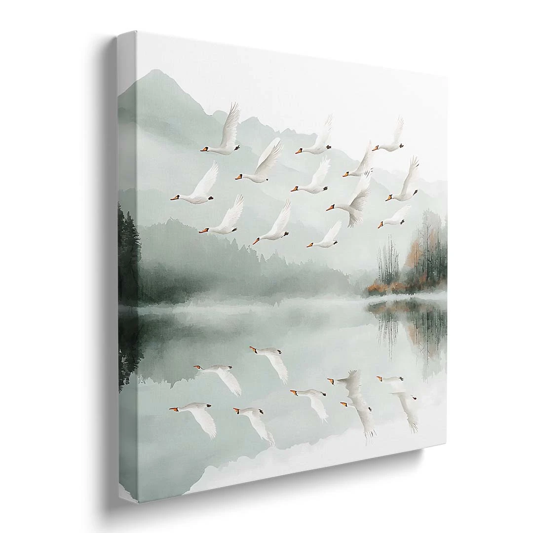 Obraz na płótnie - Łabędzie nad jeziorem to piękna artystyczna ilustracja przedstawiająca stado wdzięcznych, białych łabędzi w locie nad spokojnym jeziorem. Jezioro zaprezentowane jest na tle widocznych w oddali gór spowitych mgłą i bezchmurnego nieba. Niezwykle elegancka kompozycja tworzy zdecydowanie bardzo spokojną atmosferę we wnętrzu, stwarzając warunki do refleksji i zadumy. Ciekawym efektem zastosowanym w tym motywie jest tafla jeziora odbijająca stado łabędzi w locie. Całość grafiki przedstawiona jest w zdecydowanie spokojnych barwach bieli, szarości i zieleni. Widoczne są drobne bardziej żywe dodatki kolorystyczne w postaci brązowych przebarwień lasu czy dziobów łabędzich. Motyw sprawdzi się w wielu wnętrzach jak i wielu stylach wykończenia.