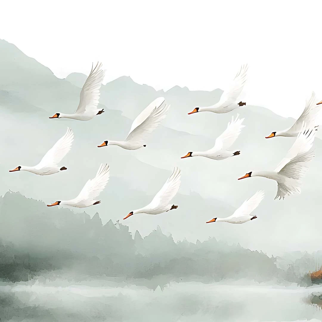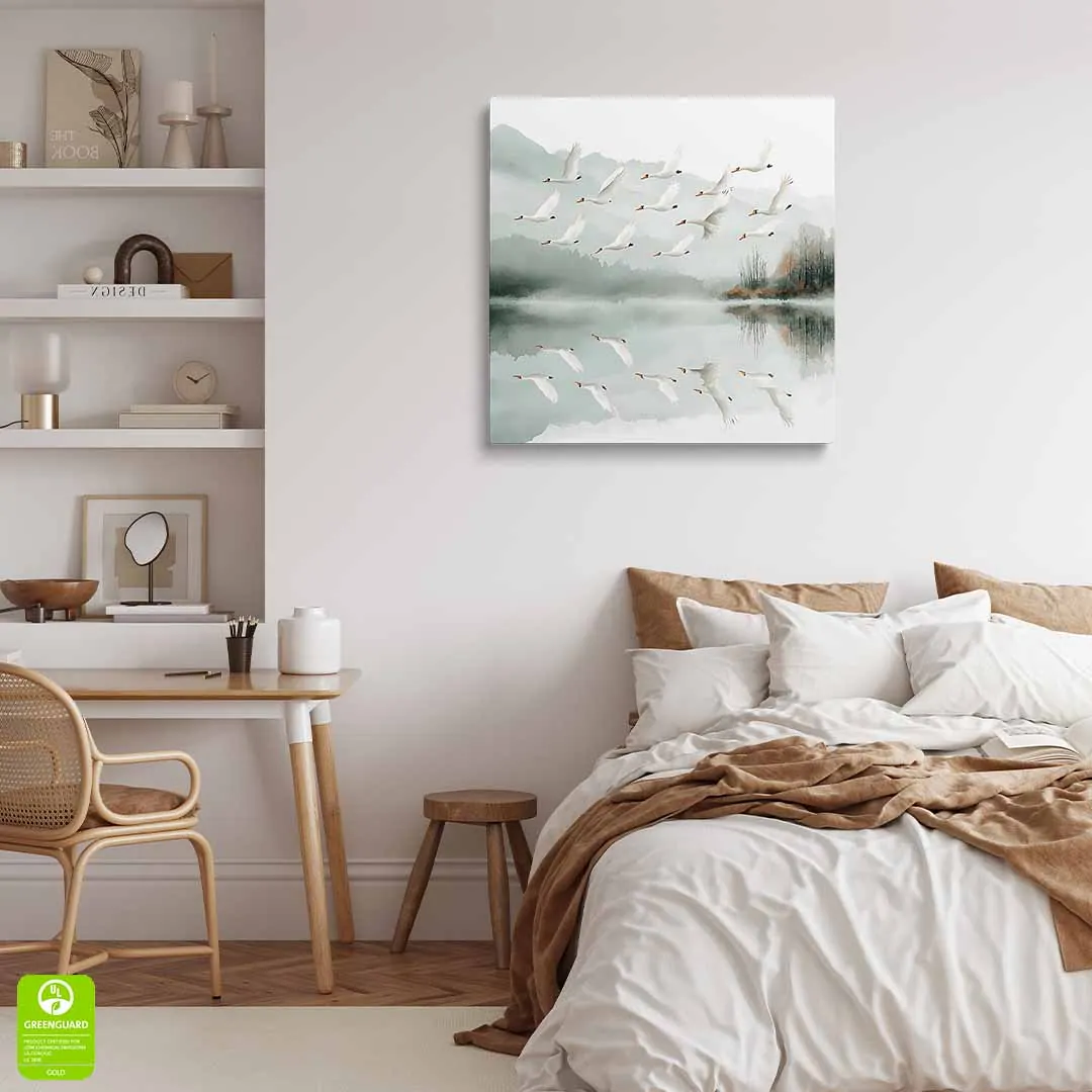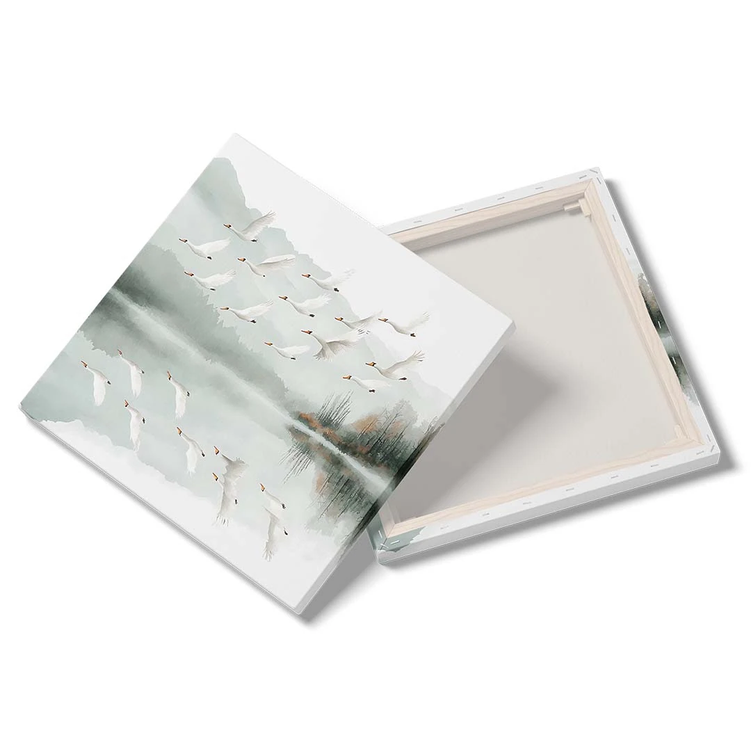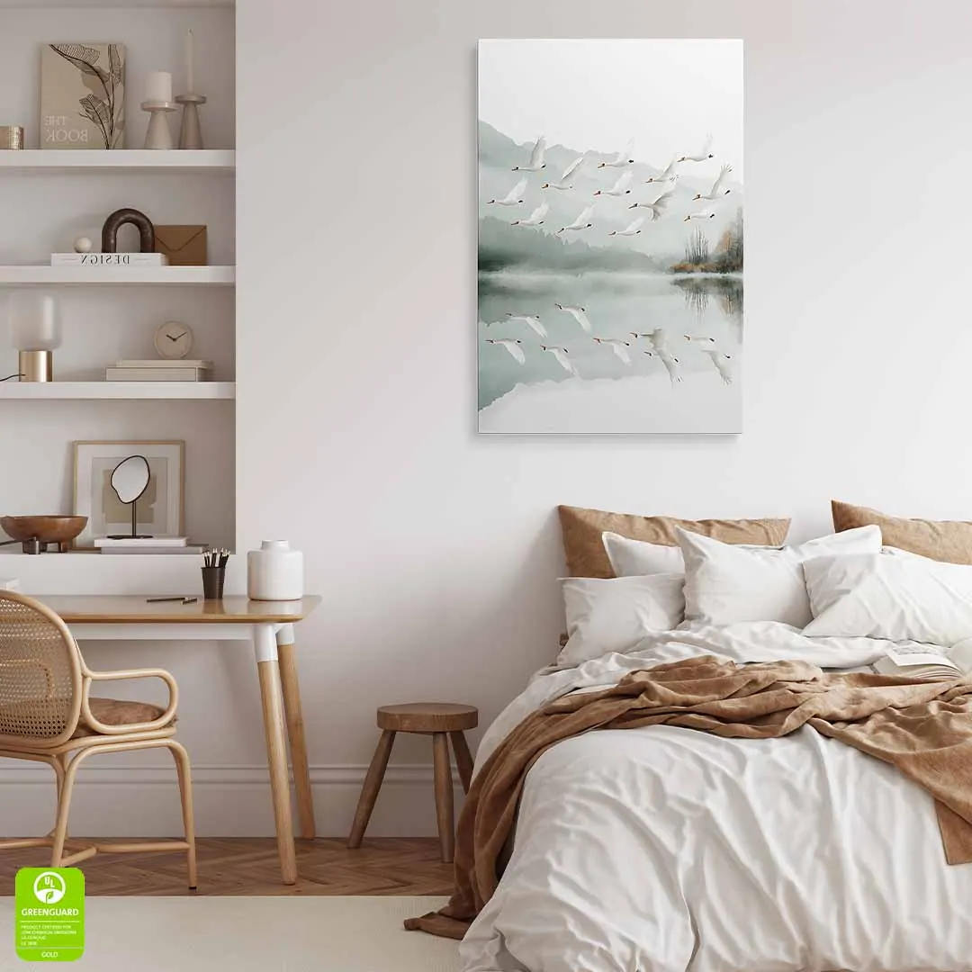 Obraz na płótnie - Łabędzie nad jeziorem to piękna artystyczna ilustracja przedstawiająca stado wdzięcznych, białych łabędzi w locie nad spokojnym jeziorem. Jezioro zaprezentowane jest na tle widocznych w oddali gór spowitych mgłą i bezchmurnego nieba. Niezwykle elegancka kompozycja tworzy zdecydowanie bardzo spokojną atmosferę we wnętrzu, stwarzając warunki do refleksji i zadumy. Ciekawym efektem zastosowanym w tym motywie jest tafla jeziora odbijająca stado łabędzi w locie. Całość grafiki przedstawiona jest w zdecydowanie spokojnych barwach bieli, szarości i zieleni. Widoczne są drobne bardziej żywe dodatki kolorystyczne w postaci brązowych przebarwień lasu czy dziobów łabędzich. Motyw sprawdzi się w wielu wnętrzach jak i wielu stylach wykończenia.