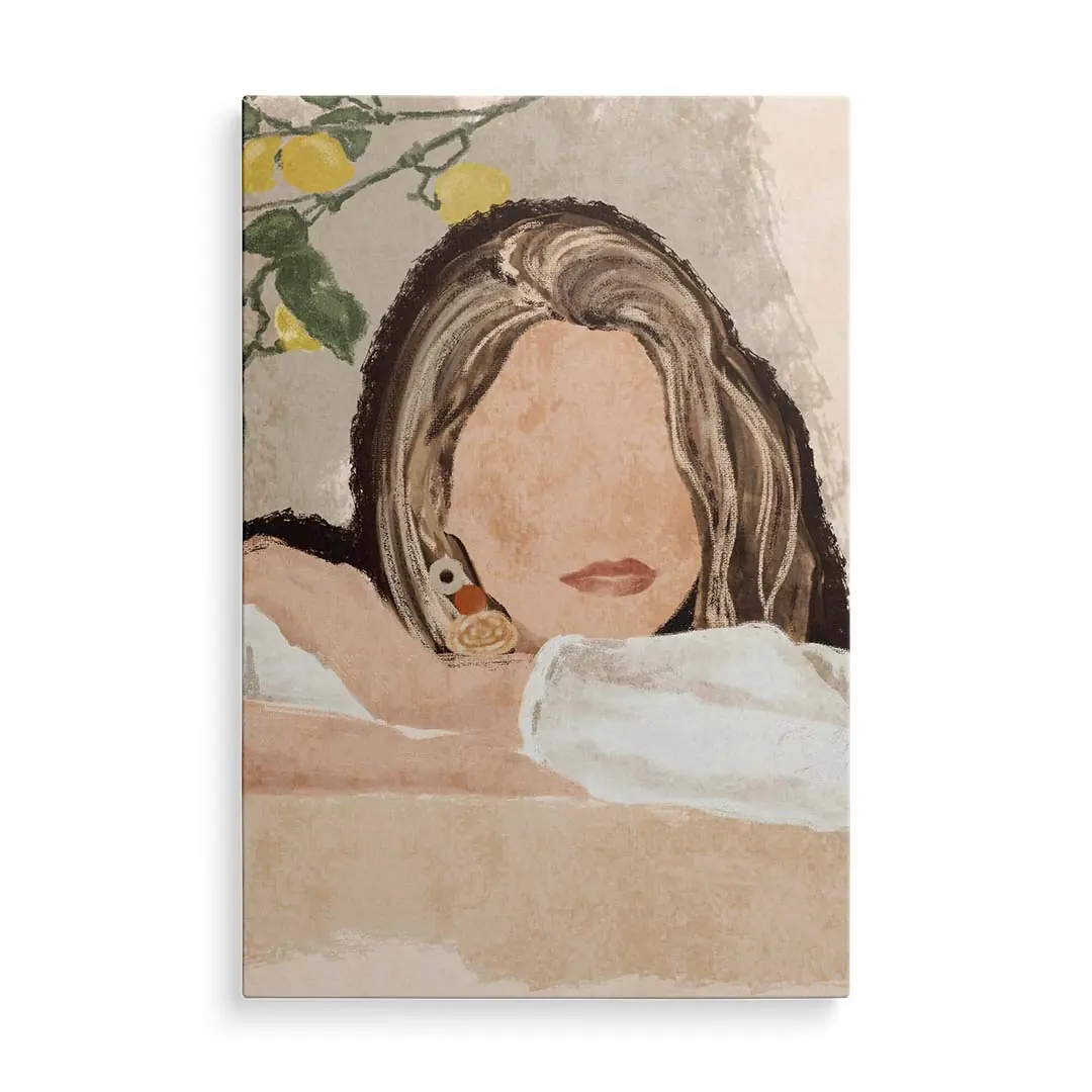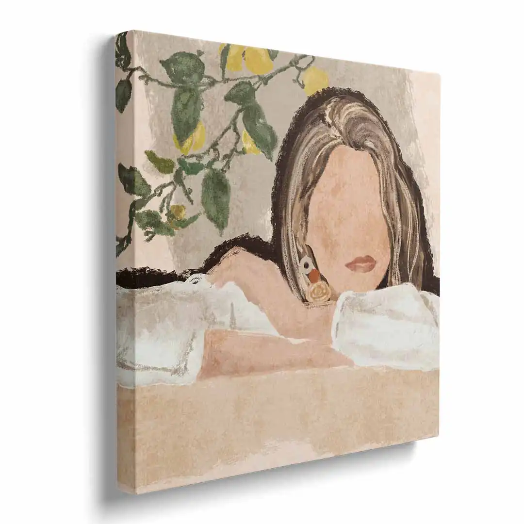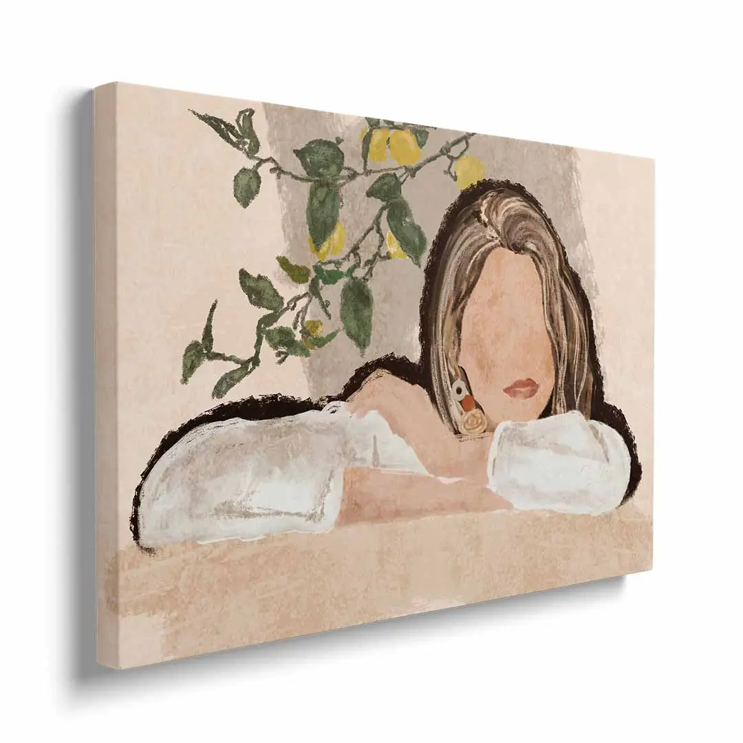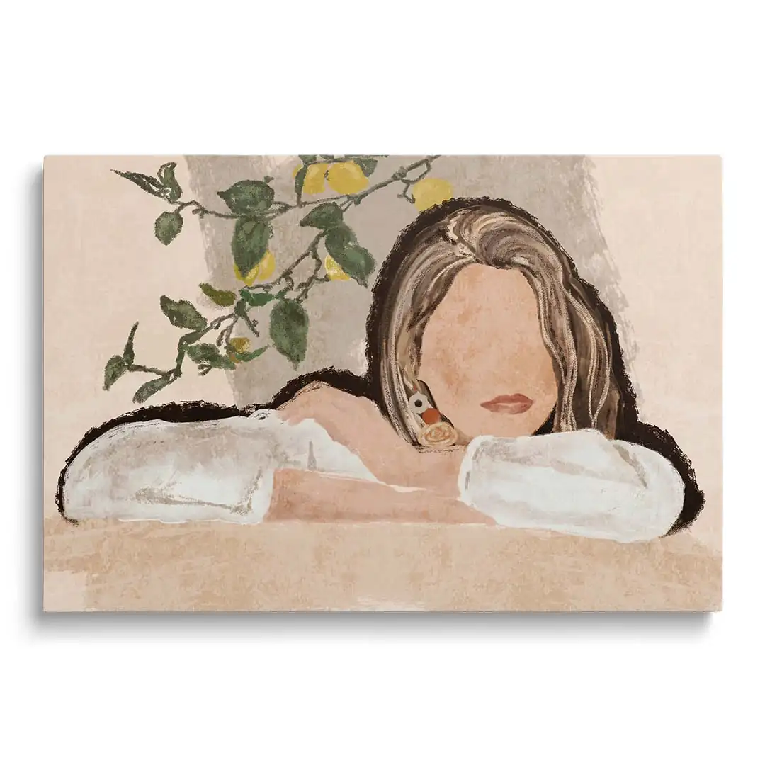Obraz na płótnie - Błoga zaduma - Portret kobiety to nasza propozycja do niewątpliwie kobiecego wnętrza. Obraz świetnie wkomponuje się w klimat sypialni, kącika z toaletką, jadalni czy salonu. Piękne stonowane barwy wprowadzą atmosferę spokoju i skłonią do refleksji i zadumy. Całość w tonacji beżu, brązu i koloru kremowego. Nad kobiecym portretem pięknie wyeksponowana jest gałąź z zielonymi liśćmi i owocami cytryny, które wprowadzają nieco żywsze kolory do tej grafiki. Motyw znakomicie sprawdzi się w pomieszczeniach w stylu boho, z dodatkami zieleni i naturalnego drewna czy wikliny.