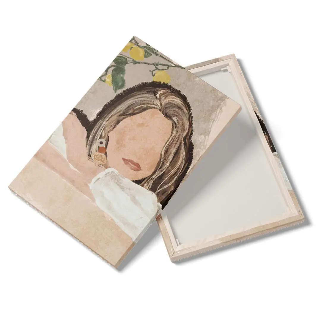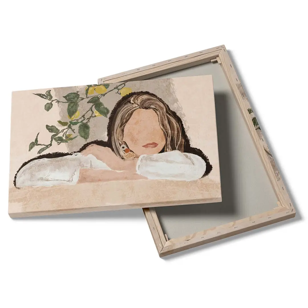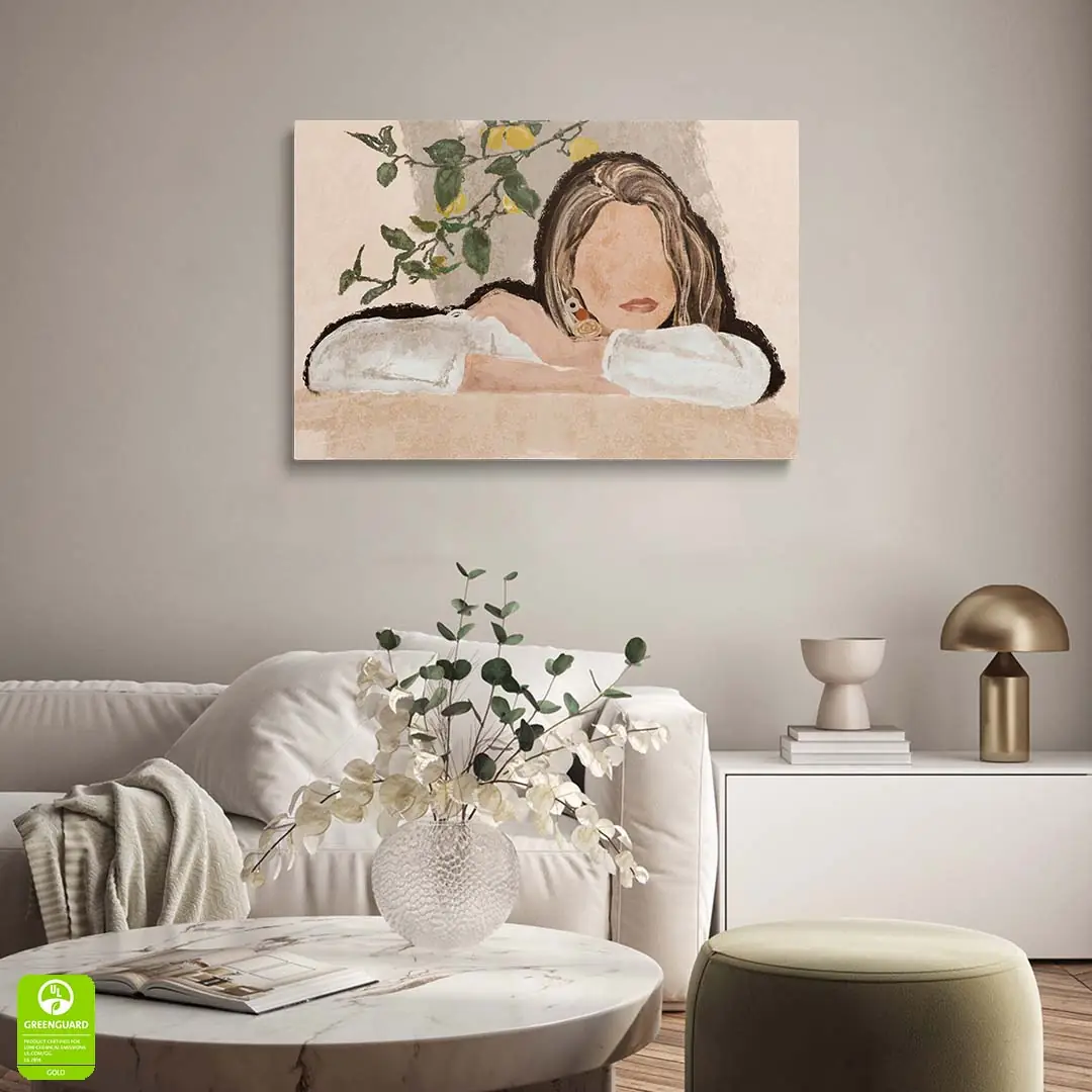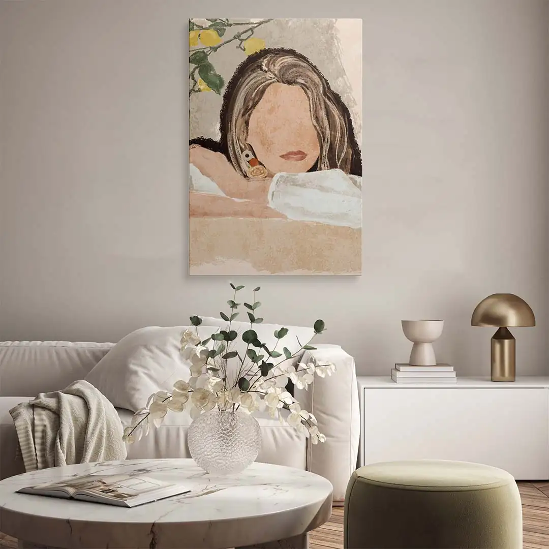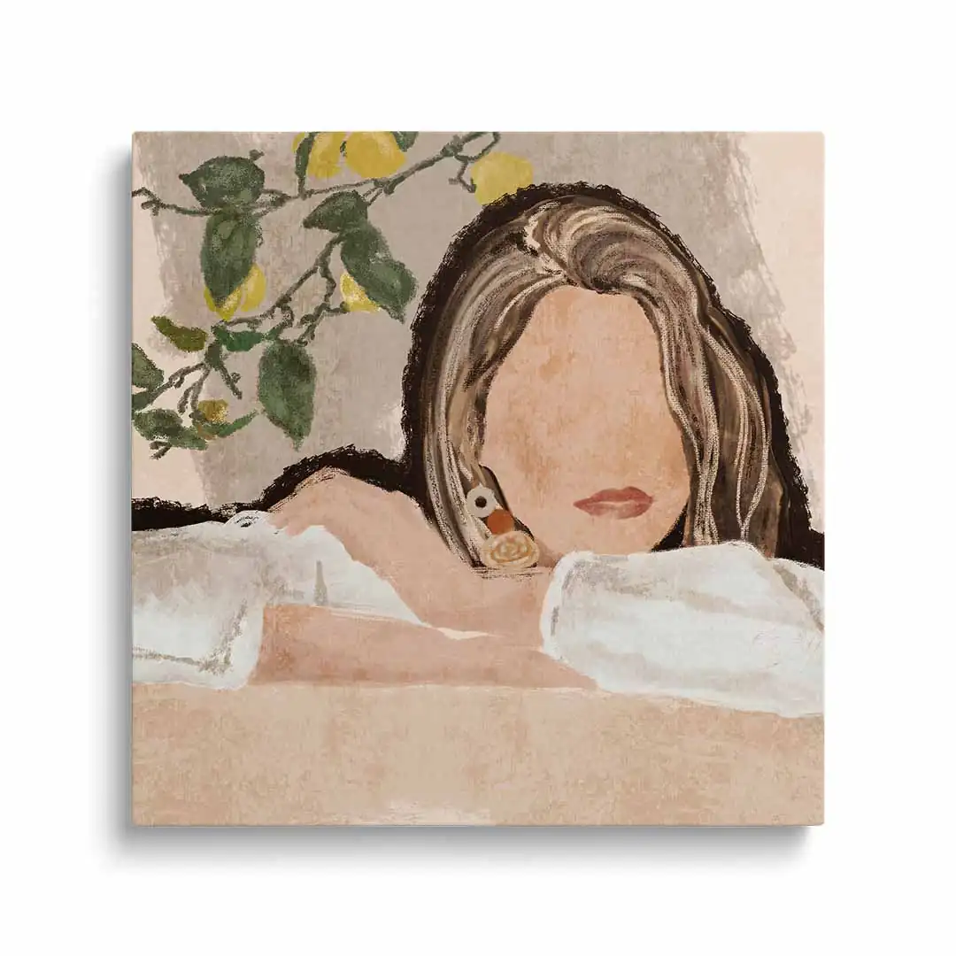 Obraz na płótnie - Błoga zaduma - Portret kobiety to nasza propozycja do niewątpliwie kobiecego wnętrza. Obraz świetnie wkomponuje się w klimat sypialni, kącika z toaletką, jadalni czy salonu. Piękne stonowane barwy wprowadzą atmosferę spokoju i skłonią do refleksji i zadumy. Całość w tonacji beżu, brązu i koloru kremowego. Nad kobiecym portretem pięknie wyeksponowana jest gałąź z zielonymi liśćmi i owocami cytryny, które wprowadzają nieco żywsze kolory do tej grafiki. Motyw znakomicie sprawdzi się w pomieszczeniach w stylu boho, z dodatkami zieleni i naturalnego drewna czy wikliny.