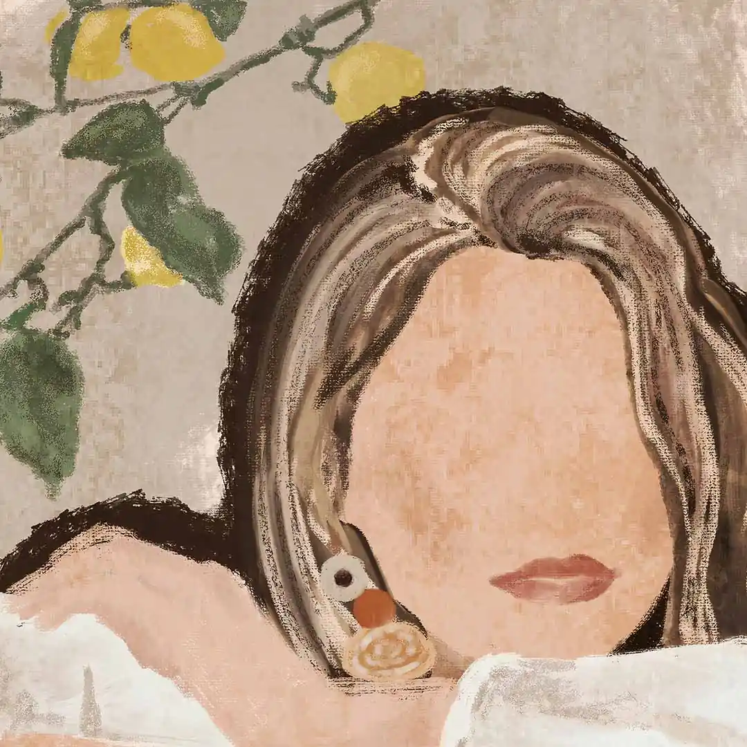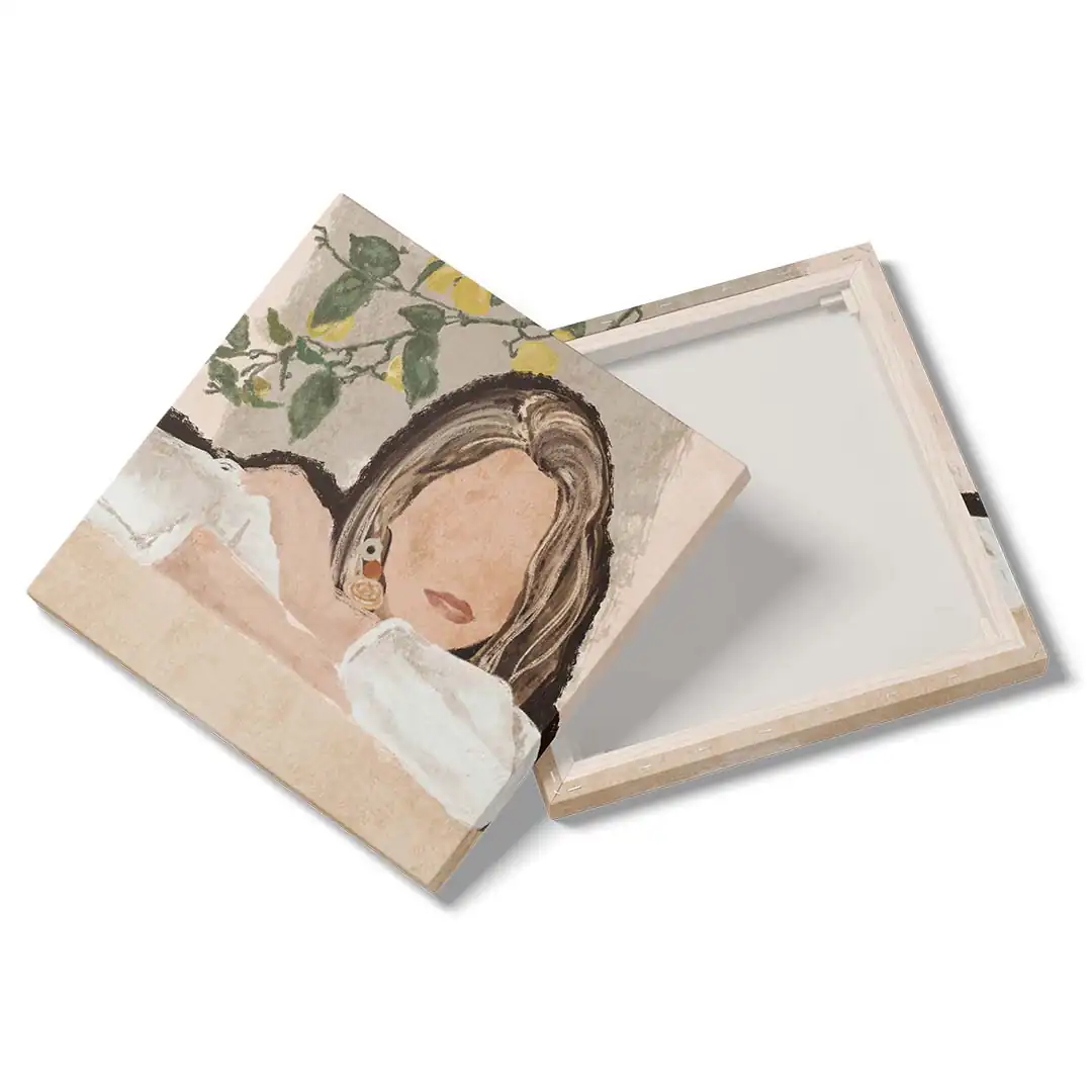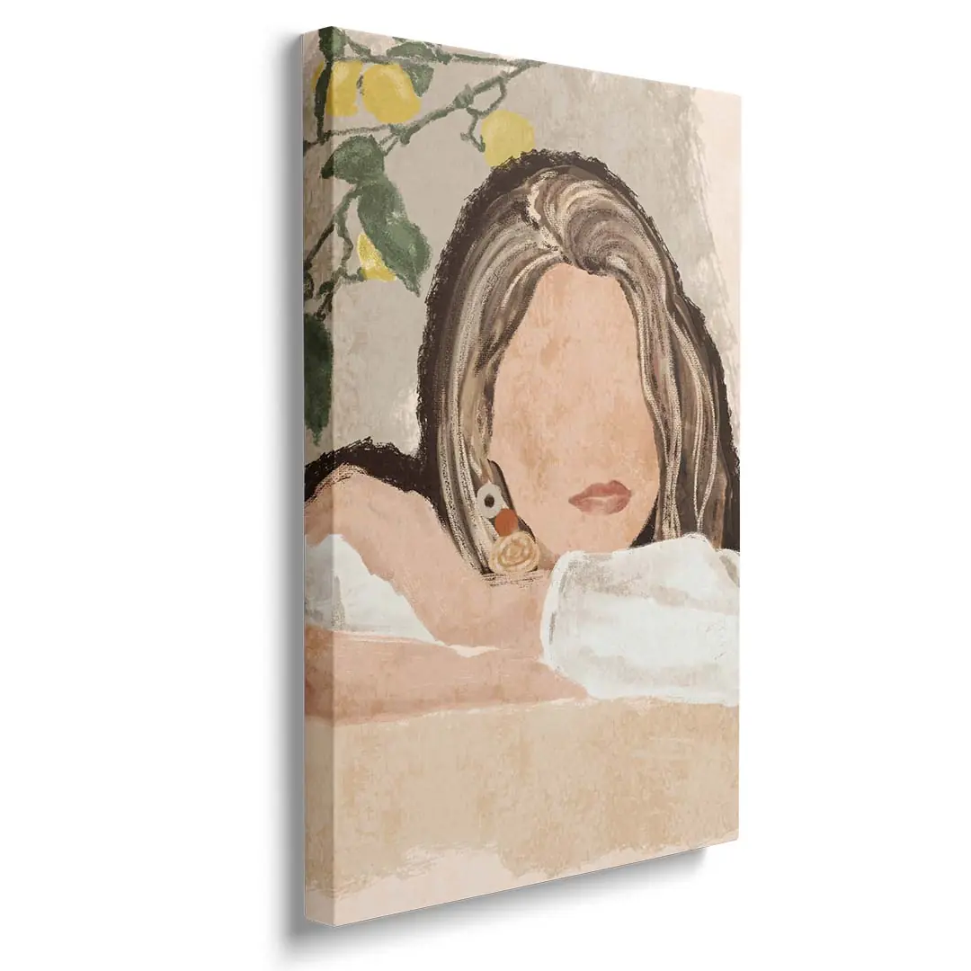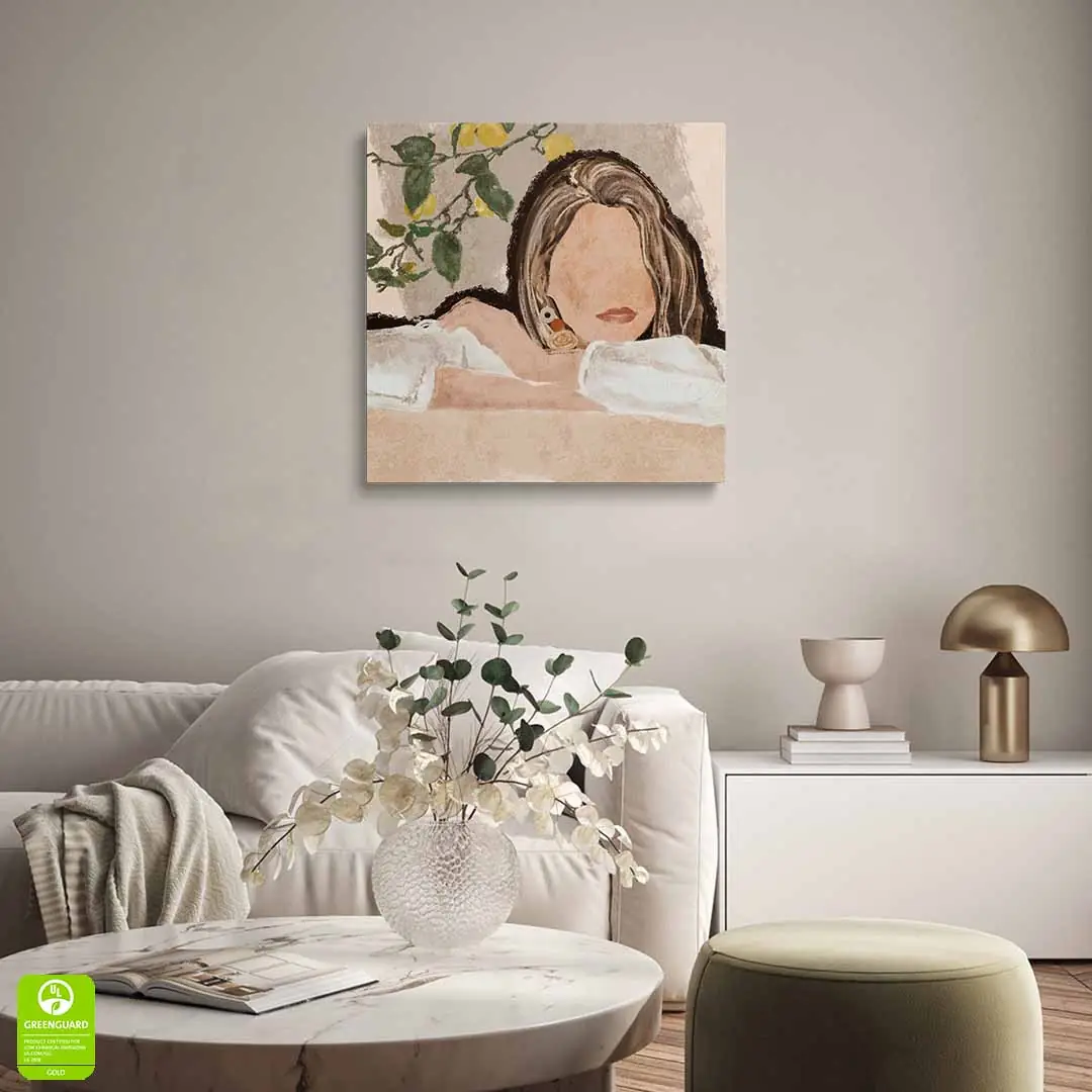Obraz na płótnie - Błoga zaduma - Portret kobiety to nasza propozycja do niewątpliwie kobiecego wnętrza. Obraz świetnie wkomponuje się w klimat sypialni, kącika z toaletką, jadalni czy salonu. Piękne stonowane barwy wprowadzą atmosferę spokoju i skłonią do refleksji i zadumy. Całość w tonacji beżu, brązu i koloru kremowego. Nad kobiecym portretem pięknie wyeksponowana jest gałąź z zielonymi liśćmi i owocami cytryny, które wprowadzają nieco żywsze kolory do tej grafiki. Motyw znakomicie sprawdzi się w pomieszczeniach w stylu boho, z dodatkami zieleni i naturalnego drewna czy wikliny.