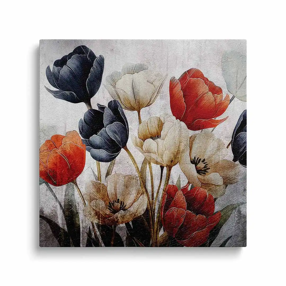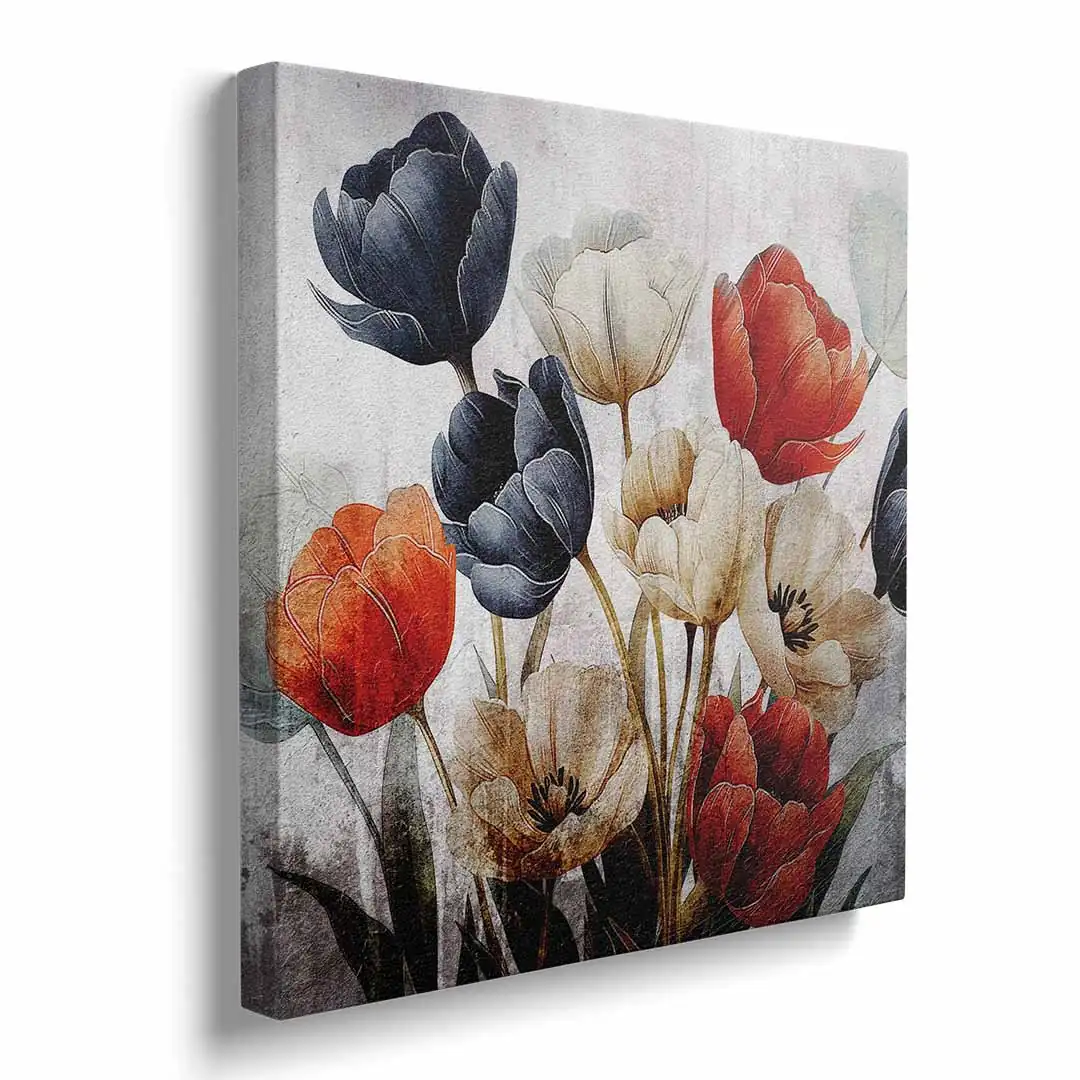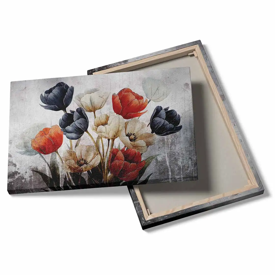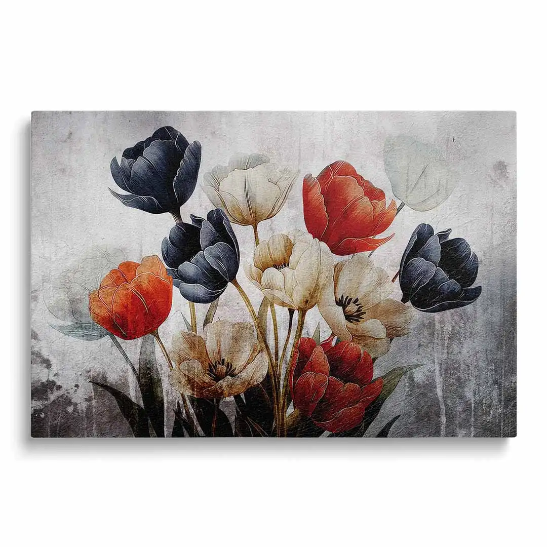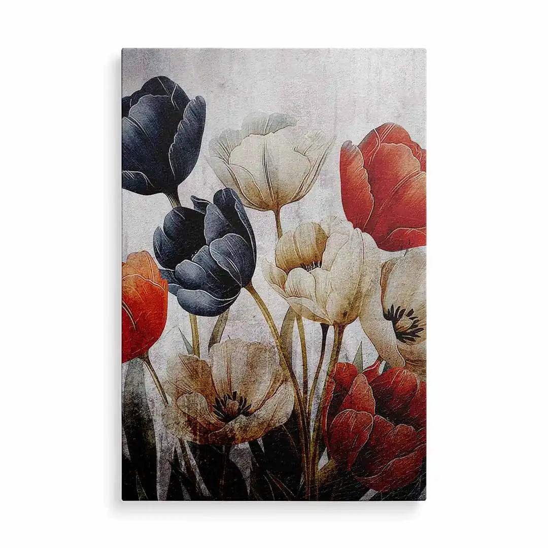 Obraz na płótnie - Bukiet czerwonych, białych i granatowych tulipanów na tle w stylu vintage