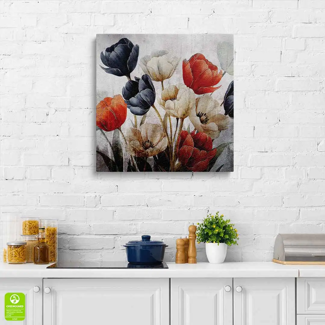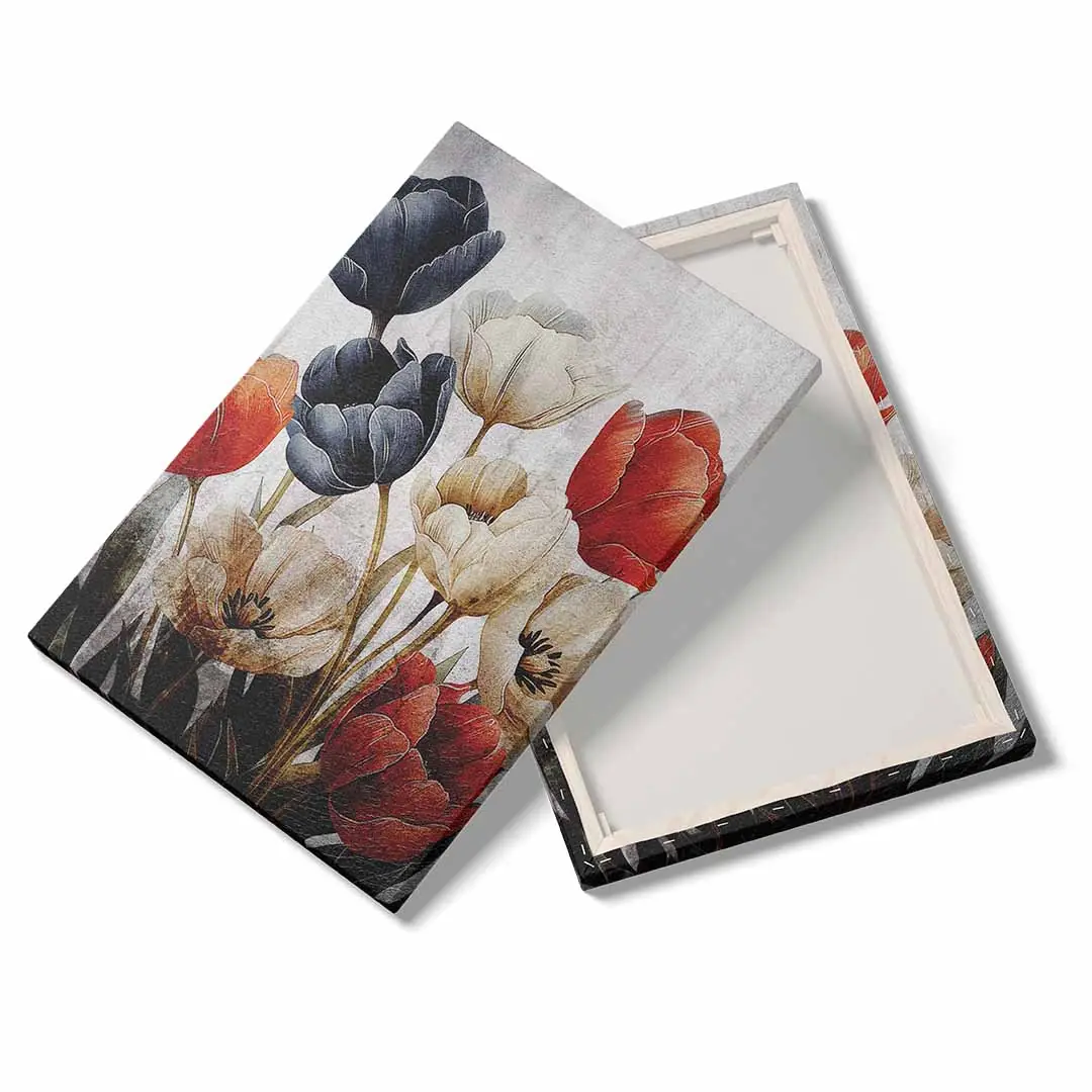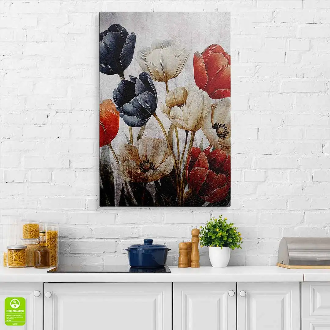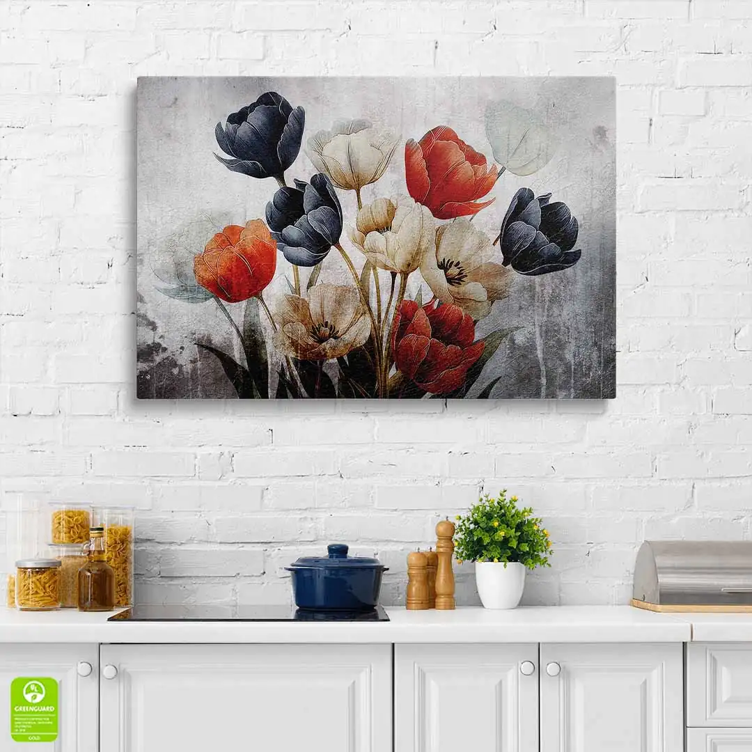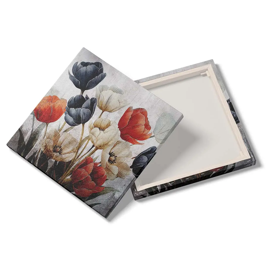 Obraz na płótnie - Bukiet czerwonych, białych i granatowych tulipanów na tle w stylu vintage
