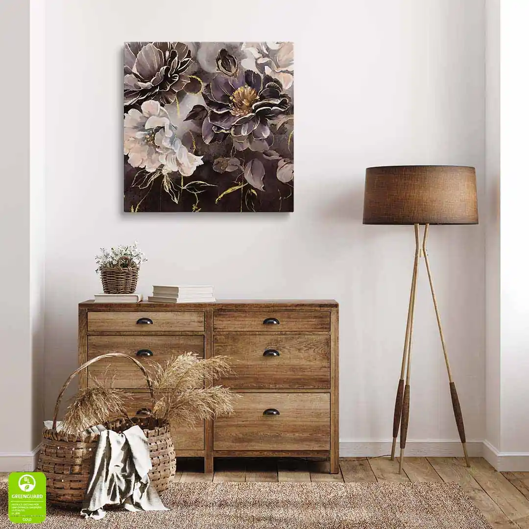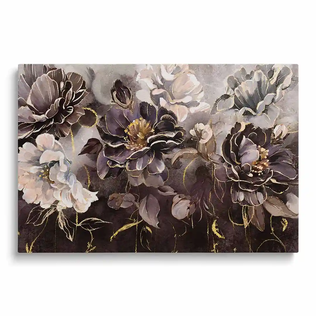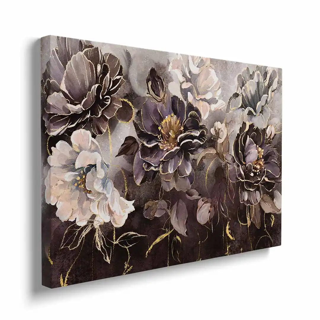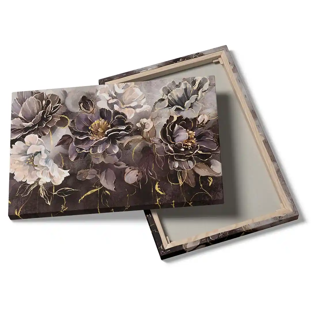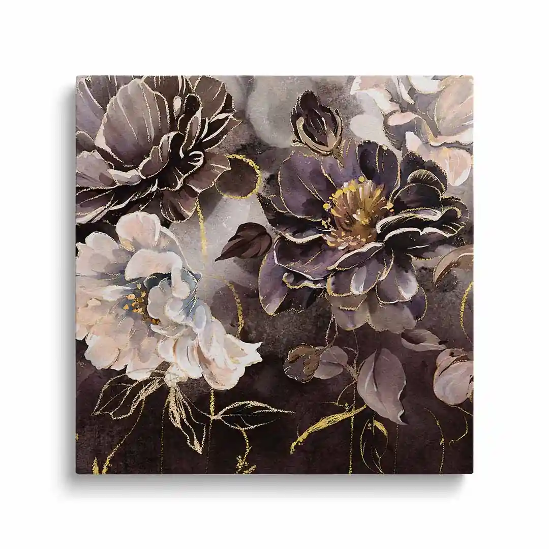 - techniką druku - proces drukowania wykorzystuje inne metody tworzenia kolorów (tzw. "przestrzeń barw") niż te, które stosowane są na ekranach komputera; kolory drukowane mogą wyglądać również nieco inaczej na różnych materiałach (np. canvasie, flizelinie, papierze czy szkle itp.) i przy użyciu różnych tuszy, w naszym przypadku tuszy do druku UV; złote elementy nie są wybiórczo metalizowane - efekt uzyskany jest poprzez wydruk tekstury w kolorze złota;