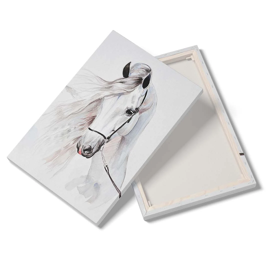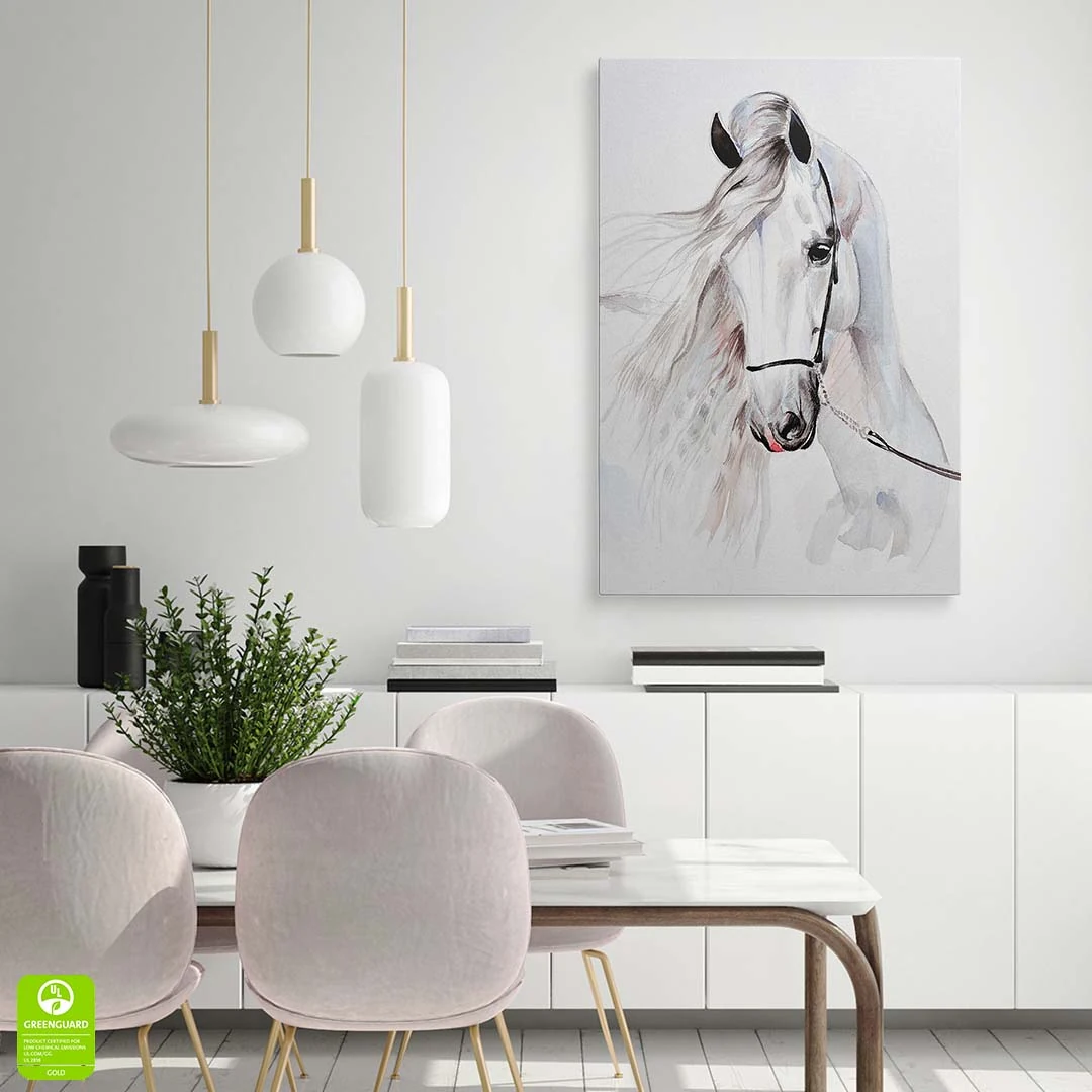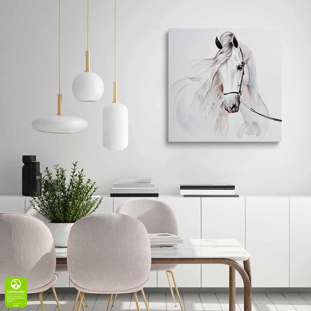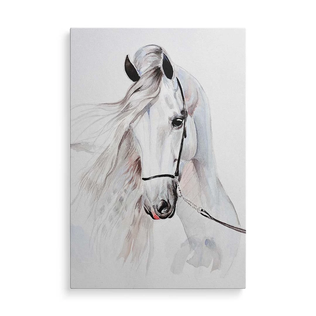 Obraz na płótnie - Dla dzieci piękny biały koń - to nasza propozycja dla dzieci i młodzieży lub po prostu dla miłośników tych wspaniałych zwierząt. Uroczy biały koń w formie dekoracji ściennej doskonale podkreśli zamiłowanie do zwierząt i estetyki wnętrza. Cały obraz utrzymany jest w jasnych barwach: tonacji bieli, szarości i dodatków czerni oraz różu delikatnie widocznego w pięknej grzywie konia. Obraz wprowadza atmosferę spokoju do wnętrza, możemy podziwiać naturalne piękno zdecydowanie zauważalne w tym obrazie. Obraz polecamy szczególnie do pokoju dziecięcego lub młodzieżowego, jednak nie wyłącznie. Bardzo ciekawie obraz może prezentować się w bardziej "dorosłym otoczeniu" - jadalni, sypialni czy kuchni. Ze względu na styl i barwy doskonale sprawdzi się w stylu skandynawskim czy klasycznym.