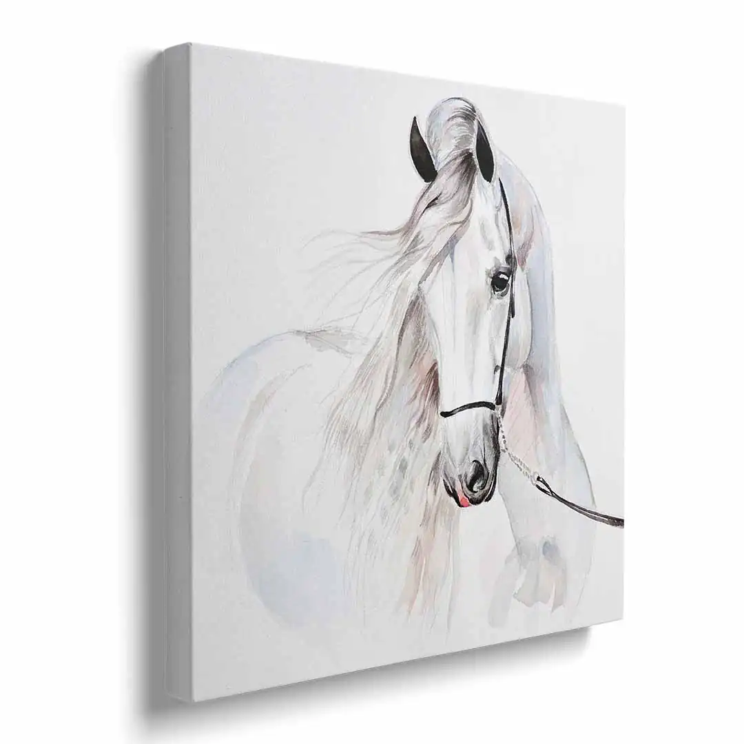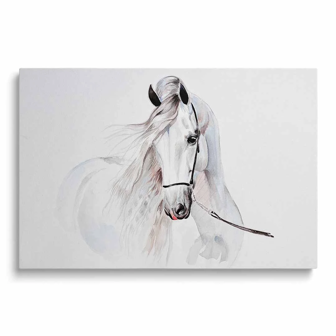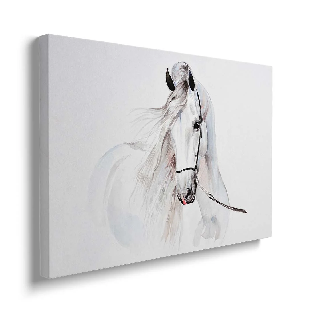 Obraz na płótnie - Dla dzieci piękny biały koń - to nasza propozycja dla dzieci i młodzieży lub po prostu dla miłośników tych wspaniałych zwierząt. Uroczy biały koń w formie dekoracji ściennej doskonale podkreśli zamiłowanie do zwierząt i estetyki wnętrza. Cały obraz utrzymany jest w jasnych barwach: tonacji bieli, szarości i dodatków czerni oraz różu delikatnie widocznego w pięknej grzywie konia. Obraz wprowadza atmosferę spokoju do wnętrza, możemy podziwiać naturalne piękno zdecydowanie zauważalne w tym obrazie. Obraz polecamy szczególnie do pokoju dziecięcego lub młodzieżowego, jednak nie wyłącznie. Bardzo ciekawie obraz może prezentować się w bardziej "dorosłym otoczeniu" - jadalni, sypialni czy kuchni. Ze względu na styl i barwy doskonale sprawdzi się w stylu skandynawskim czy klasycznym.