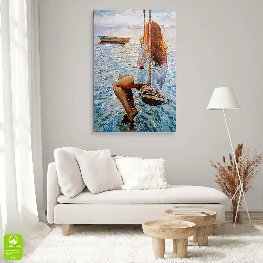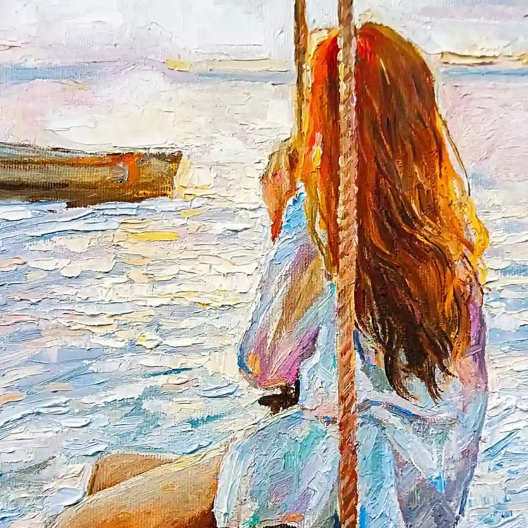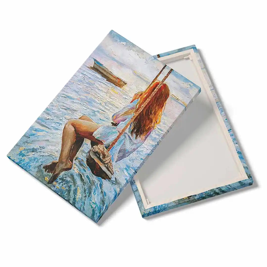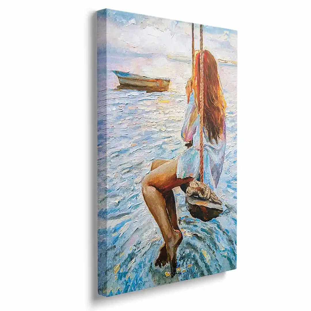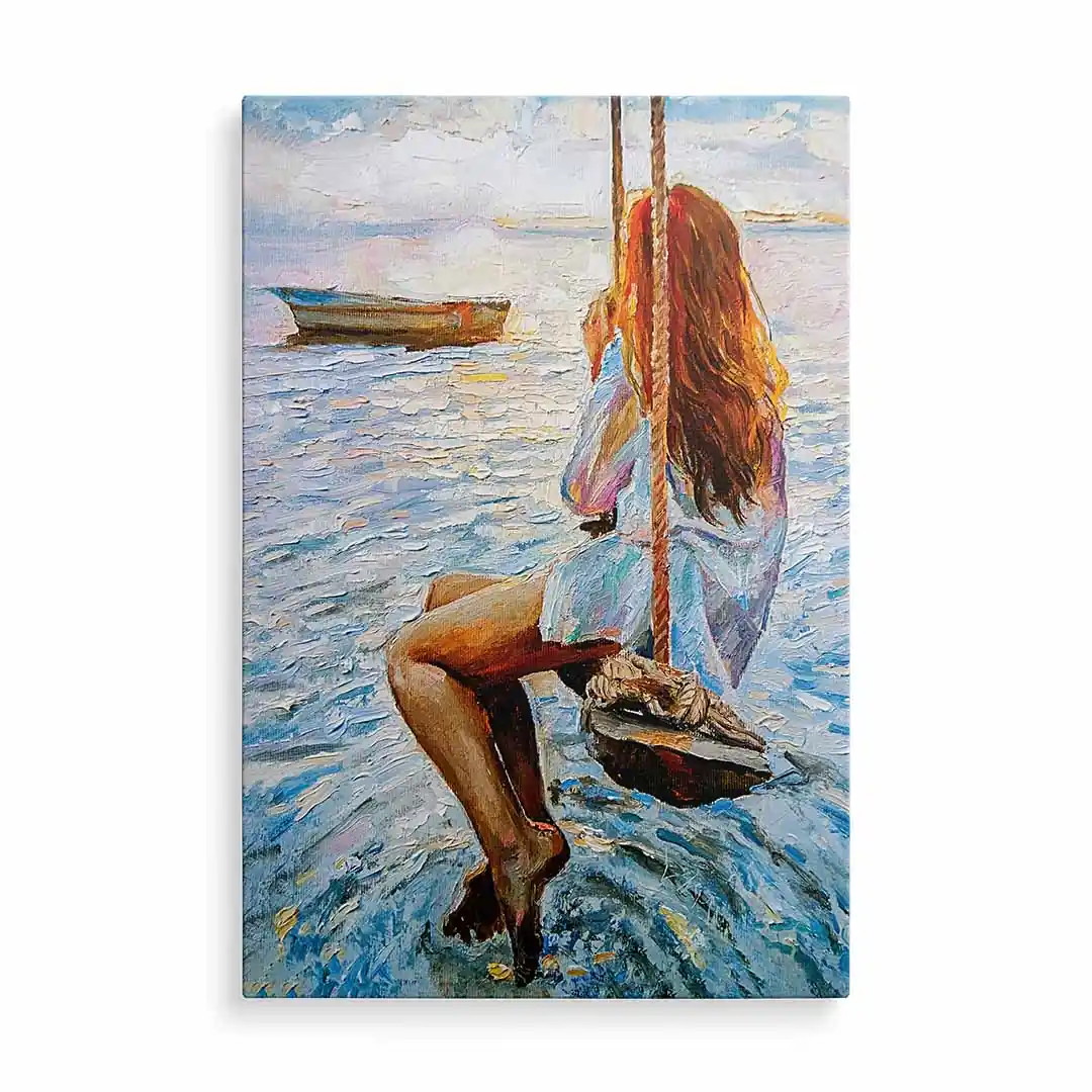 Obraz na płótnie - Dziewczyna na huśtawce - to zdecydowanie relaksująca propozycja do naszych wnętrz. Kojarzy się z wakacyjnym luzem, wypoczynkiem i relaksem. Miło byłoby budzić się z rana i patrzeć na tak błogi widok! Pierwszy plan tego obrazu to portret młodej dziewczyny siedzącej na huśtawce z drewna. Huśtawka zawieszona jest tuż nad wodą. Dzień uchwycony jest zdecydowanie słoneczny. Uwagę zwracają pięknie mieniące się na słońcu długie, brązowe, rozpuszczone włosy dziewczyny i ubranie z białej koszuli, podkreślające wakacyjny moment chwili. Obraz nie jest gładki, widoczne są tutaj pociągnięcia pędzlem, obraz wydaje się malowany farbami. Obraz na płótnie - Dziewczyna na huśtawce polecamy szczególnie do sypialni, chociaż pięknie będzie również prezentować się w innych pomieszczeniach w domu.