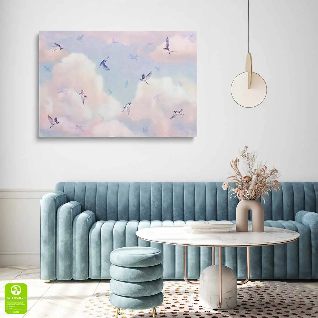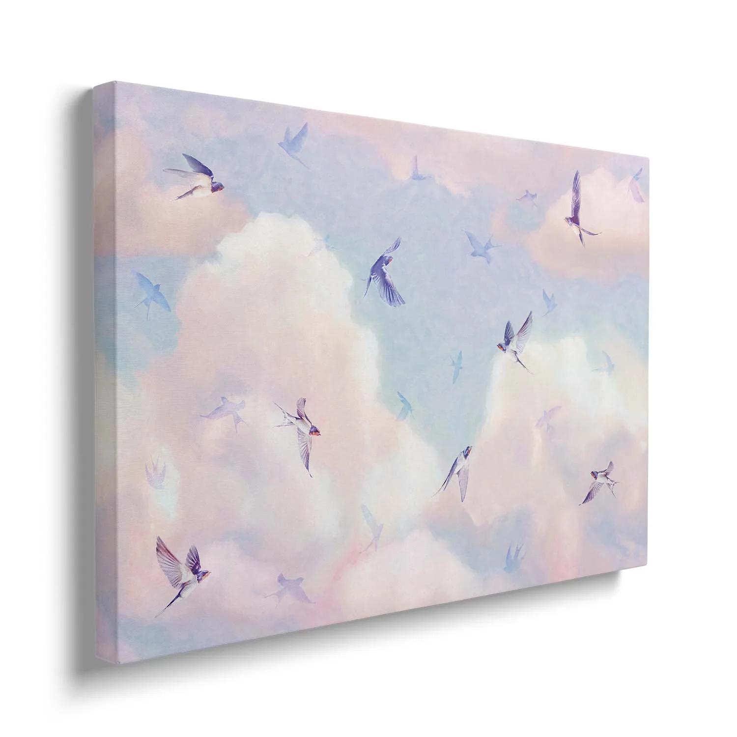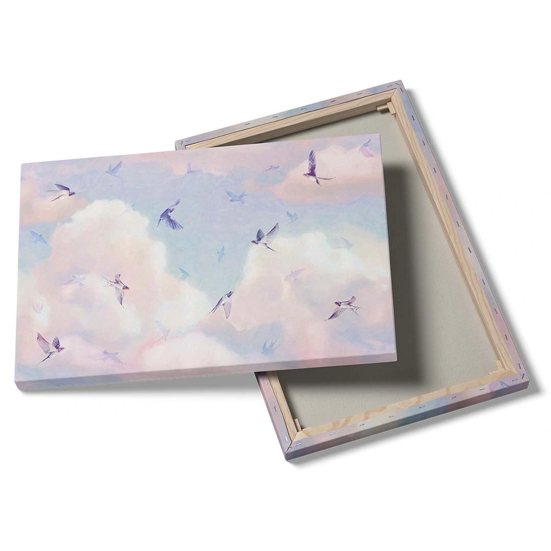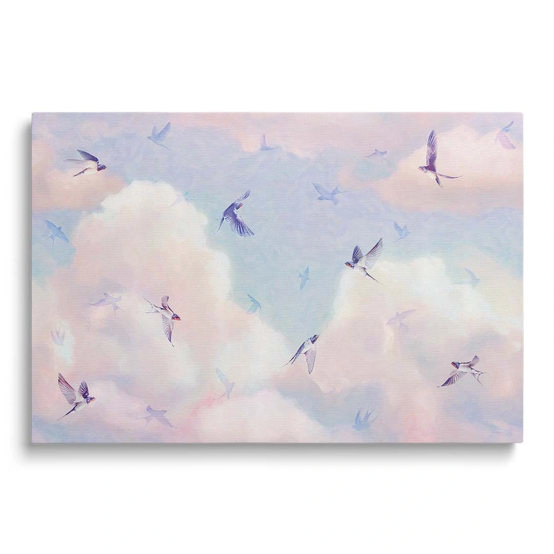 Obraz na płótnie - Jaskółki na tle kolorowego nieba to nasza propozycja, która z pewnością przypadnie do gustu osobom lubiącym marzyć w obłokach! Barwy tego wzoru to błękity, delikatne róże, odrobina bieli i koloru kremowego, które nadają temu wzorowi nieco bajkowego charakteru. A wszystko w pięknych pastelowych barwach. Znakomicie będzie prezentować się w różowych pokojach dziewczynek, jak i niebieskich, nawiązujących do barw nieba. Jaskółki na tym motywie prezentują się wyjątkowo delikatnie w locie, jakby "tańczyły w chmurach". Choć motyw sprawdzi się świetnie w pokojach dla dzieci, to nie wyklucza to wykorzystania go również w pomieszczeniach dla dorosłych. Szczególnie ciepło polecamy osobom lubiącym delikatne, pastelowe wzory i dodatki raczej w stonowanych odcieniach kolorystycznych.