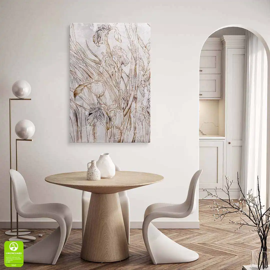 - techniką druku - proces drukowania wykorzystuje inne metody tworzenia kolorów (tzw. "przestrzeń barw") niż te, które stosowane są na ekranach komputera; kolory drukowane mogą wyglądać również nieco inaczej na różnych materiałach (np. canvasie, flizelinie, papierze czy szkle itp.) i przy użyciu różnych tuszy, w naszym przypadku tuszy do druku UV; złote elementy nie są wybiórczo metalizowane - efekt uzyskany jest poprzez wydruk tekstury w kolorze złota;