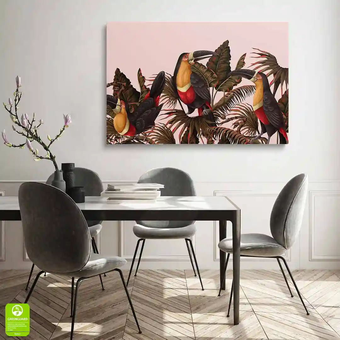Obraz drukowany jest przy wykorzystaniu nowoczesnej technologii druku Canon UVgel. Uzyskany jest efekt widocznego prawdziwego płótna malarskiego. Użyte tusze są ekologiczne, bezwonne oraz trwałe - odporne na blaknięcie oraz działanie promieni słonecznych UV. Certyfikowane atramenty spełniają najsurowsze światowe normy dotyczące niskiej emisji lotnych związków organicznych (VOC), co sprawia że nasze obrazy są całkowicie bezpieczne i mogą być z powodzeniem wykorzystywane jako elementy dekoracji wnętrz w domach i pomieszczeniach, gdzie ludzie a zwłaszcza dzieci i osoby narażone na szkodliwe związki, spędzają dłuższy czas. Odwzorowana jest fotograficzna jakość wydruku, a kolory są żywe i głęboko nasycone.