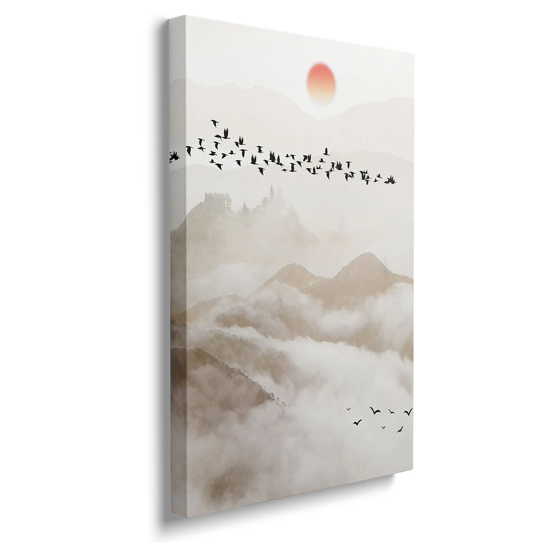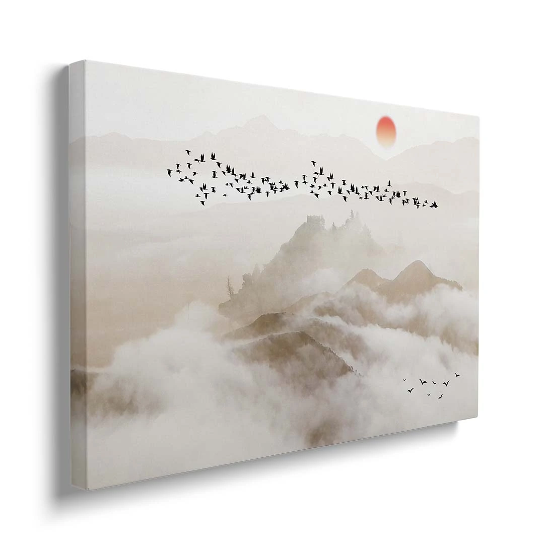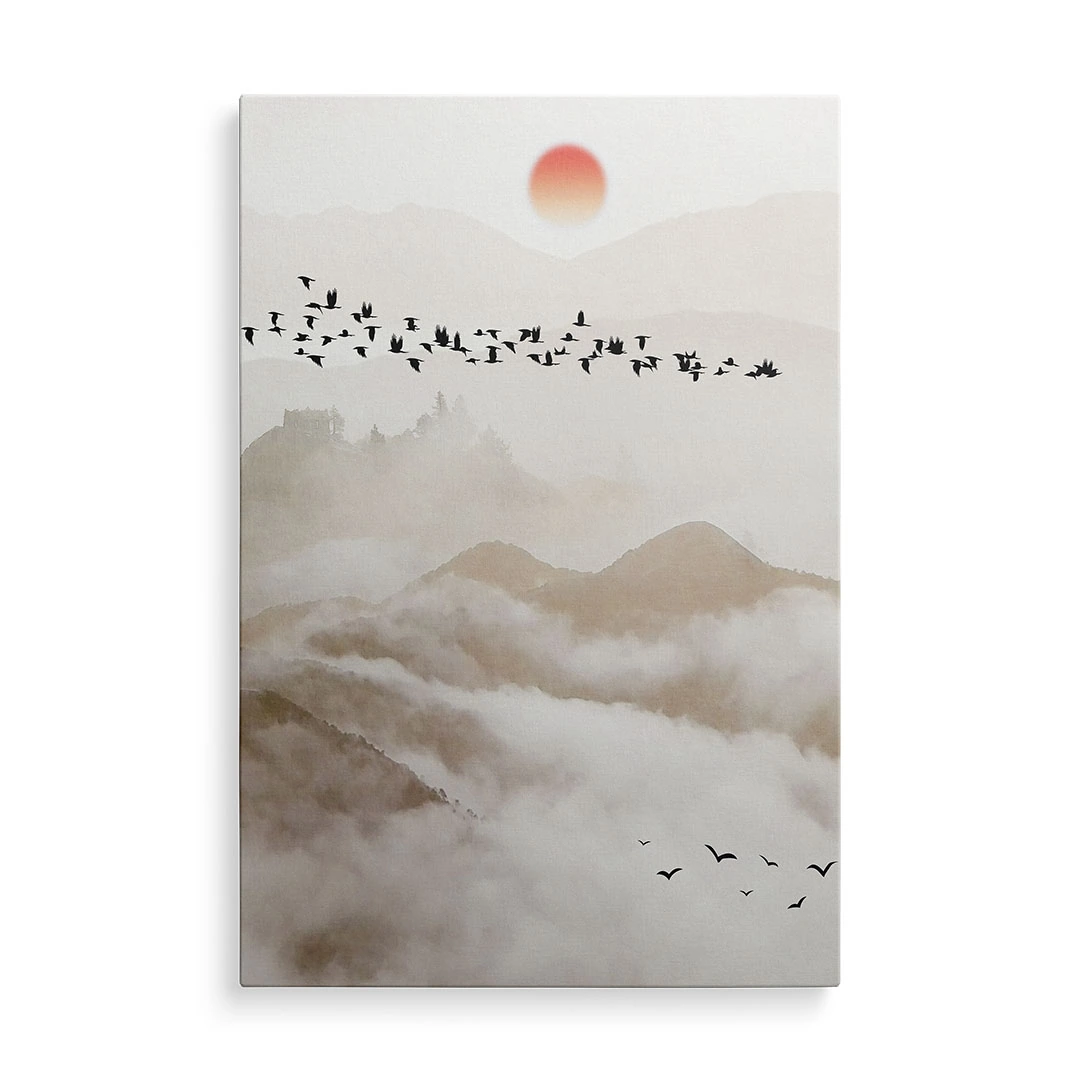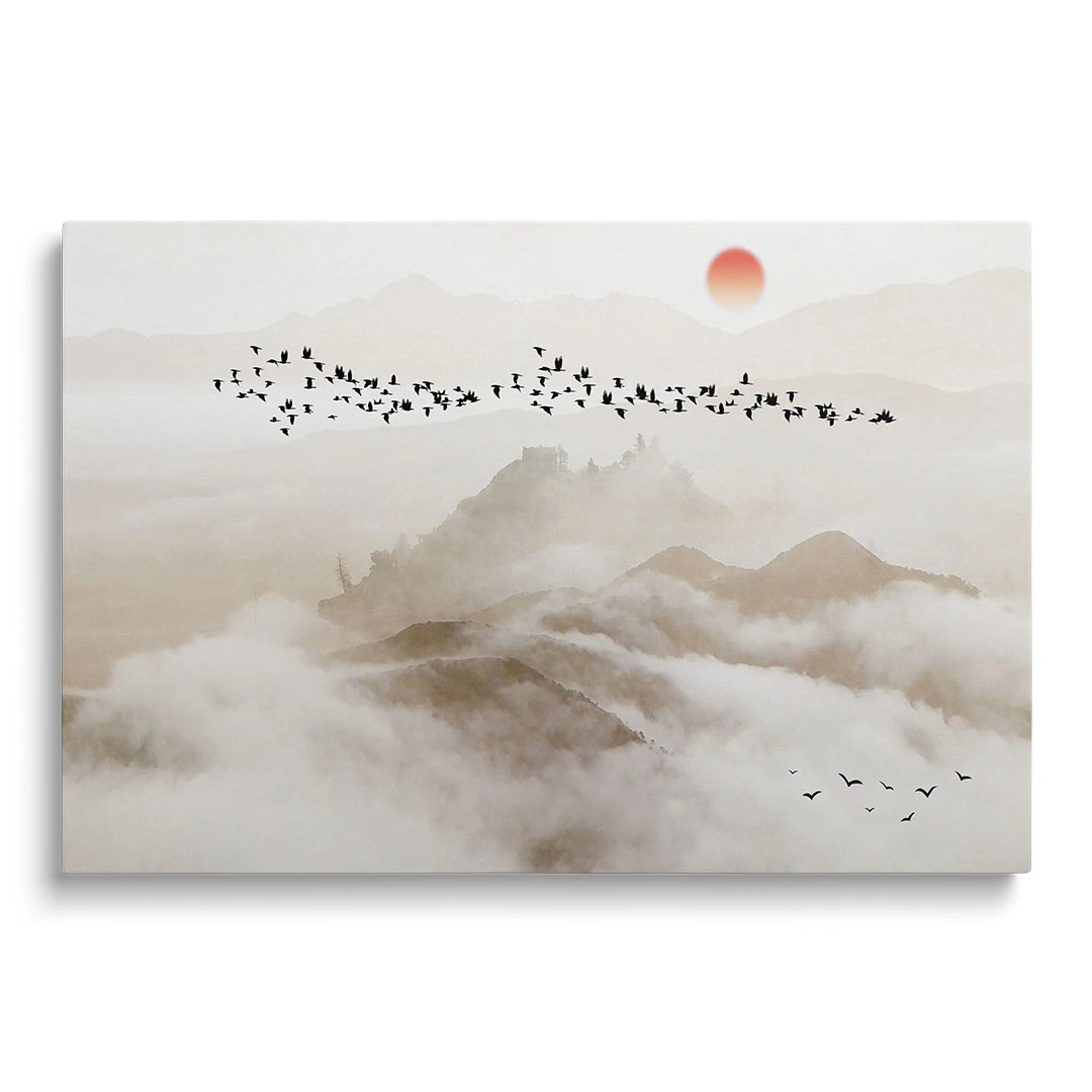 Obraz na płótnie - Pejzaż górski w odcieniach beżu z mgłą i ptakami