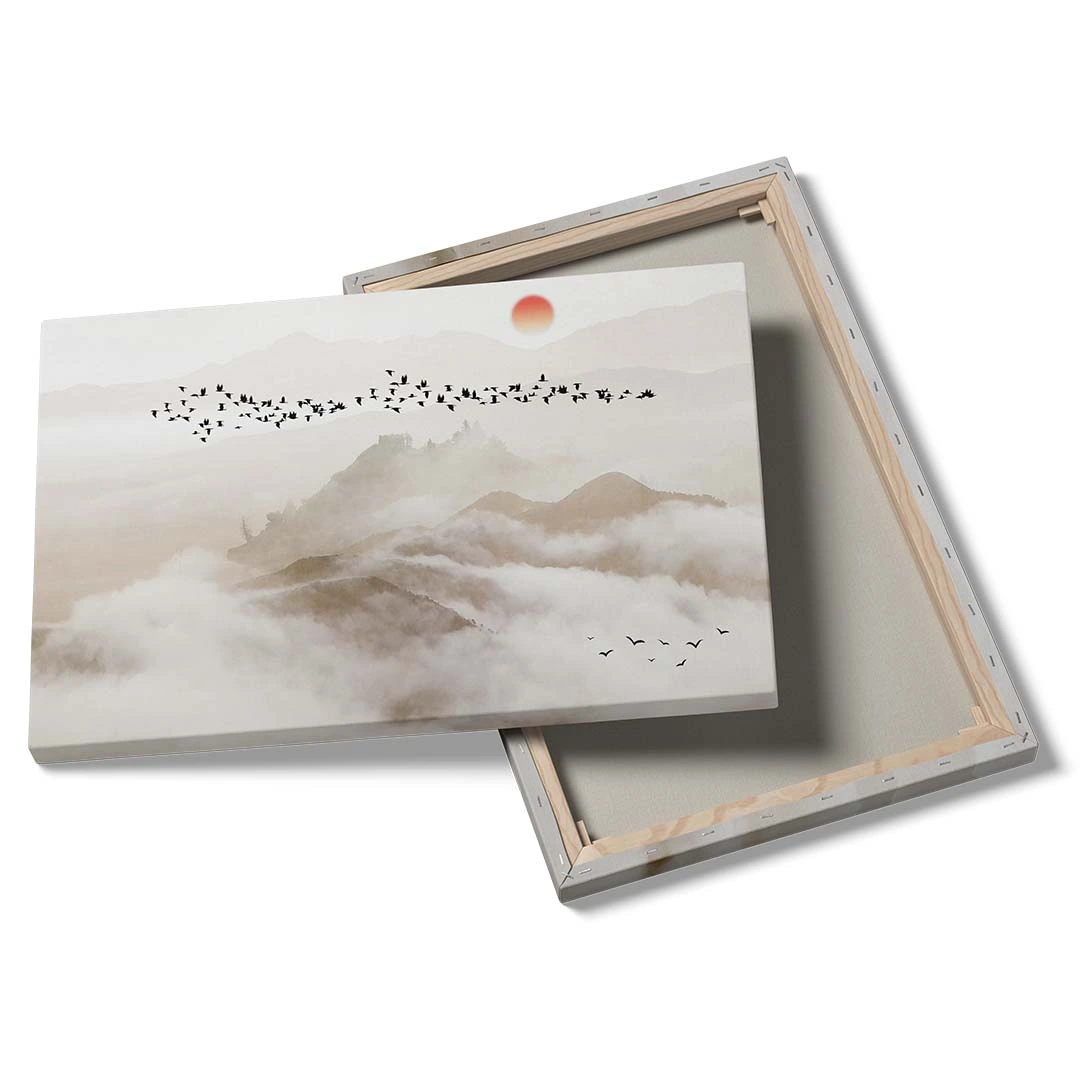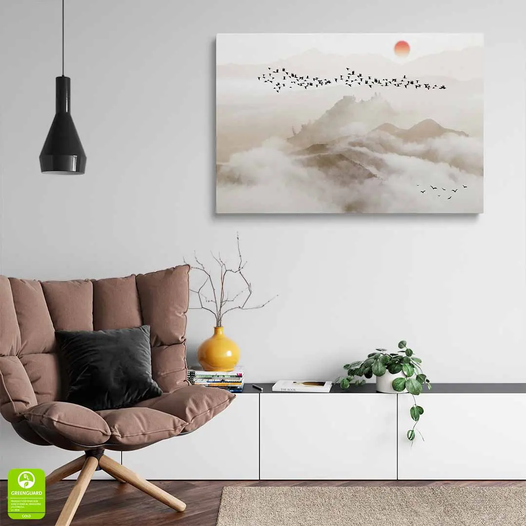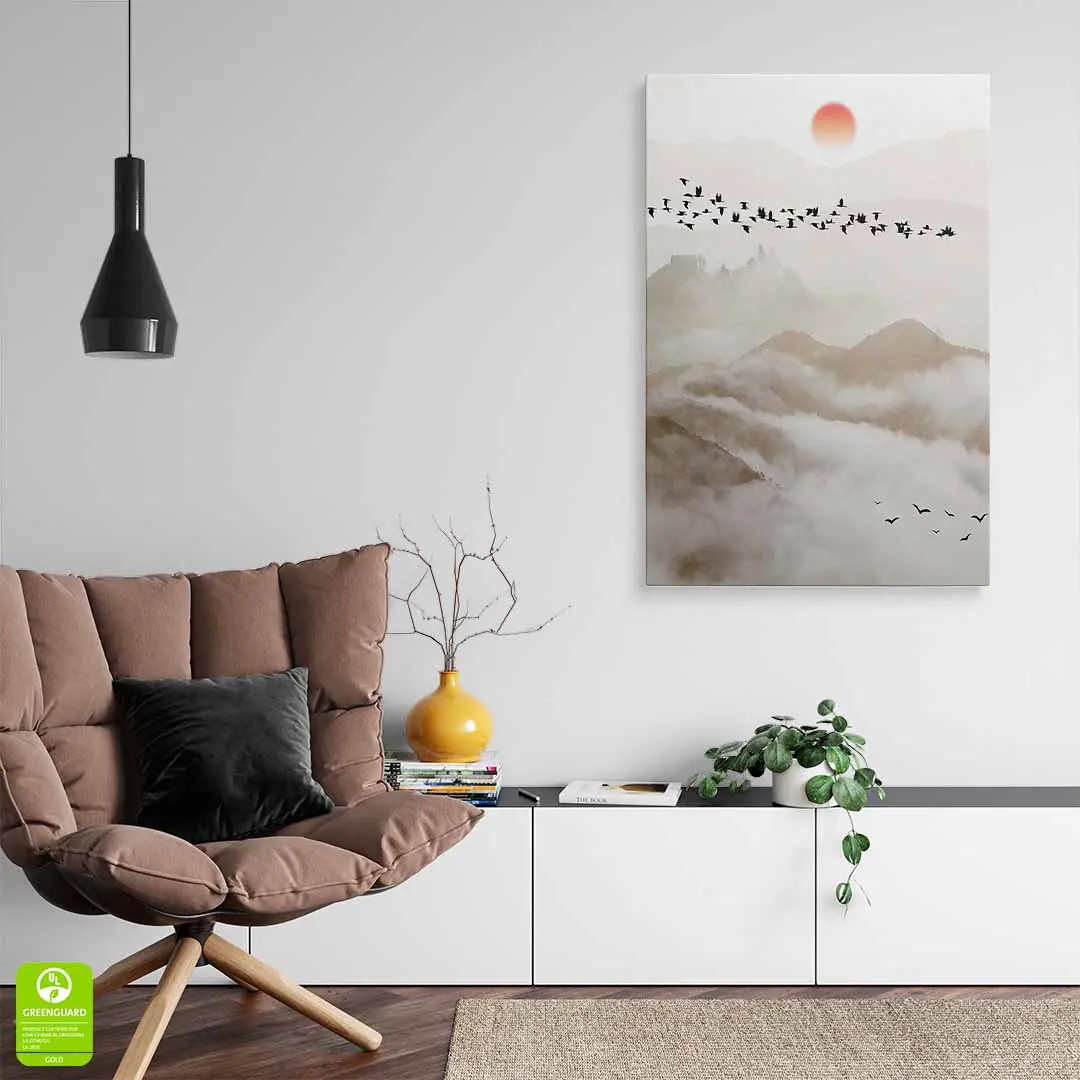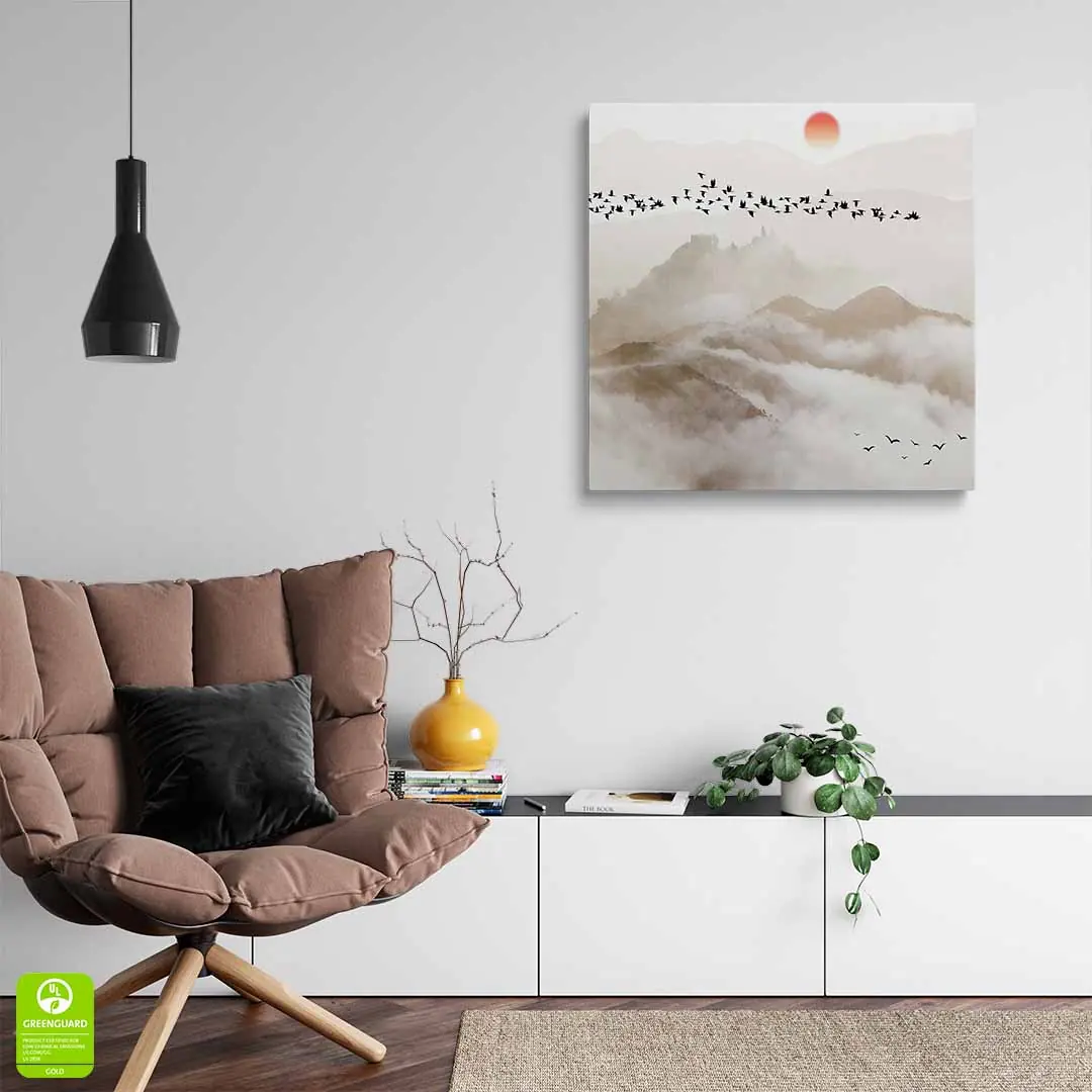 Obraz na płótnie - Pejzaż górski w odcieniach beżu z mgłą i ptakami
